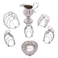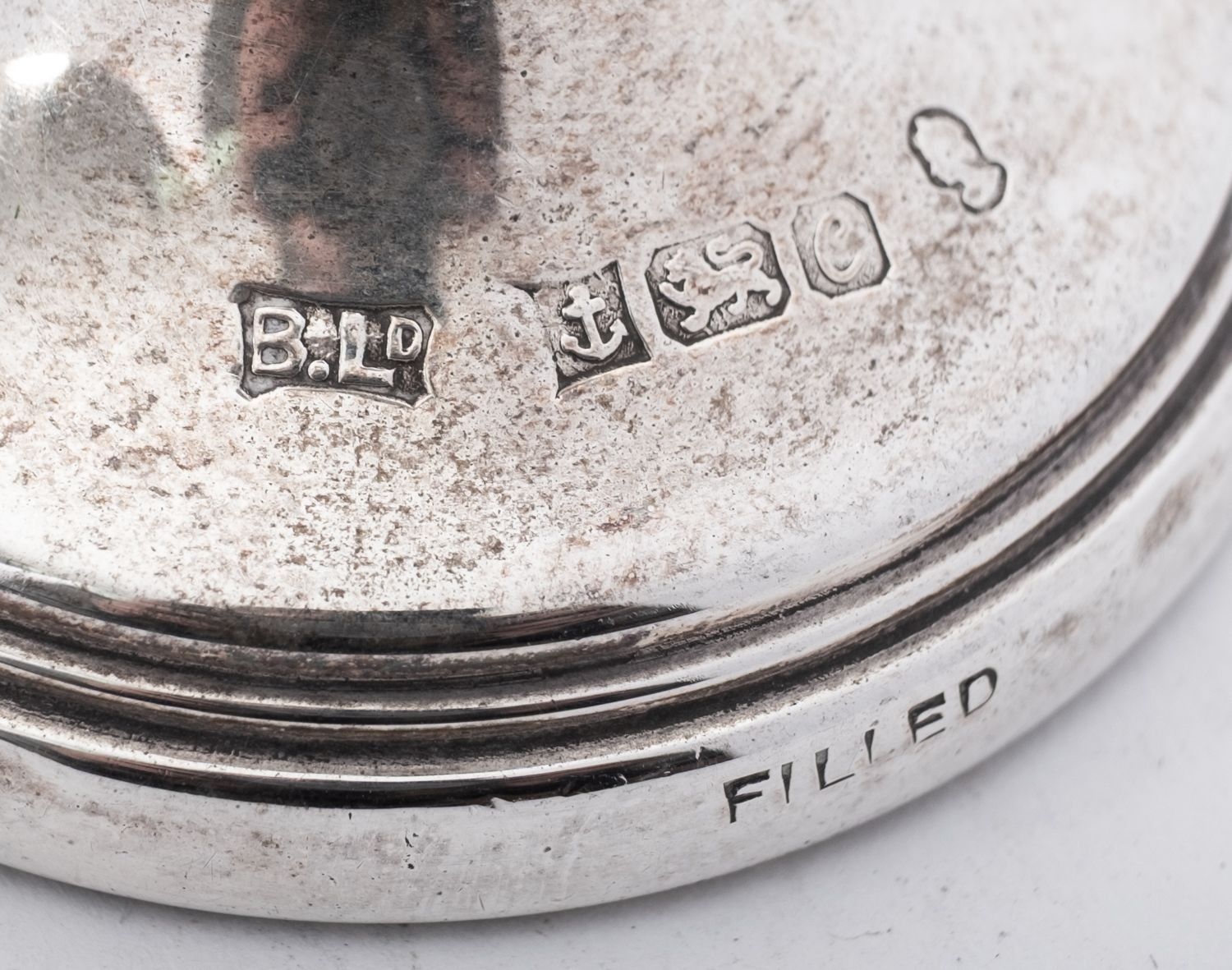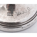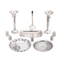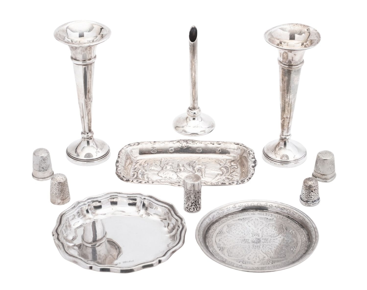 A small mixed lot of silver, to include a pair of spill vases (loaded), a specimen vase (loaded), an embossed pin tray, a shaped circular pin tray, a Far-Eastern pin tray, 3 thimbles and a cylindrical box, mixed makers & dates, together with a silver plated thimble; the spill vases 4.25'' (10.8cm) high; 5.5ozt weighable silver (11)