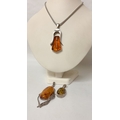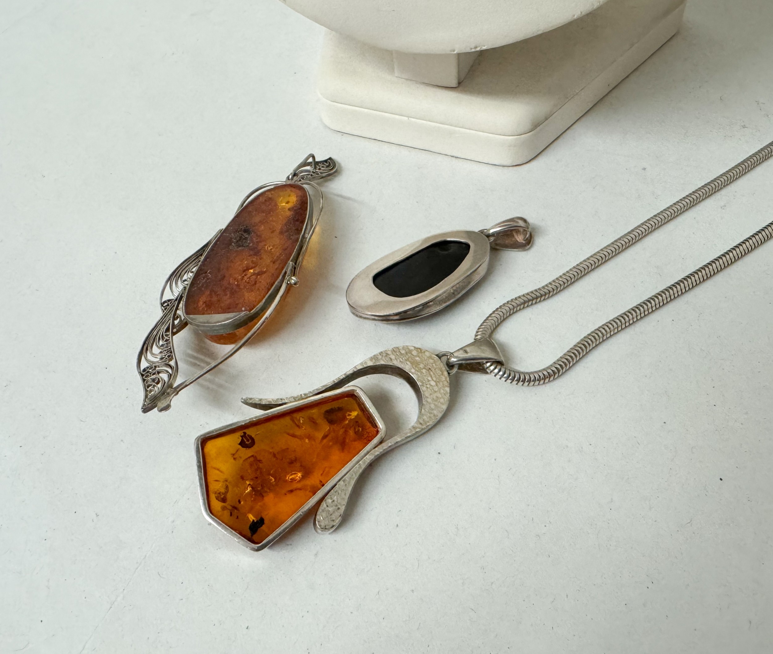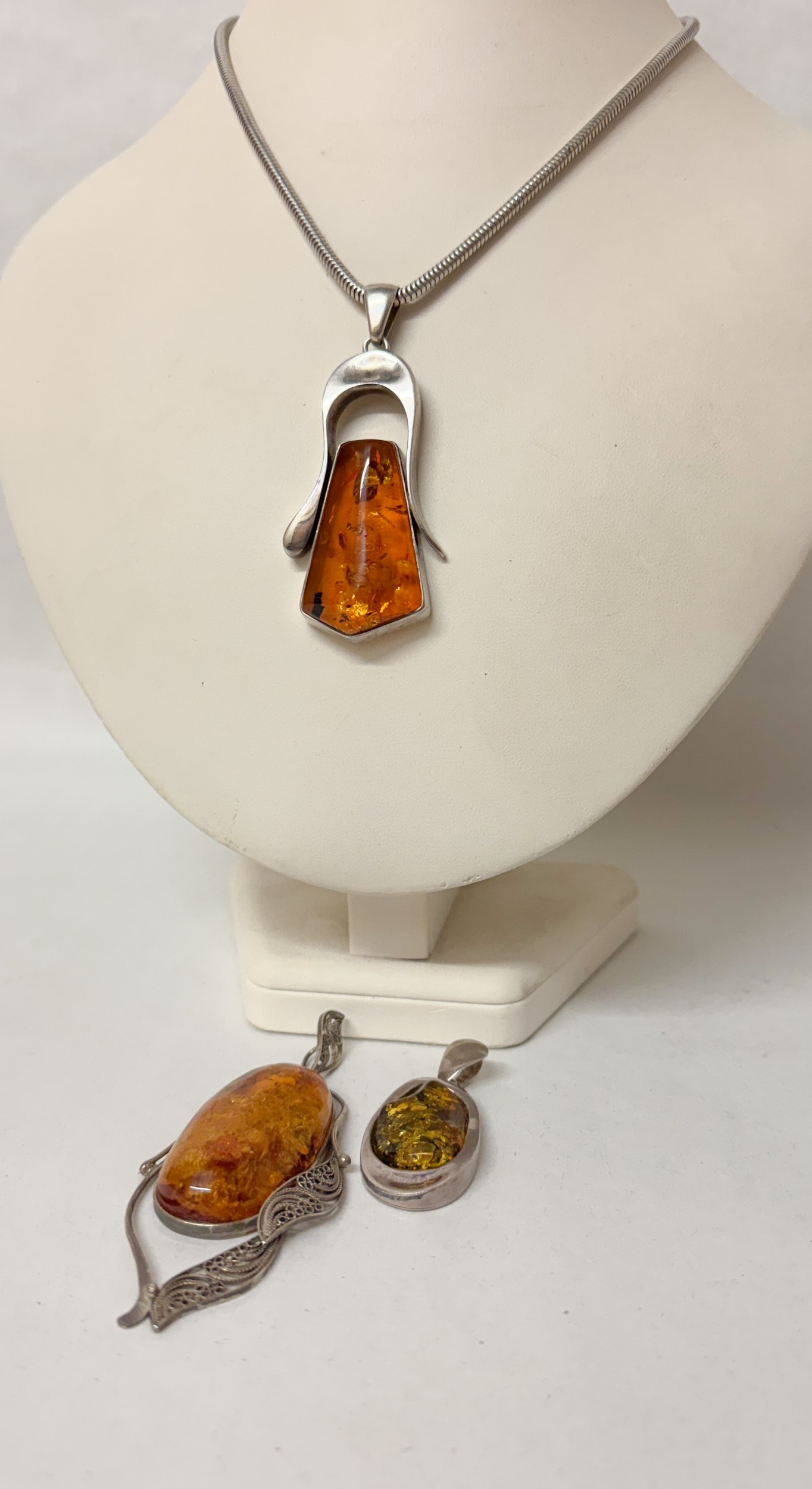 Three large amber statement pendants, set in silver with a silver snake link chain