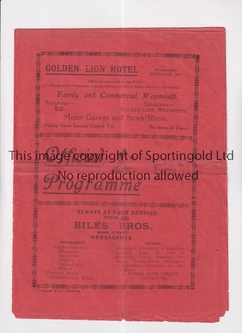 WEYMOUTH V NEWPORT COUNTY 1925 FA CUP Fold out 8 page programme for the tie at Weymouth 28/11/1925, folded in four and slightly worn at the bottom and on the spine. Fair to generally good