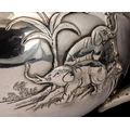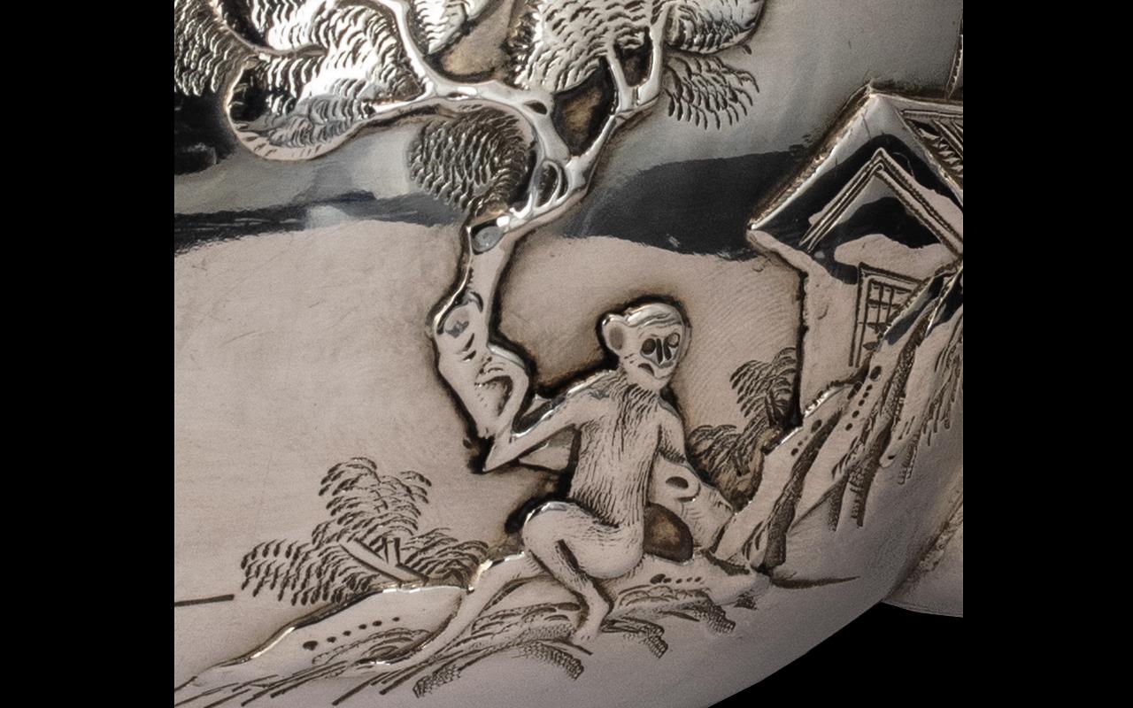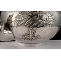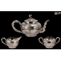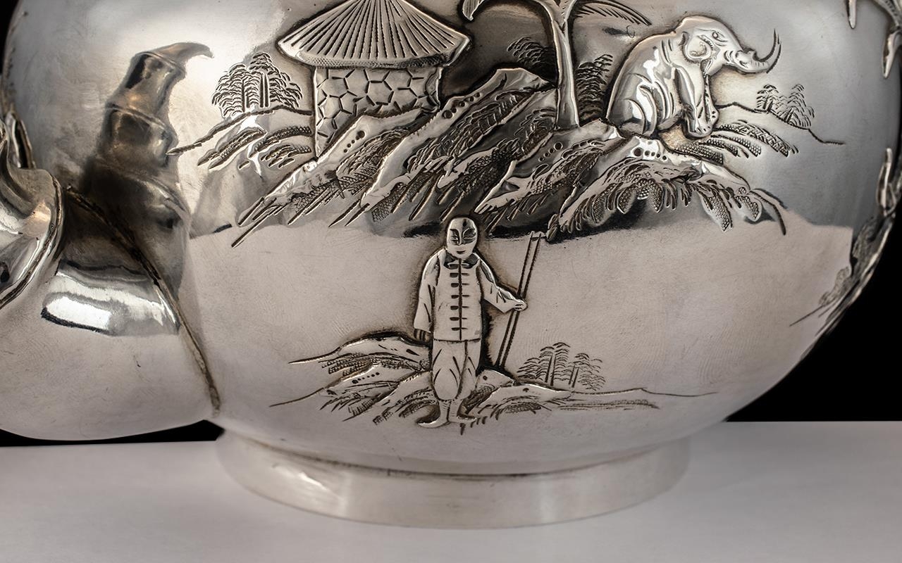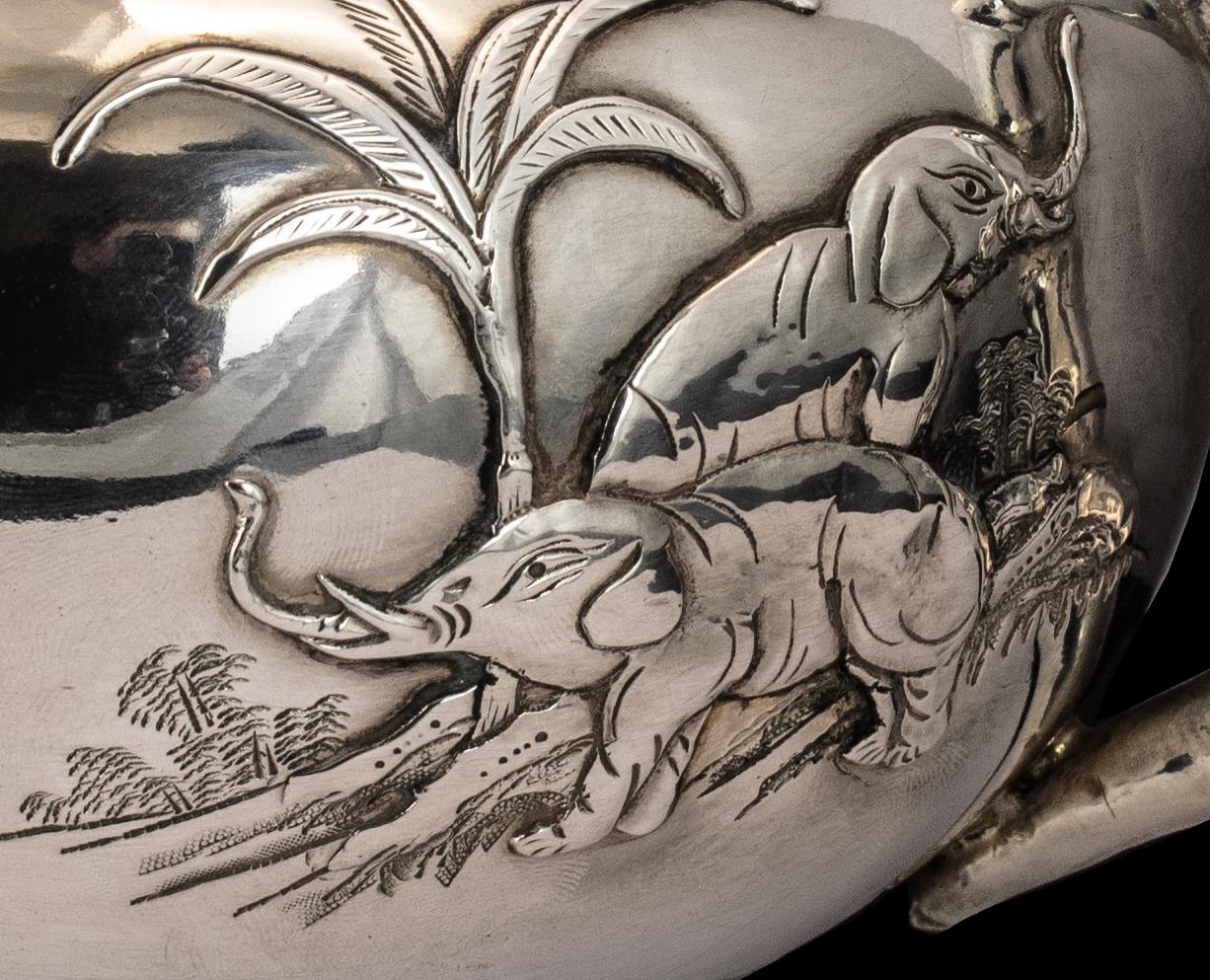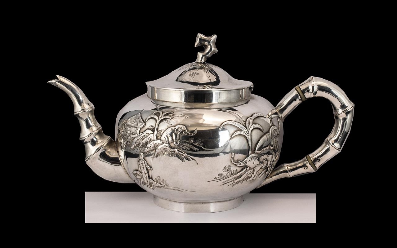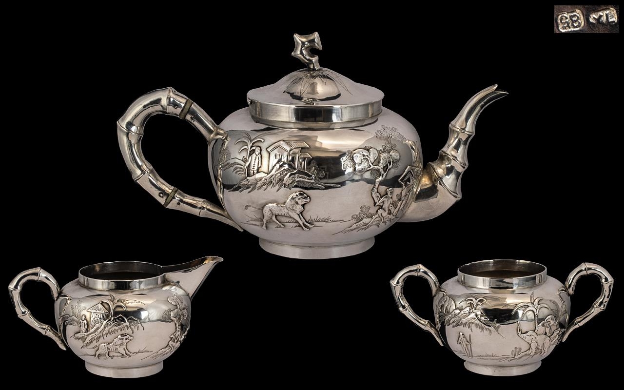 Chinese Export Superb Quality & Impressive Signed 3 Piece Silver Tea Service. Wonderful design, the Teapot decorated in high relief with images of figures with staffs, elephants, monkeys,wild cats, trees, huts. The handles and spout in the form of bamboo canes. Marked 850 for silver purity and Y L for maker's mark. Silver weight 861 grams approx 28 ozs. Size of Teapot - height 5.5'' - 13.75 cm. Width 10'' - 25 cm. All aspects of condition near mint condition. No issues regarding condition, please confirm with photo.