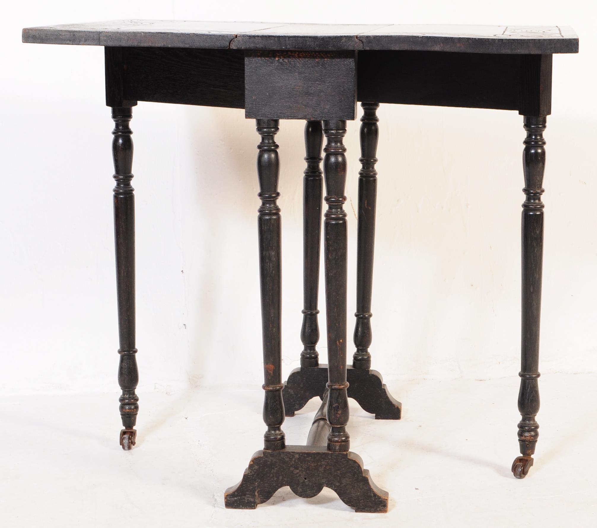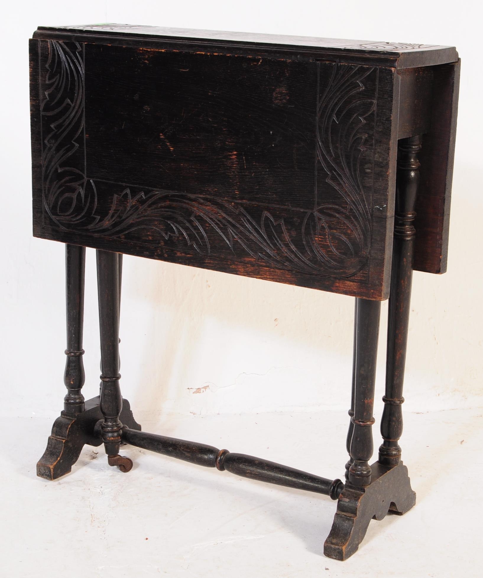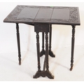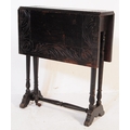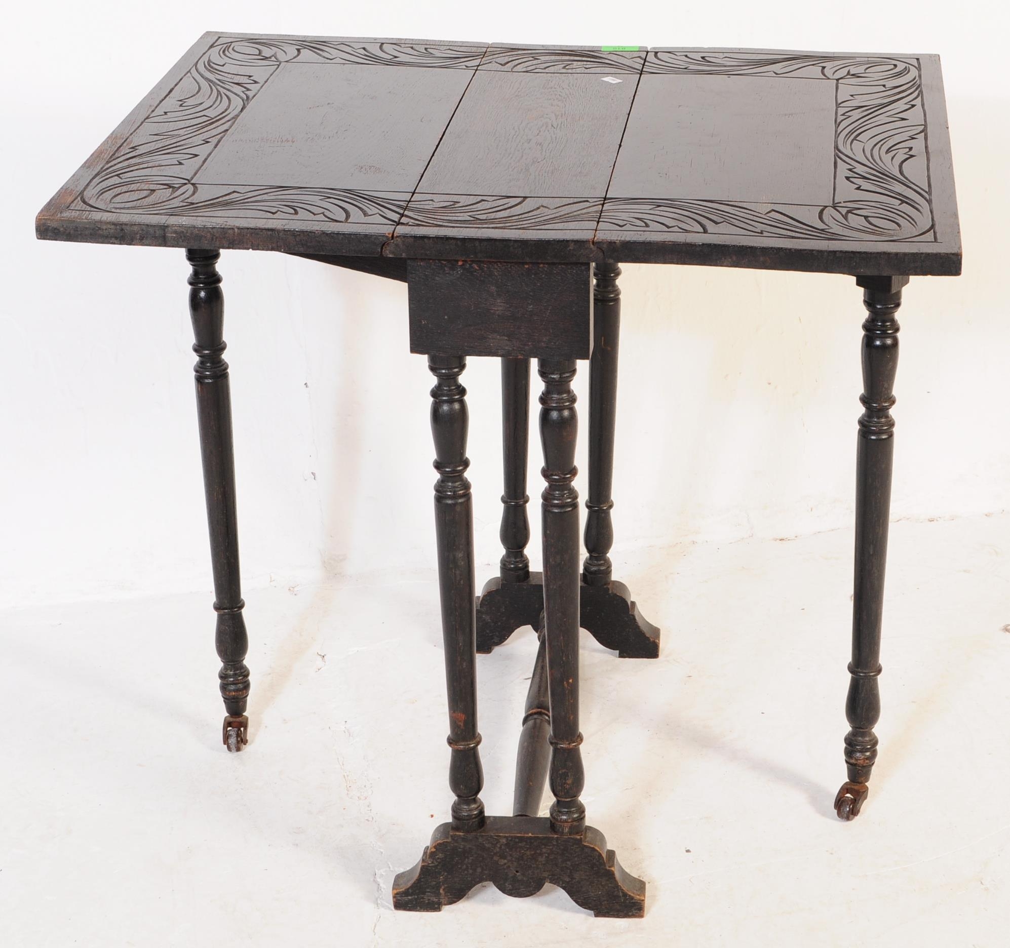 A Victorian 19th century carved oak Sutherland drop leaf table. Raised on turned legs with ebonised oak carved table top. Raised on a gate leg action