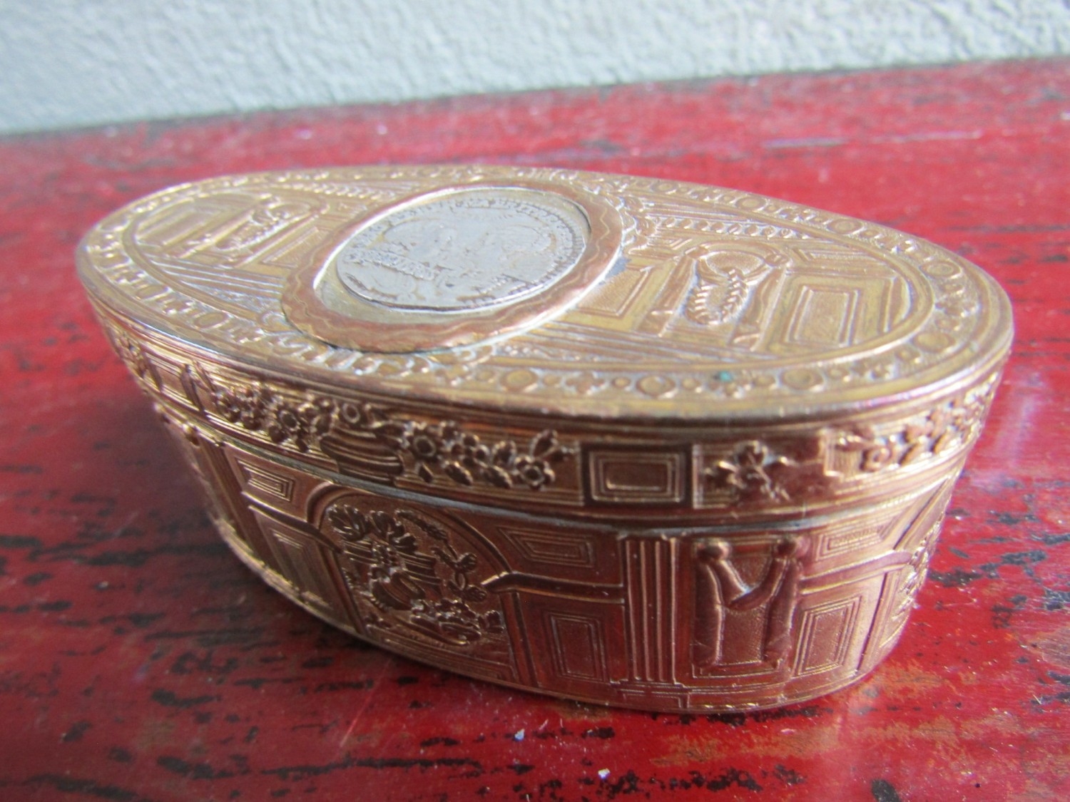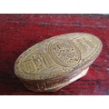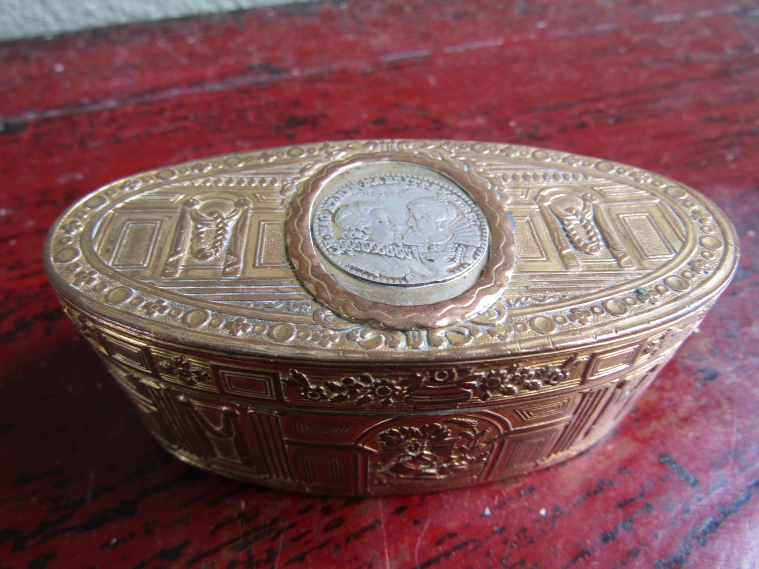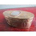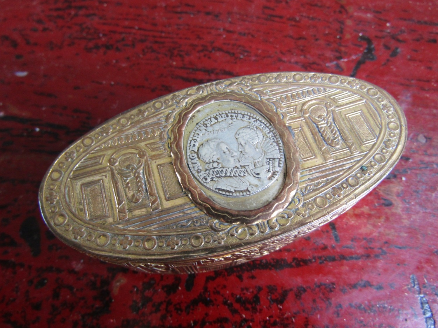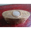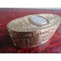 Gilded Silver Table Box Oval Form with Inset Medallion Hinged Cover Approximately 12cm Wide