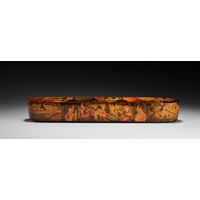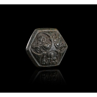 This pair of matching vessels is designed as small scent or snuff bottles. Each bottle features a compressed, globular body with deep vertical ribbing, creating a melon-like form. The construction includes a short, plain cylindrical neck and a domed lid decorated with radiating chased lines. Each lid is secured to the shoulder of the bottle by a simple link chain. The bottles rest on a short, plain circular foot. The metal exhibits a heavy dark patina and iridescent oxidation, characteristic of aged silver or a silver-toned alloy.