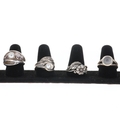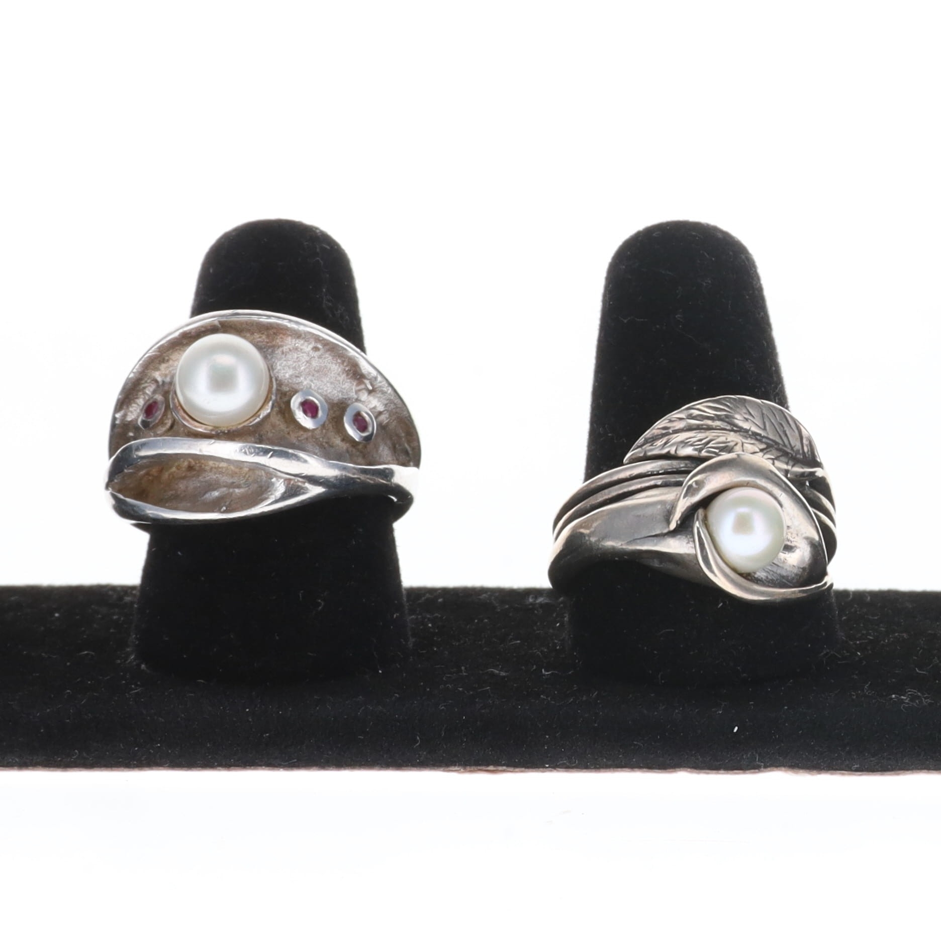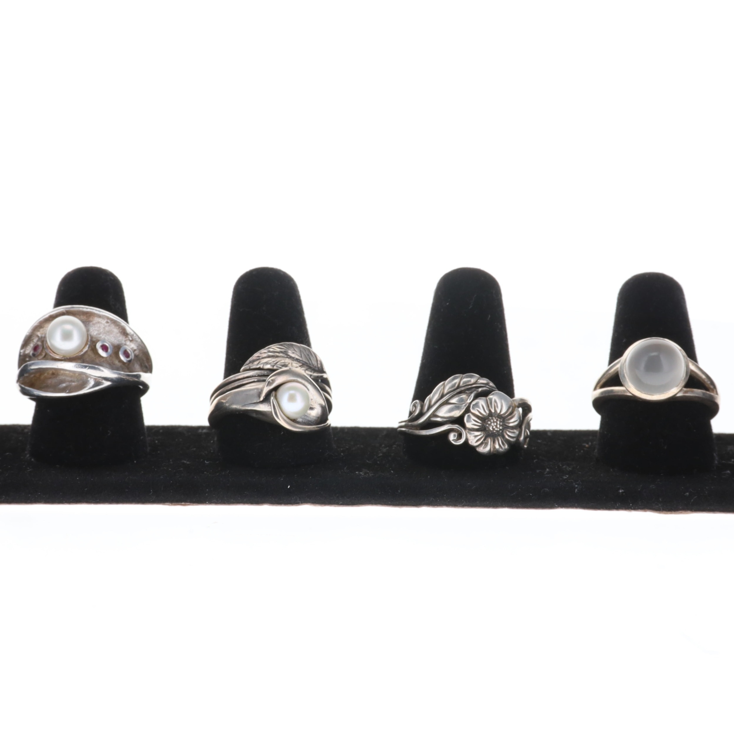 Silver Ring Collection incl. Cultured Pearl, Ruby, Floral. Each ring is stamped. Minimal band misshaping, all stones are intact with minimal surface wear. Weighs in total 25g.