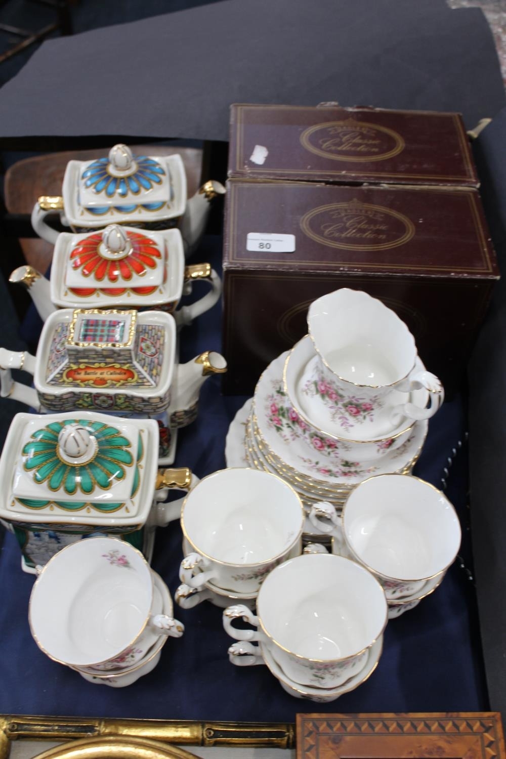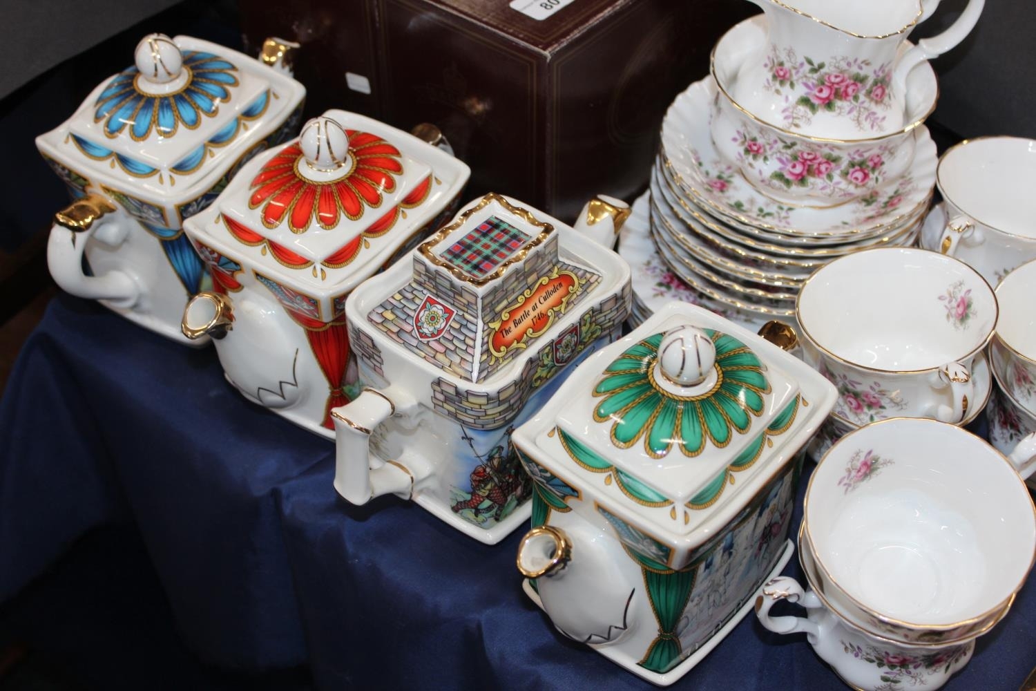 Four Sadler Collection novelty teapots: Hamlet, Romeo and Juliet, Bonnie Prince Charlie and Mid Summer Night's Dream, two boxed, and a Royal Albert Lavender Rose pattern part teaset.