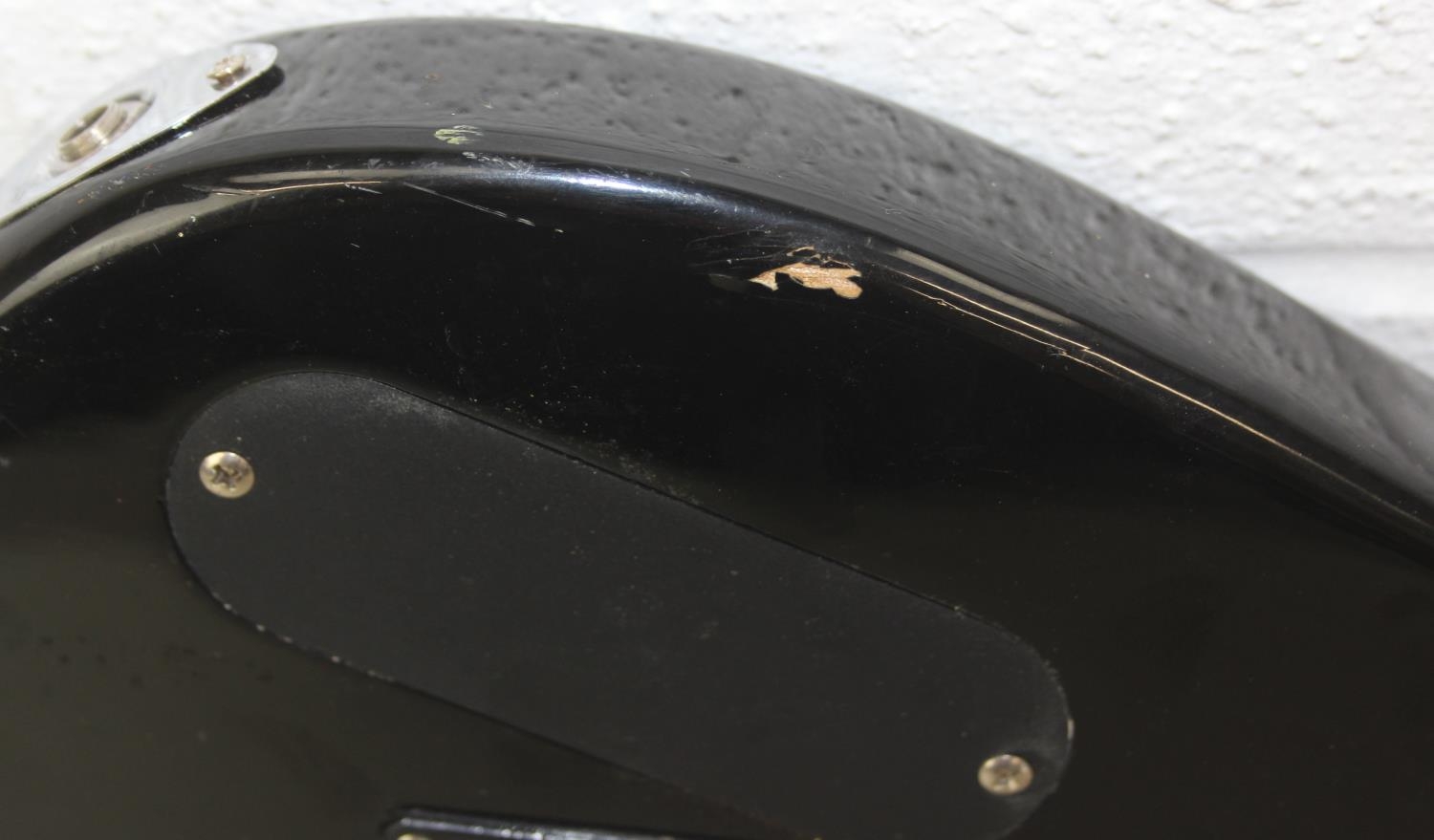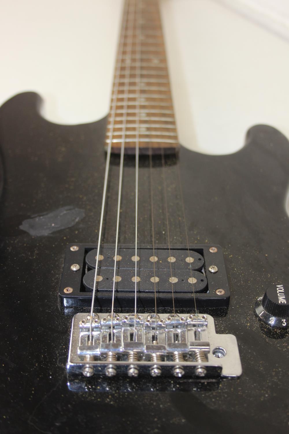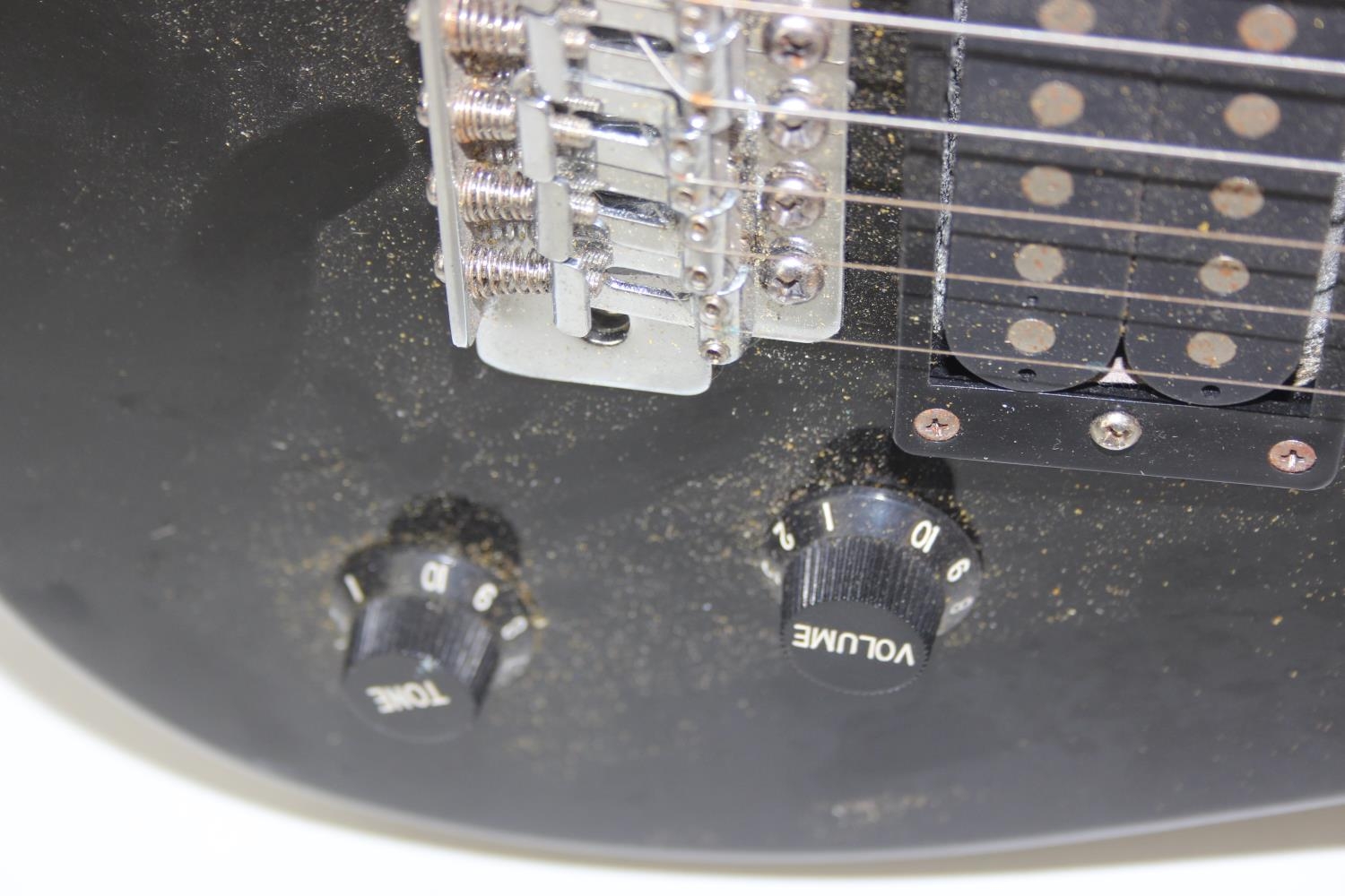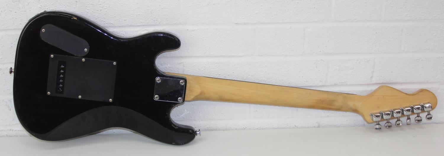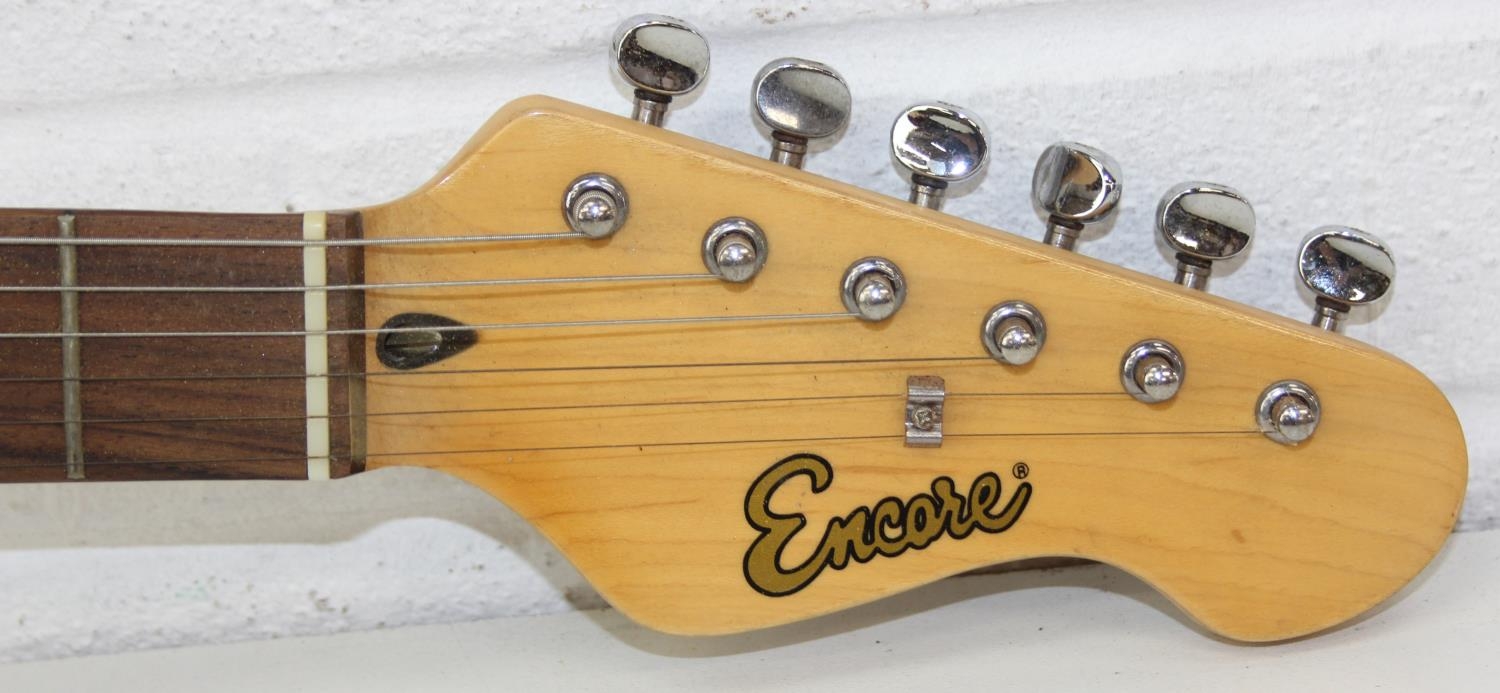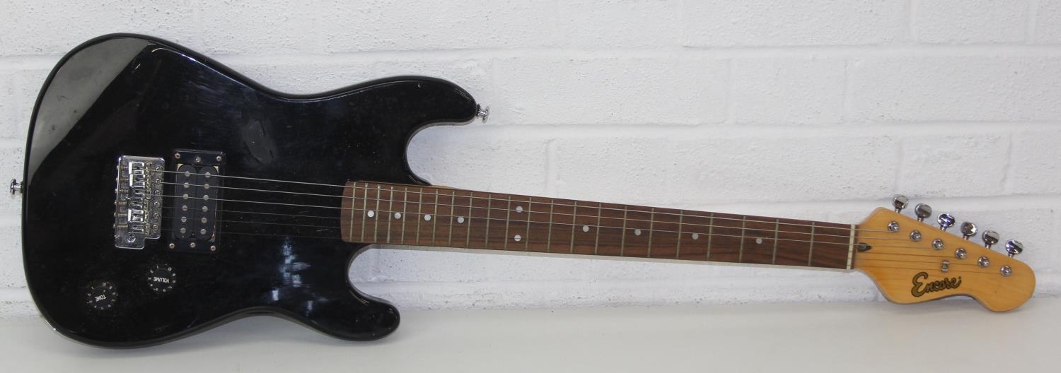 An Encore electric guitar with black body, 98cm long