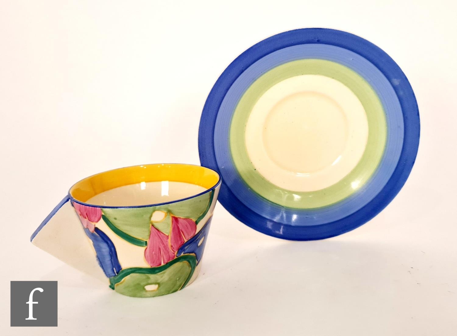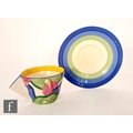 Clarice Cliff - Blue Chintz - A conical cup and saucer circa 1933, hand painted with stylised flowers and foliage with tonal blue and green banding, FANTASQUE and Bizarre mark.