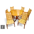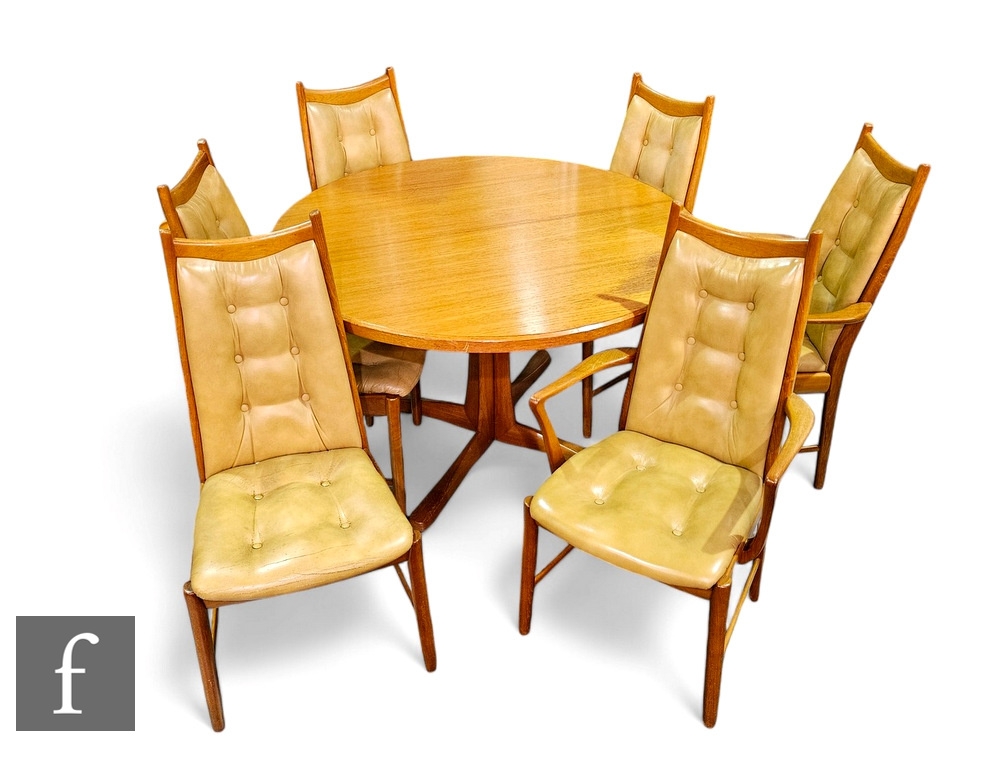 In the manner of Niels Otto Møller - A Danish mid century dining table and chairs, the teak circular pedestal table with two matched McKintosh leaves, and a set of tan leather dining chairs, including two armchairs and four dining chairs, stamped to underside 'Hojre' with Rosengarden stamped metal slide fittings, height 100cm. (7)