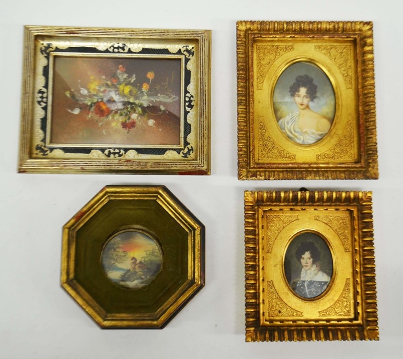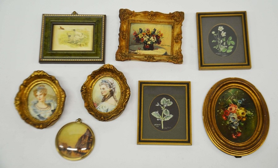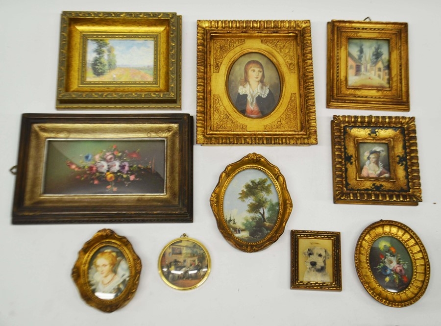 20th century school, a large selection of miniature oils and prints, including portraits, still life, landscapes (20)