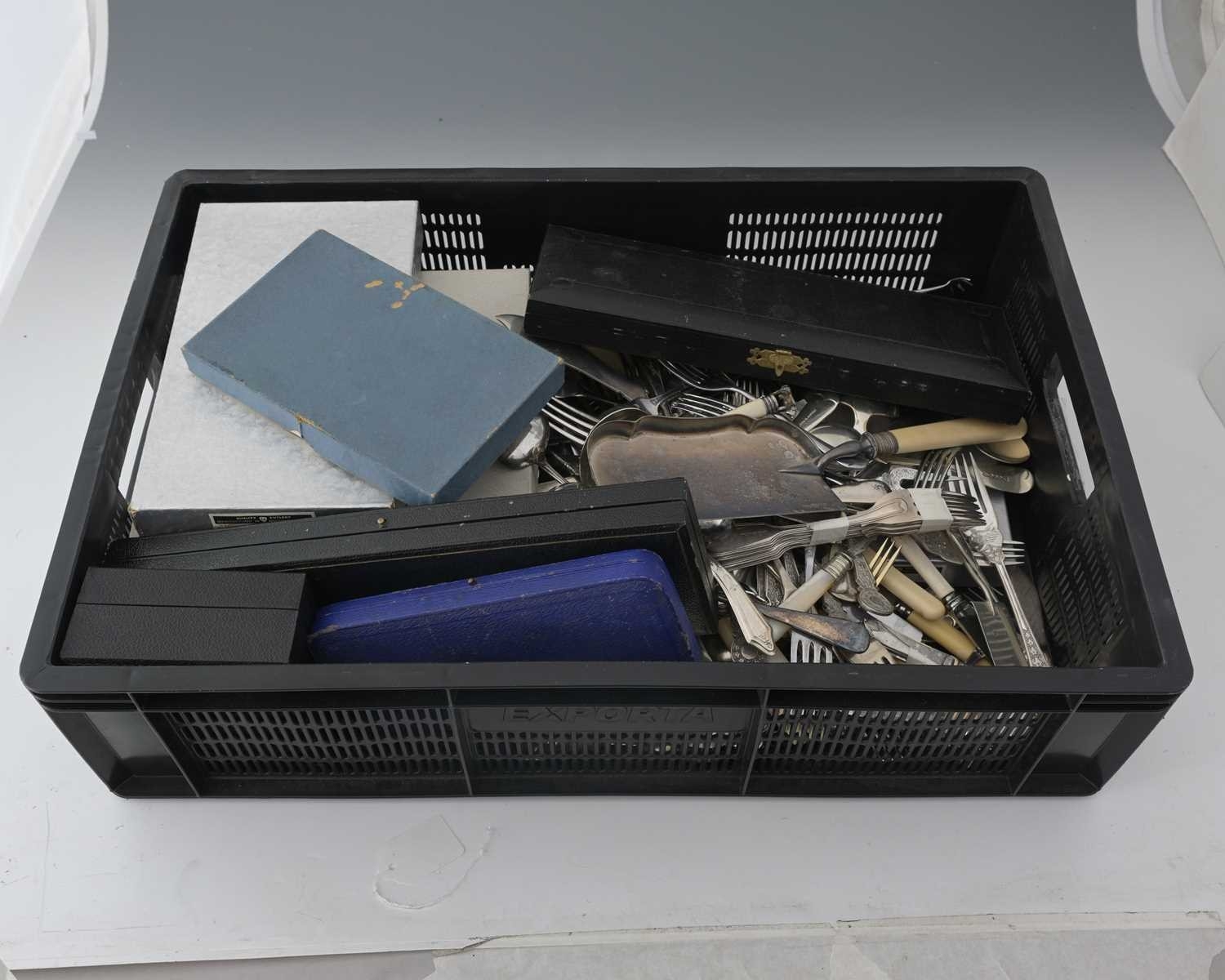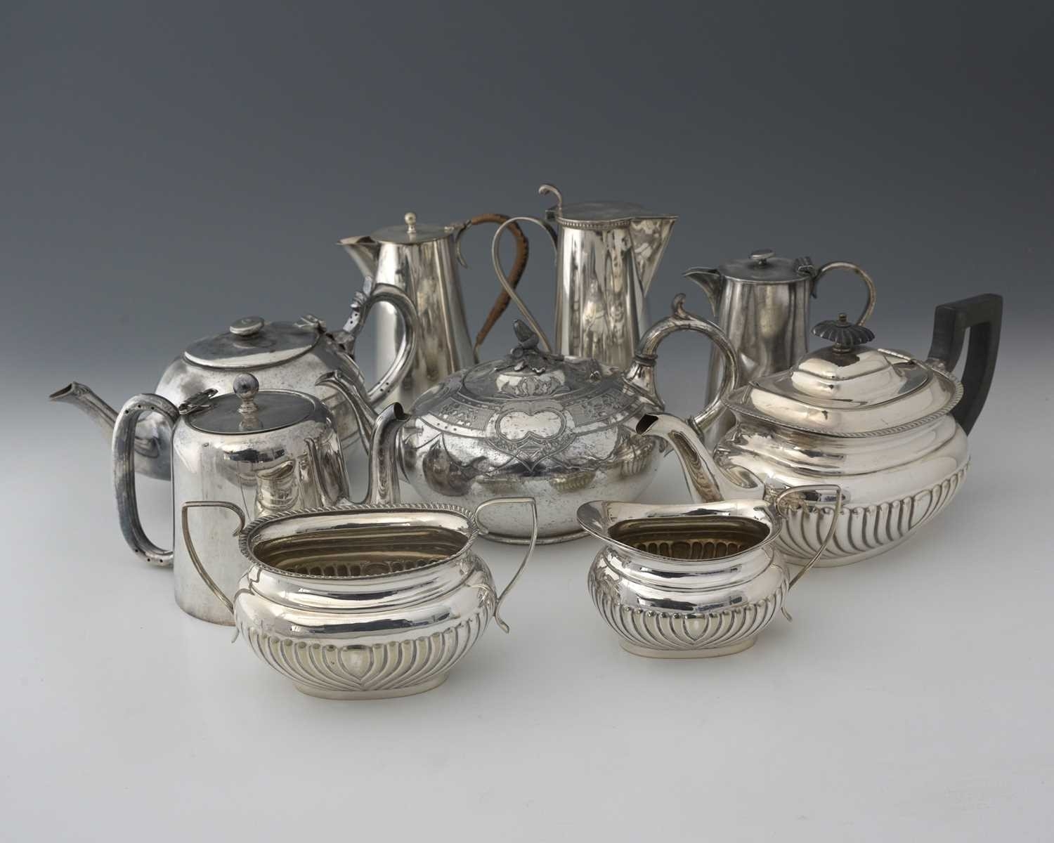A collection of plated items, twentieth-century and later, to include teapots, hot water jug, flatware, cased sets of serving utensils, & etc. (2)