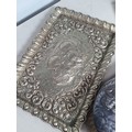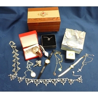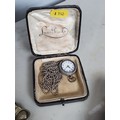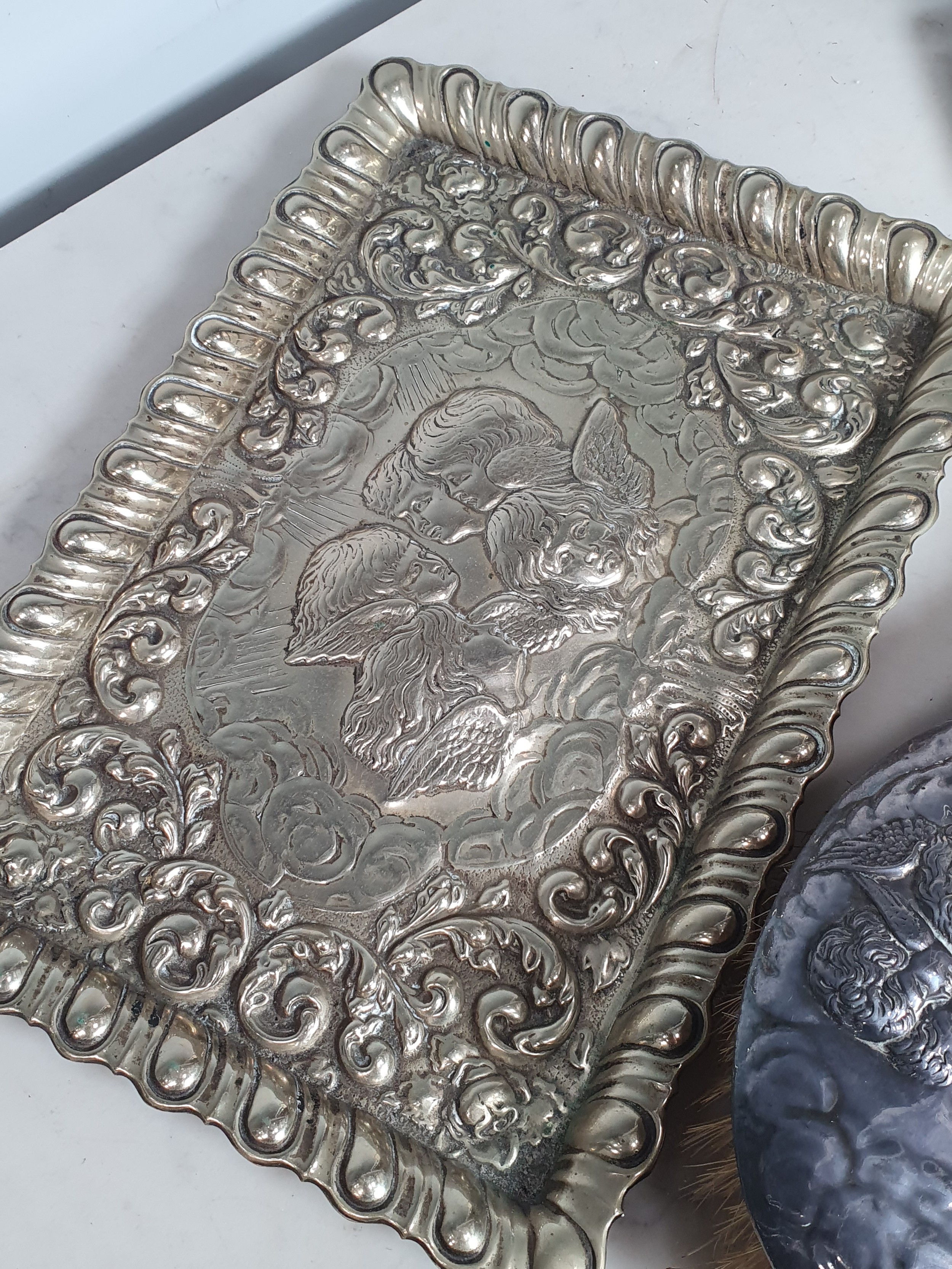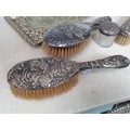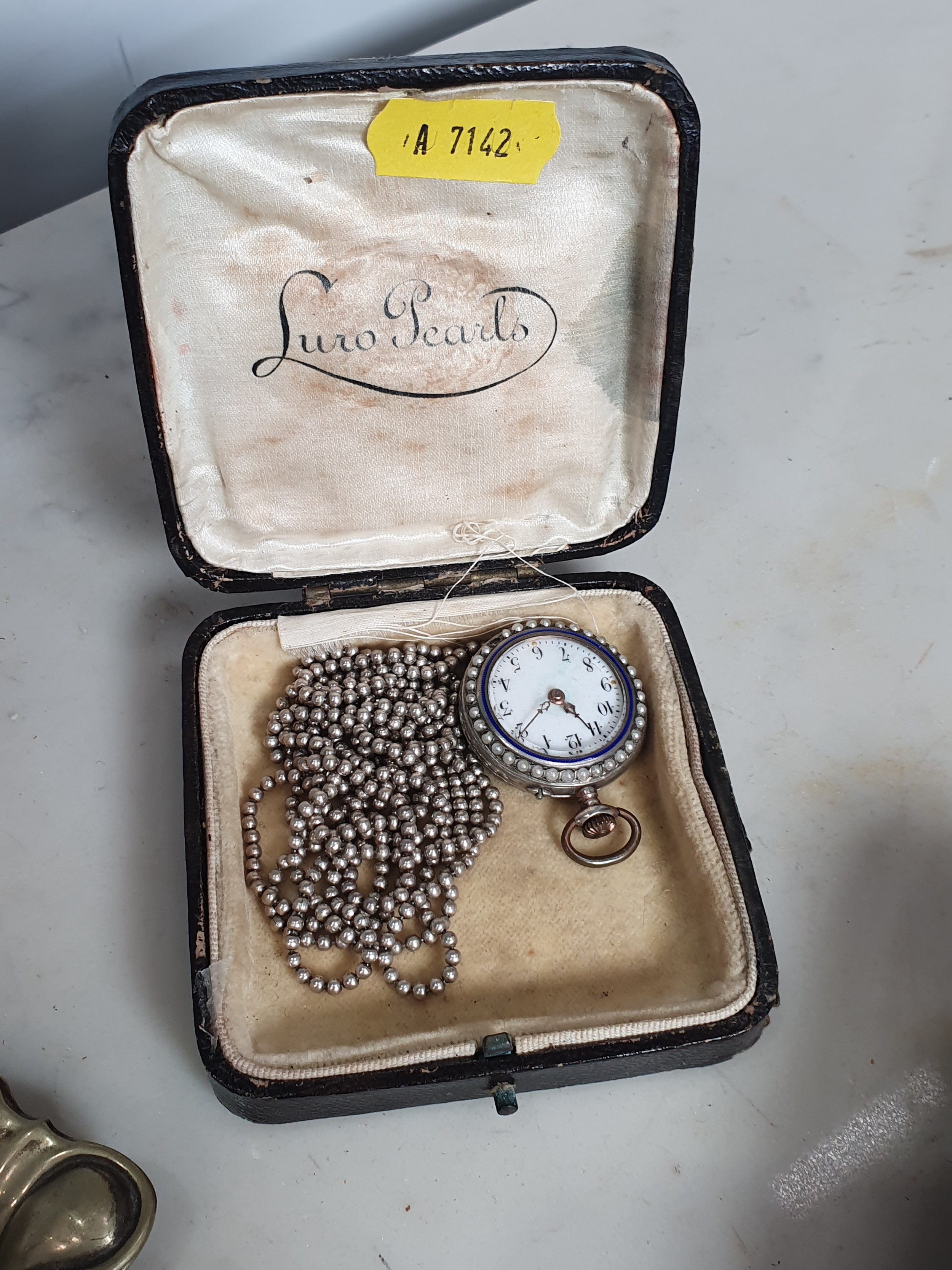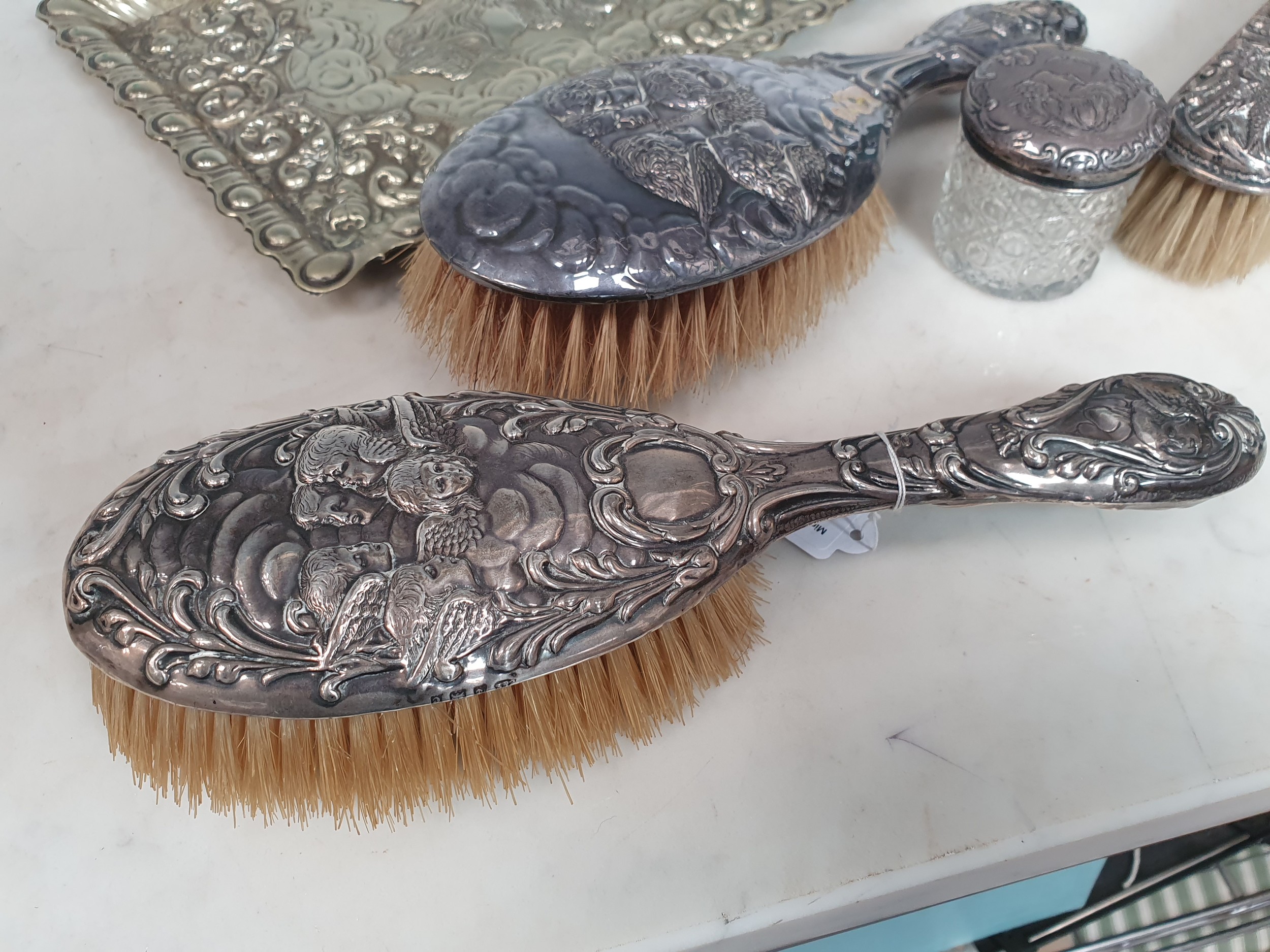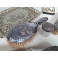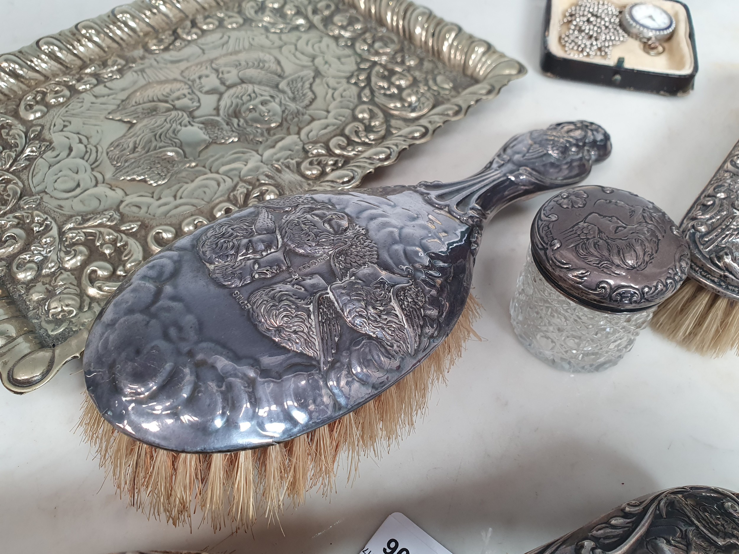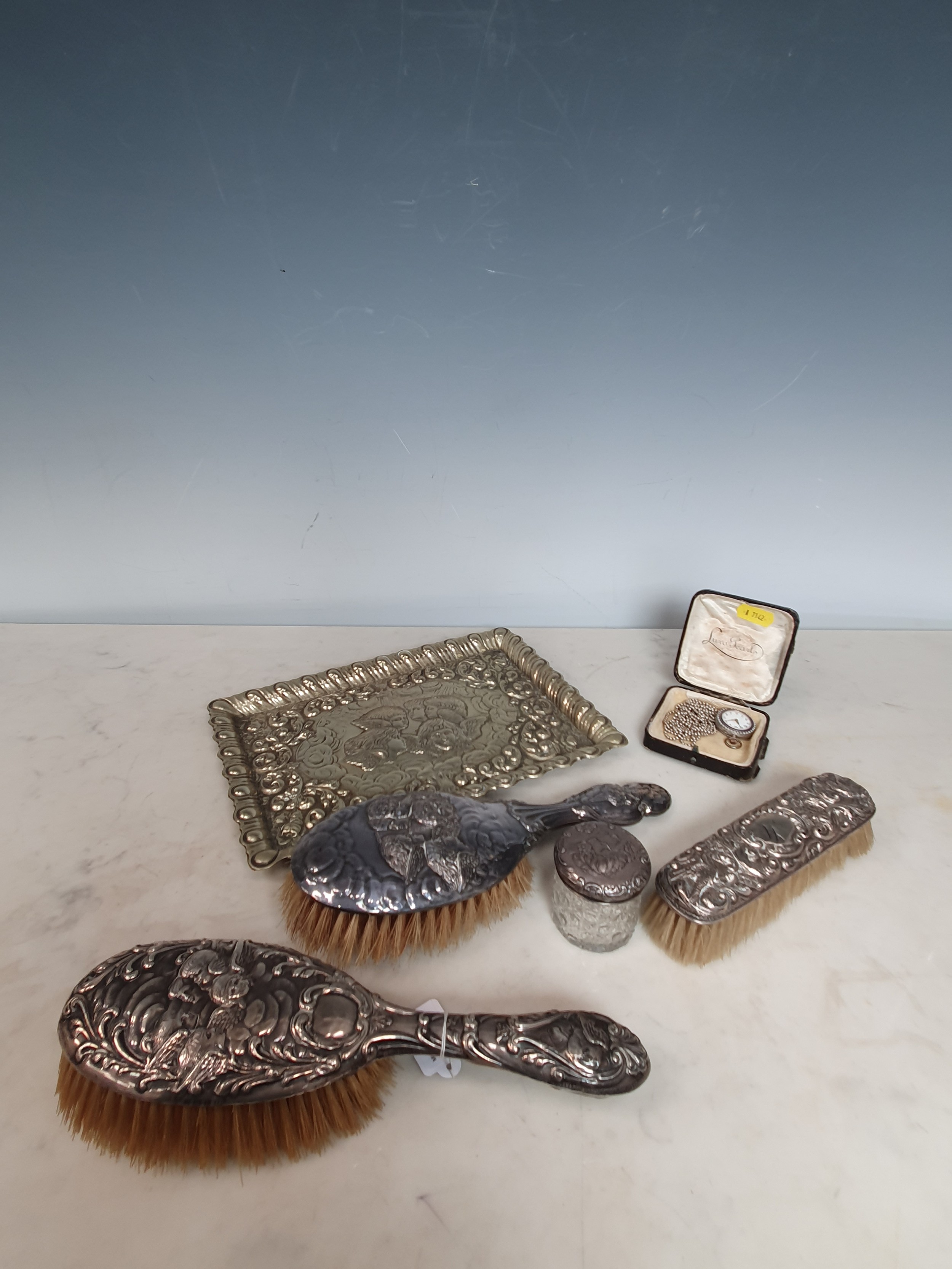 A lady's Swiss silver cased Fob watch the white enamel dial with roman numerals, the case with blue enamel and seed pearls (lacks one pearl), case width approx 28mm on long white metal chain and various silver backed and silver plated Hair Brushes and a plated Tray.