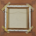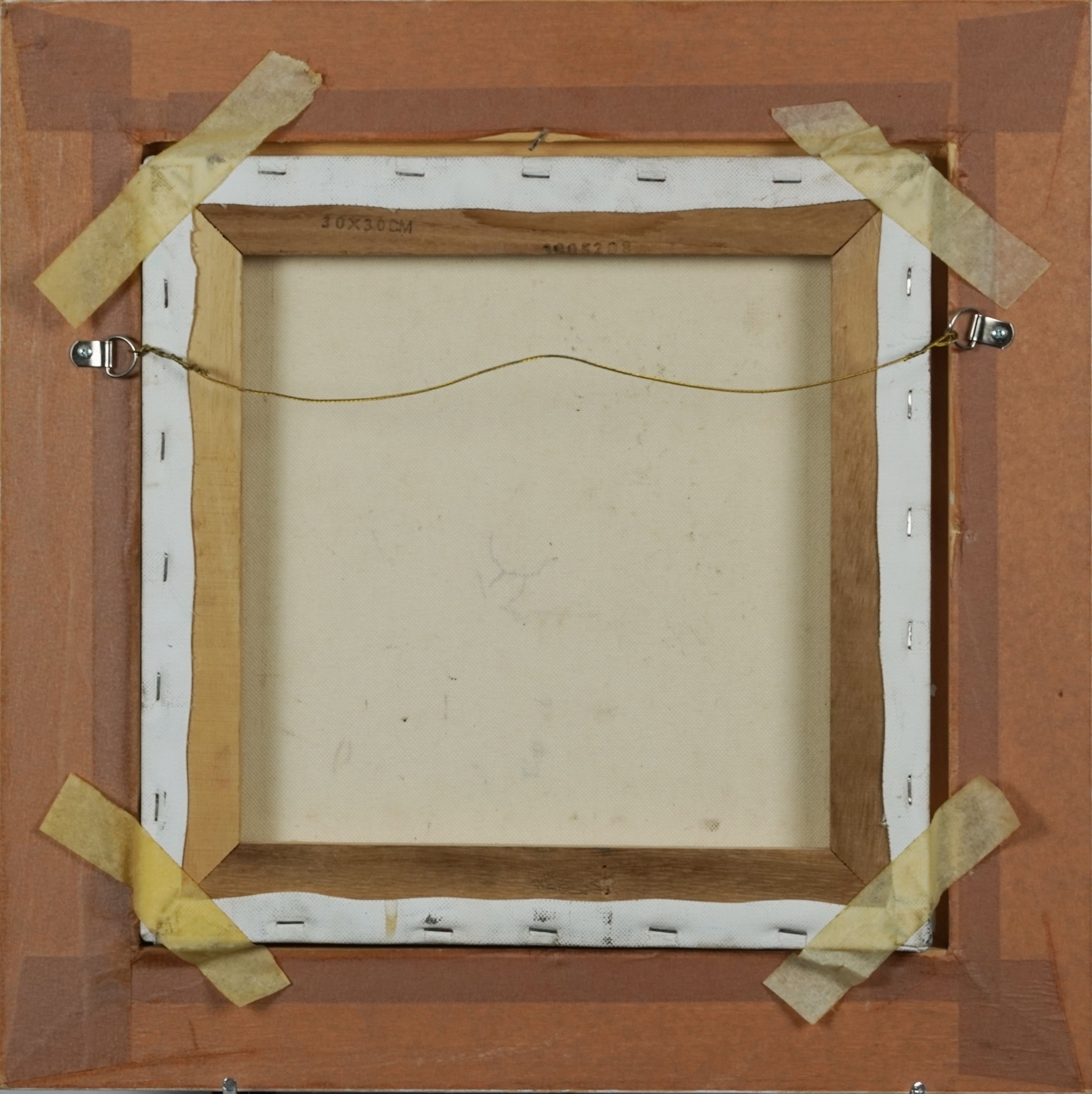 Seated nude female staring at a black dress, Modern British school oil on canvas, framed, 29cm x 29cm.