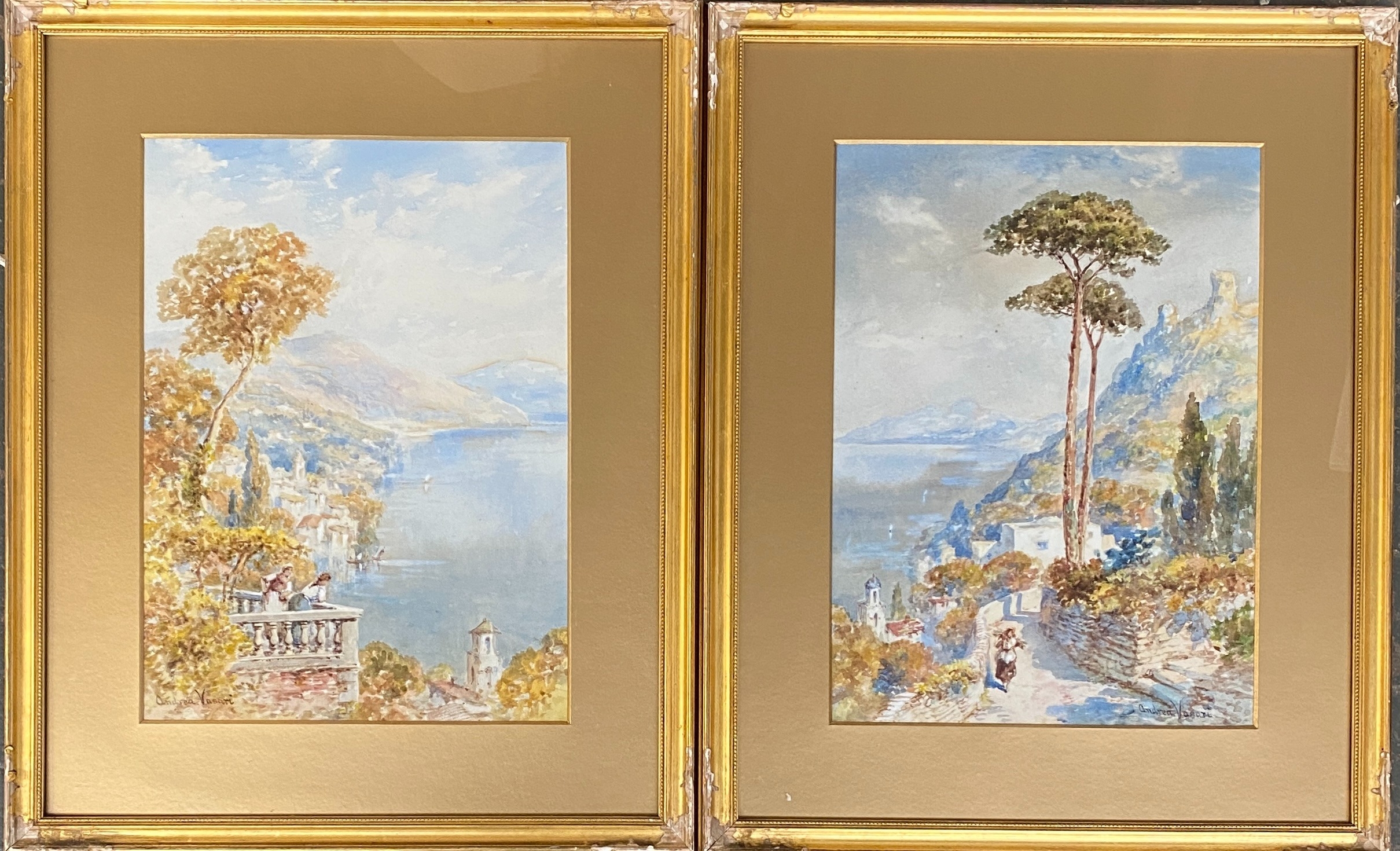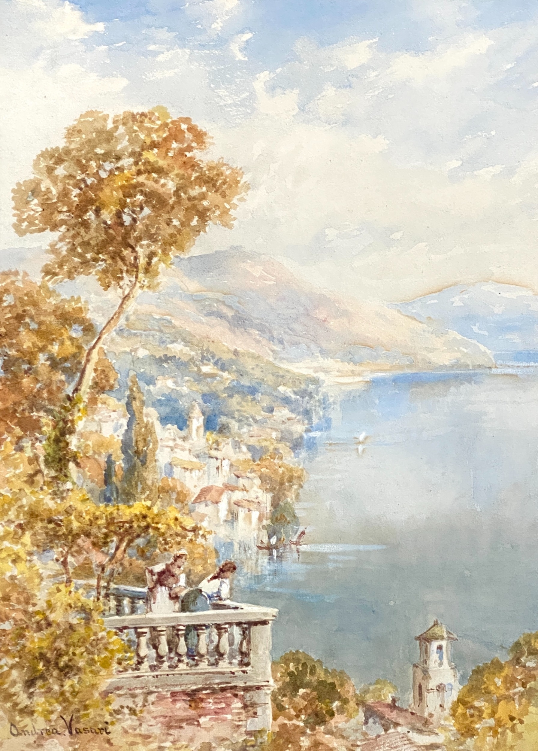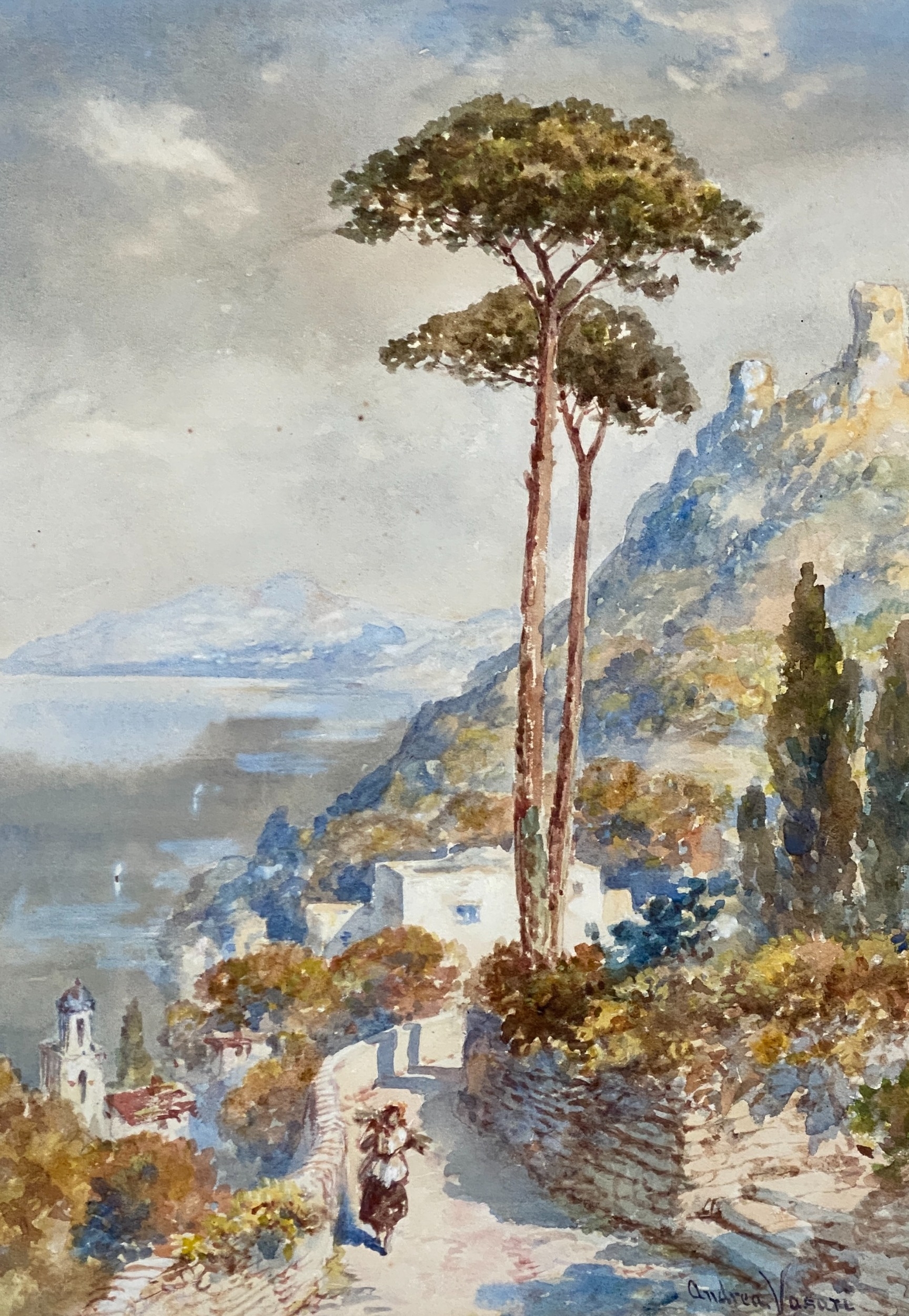 Andrea Vasari (1873-1961), a pair of watercolours of Italian landscapes, titled 'Lago Maggiore' and 'Anacapri' to verso, each signed, 37x27cm
