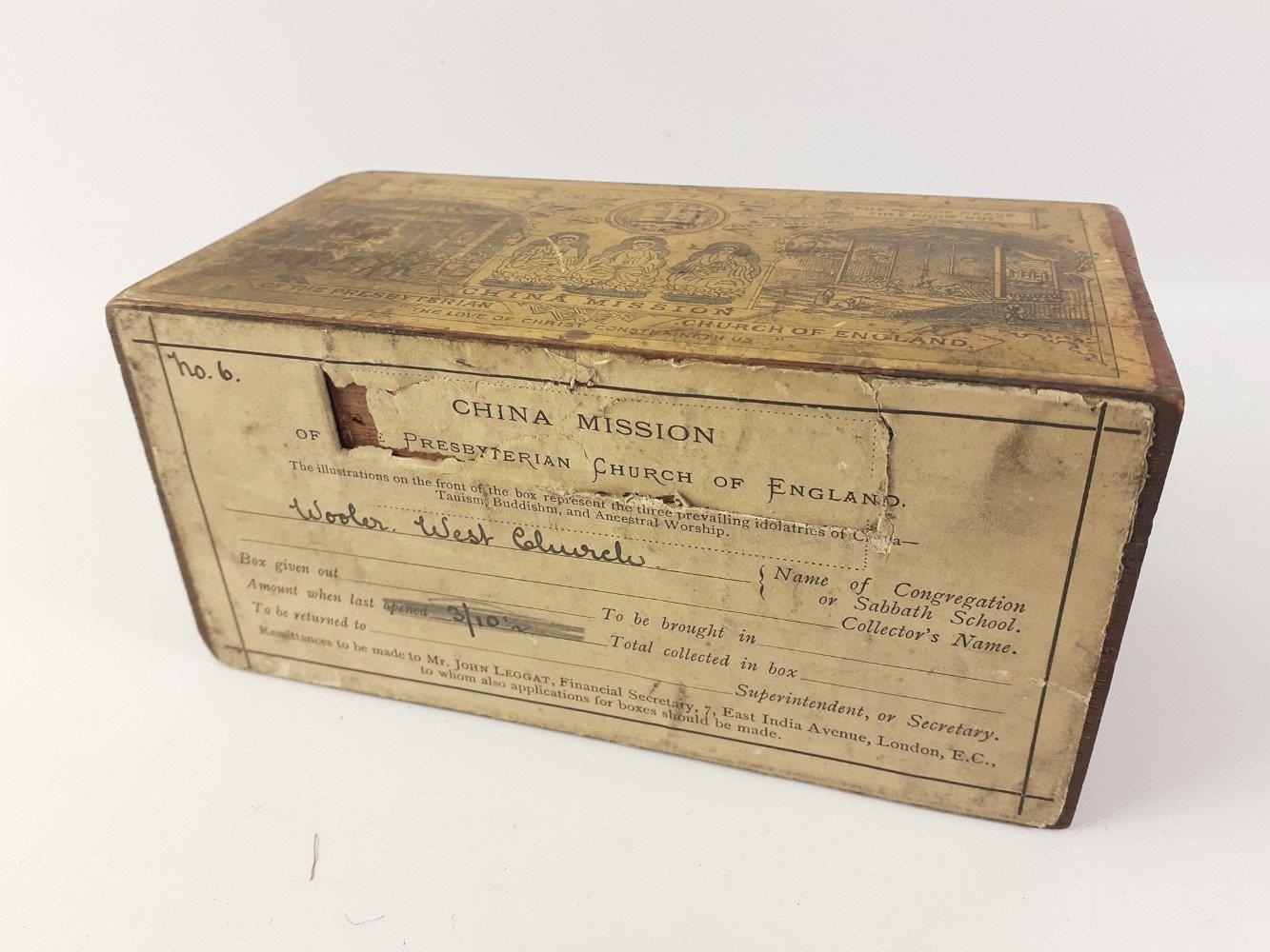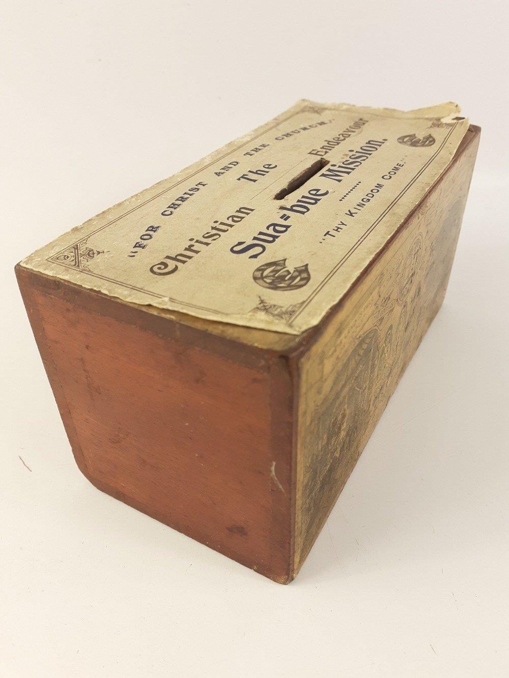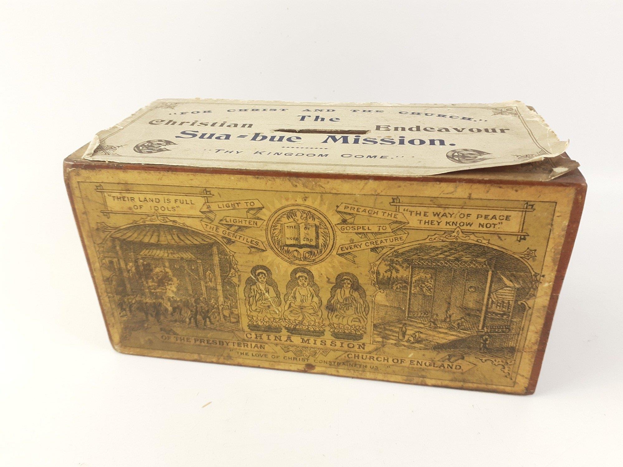 A vintage wooden CHRISTIAN ENDEAVOUR SUA=BUE MISSION collecting box 16x7x8cm approx WOOLER CHURCH Scottish Borders interest, collecting box with beautiful graphics collecting for charitable causes in China. Early 1900s