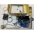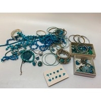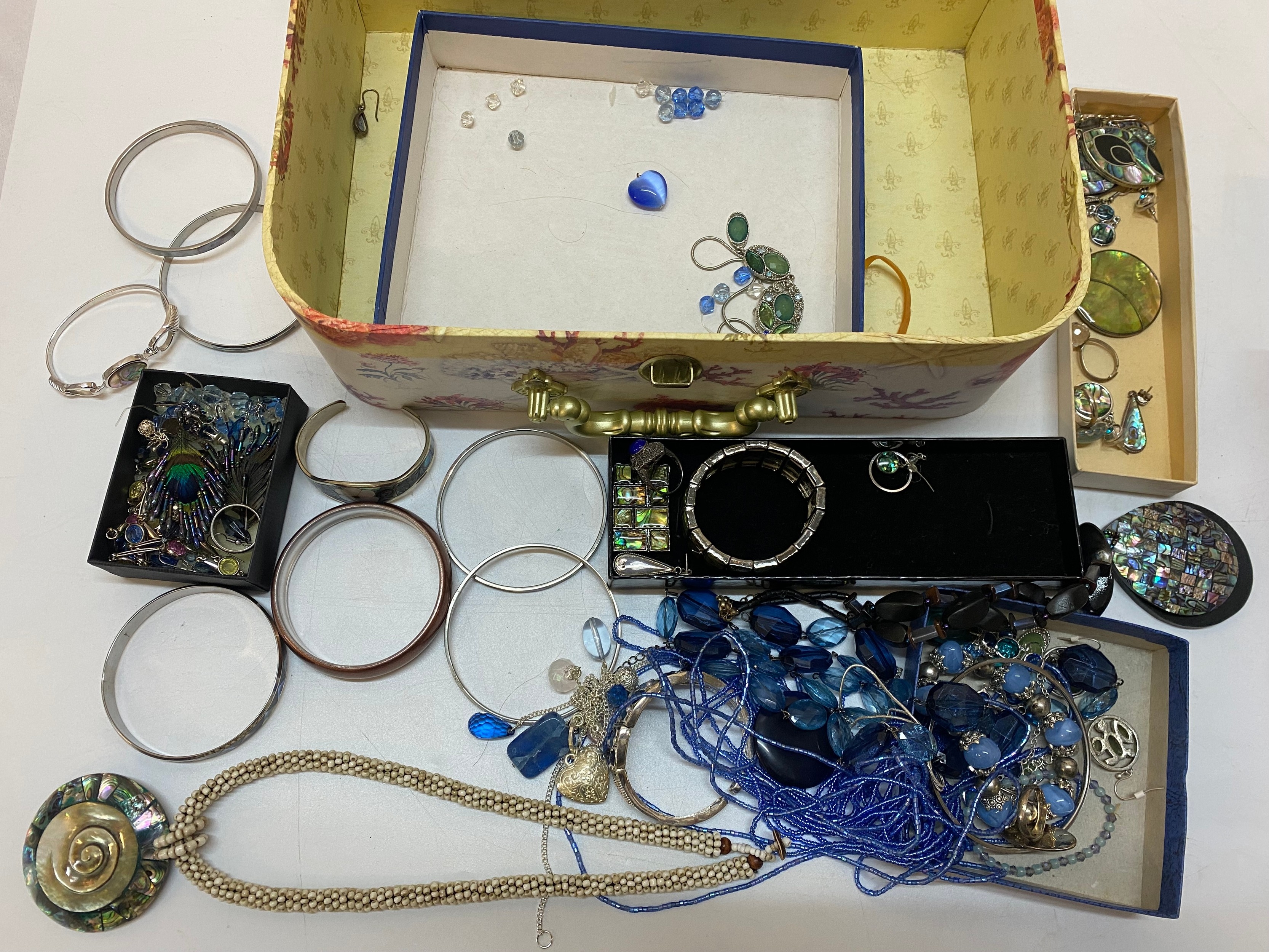 A coral decorated storage case containing a selection of abalone set jewellery, multi stand blue bead necklaces, bangles, earrings, necklaces, paste set necklaces etc..