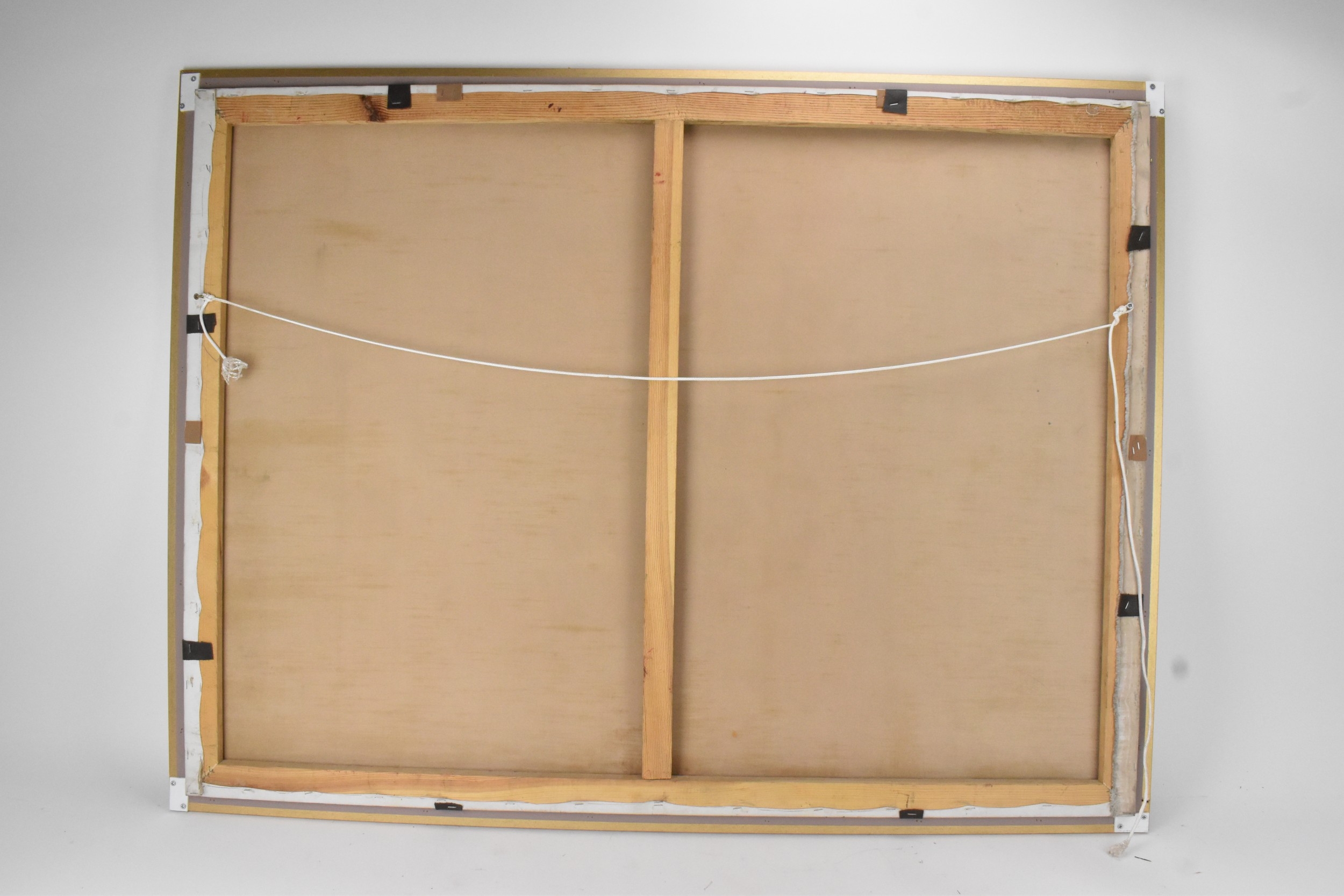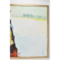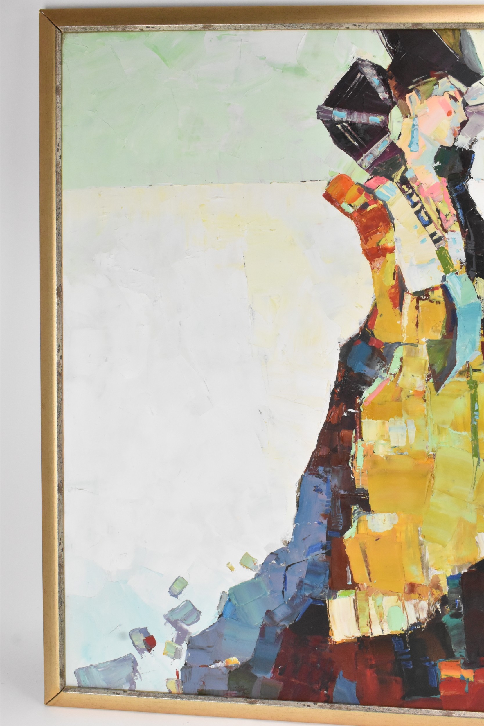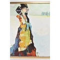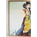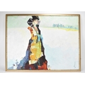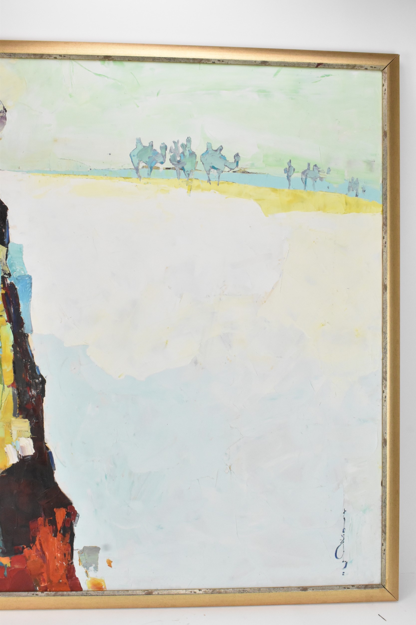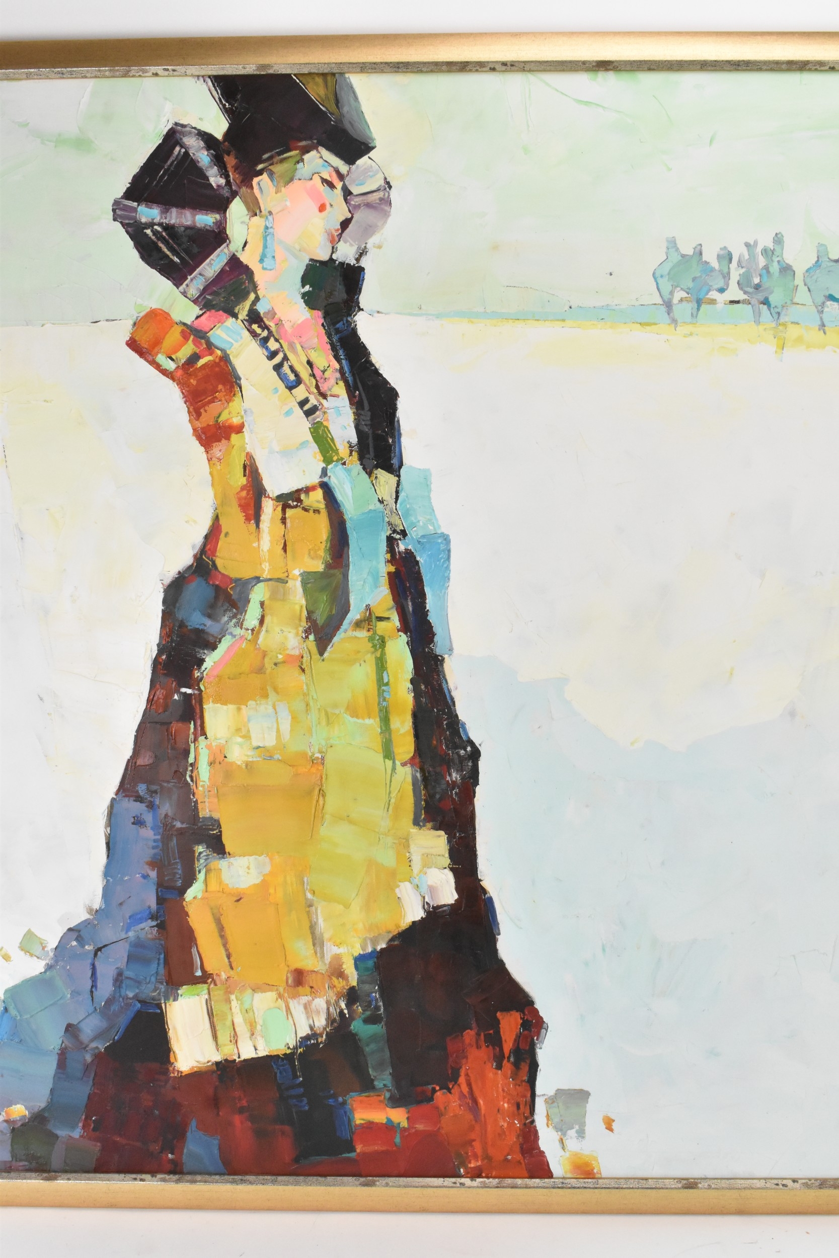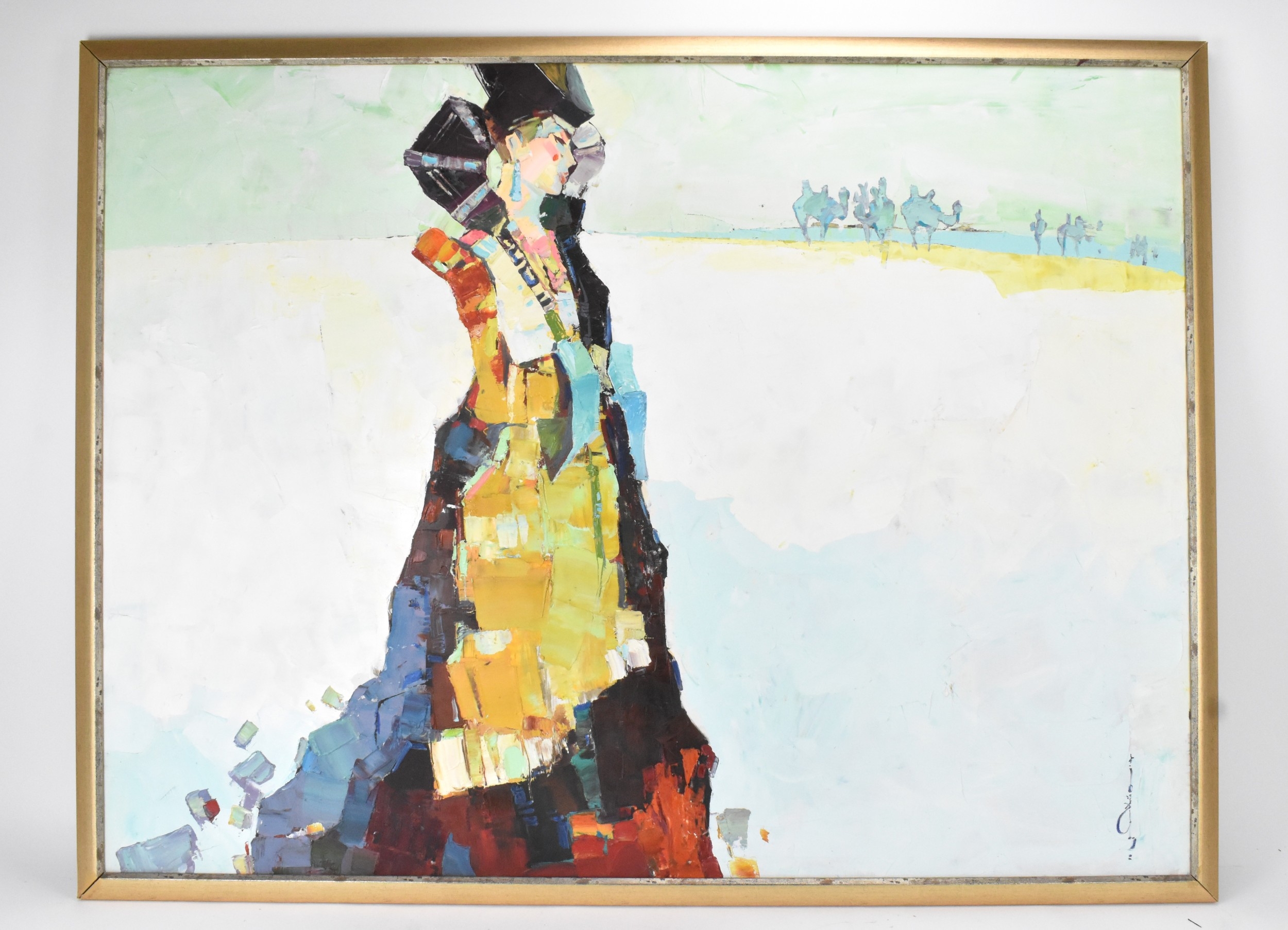 A 20th century oil on canvas depicting a Mongolian woman with camels to the background, indistinctly signed to the lower right corner, 119cm x 89cm, the frame 126cm x 95cm
