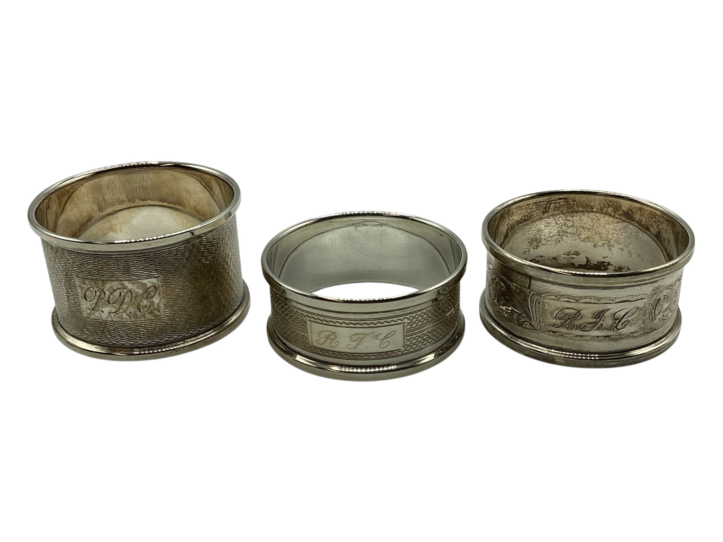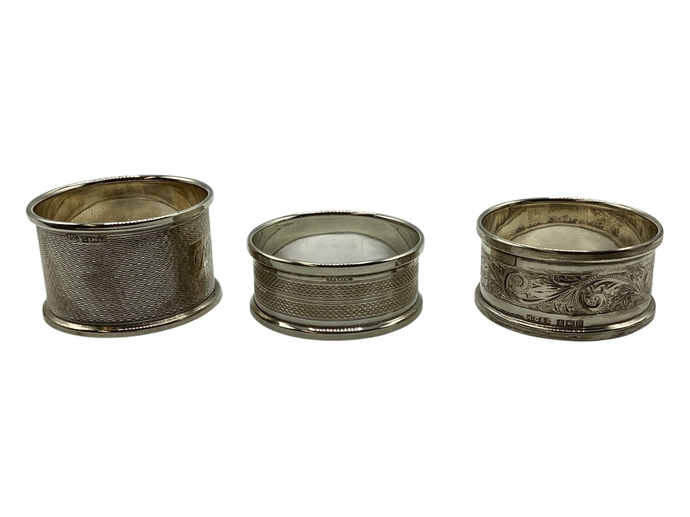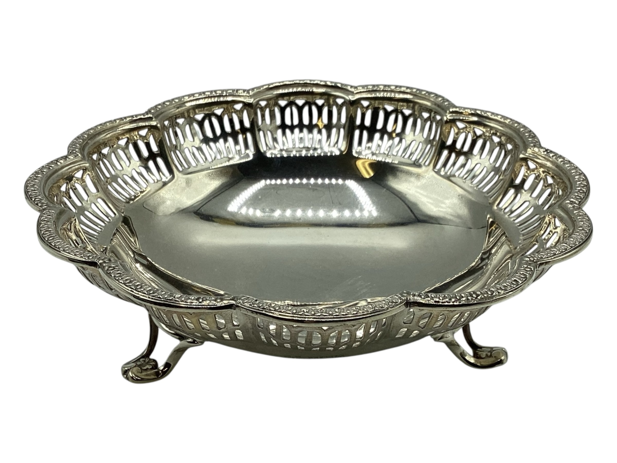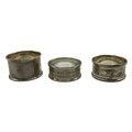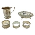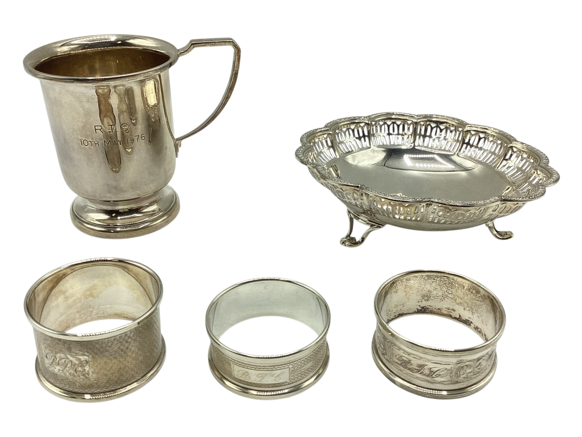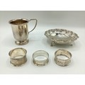 A collection of sterling silver items, napkin rings christening cup and a small pierced bowl. Various dates and makers. 238g