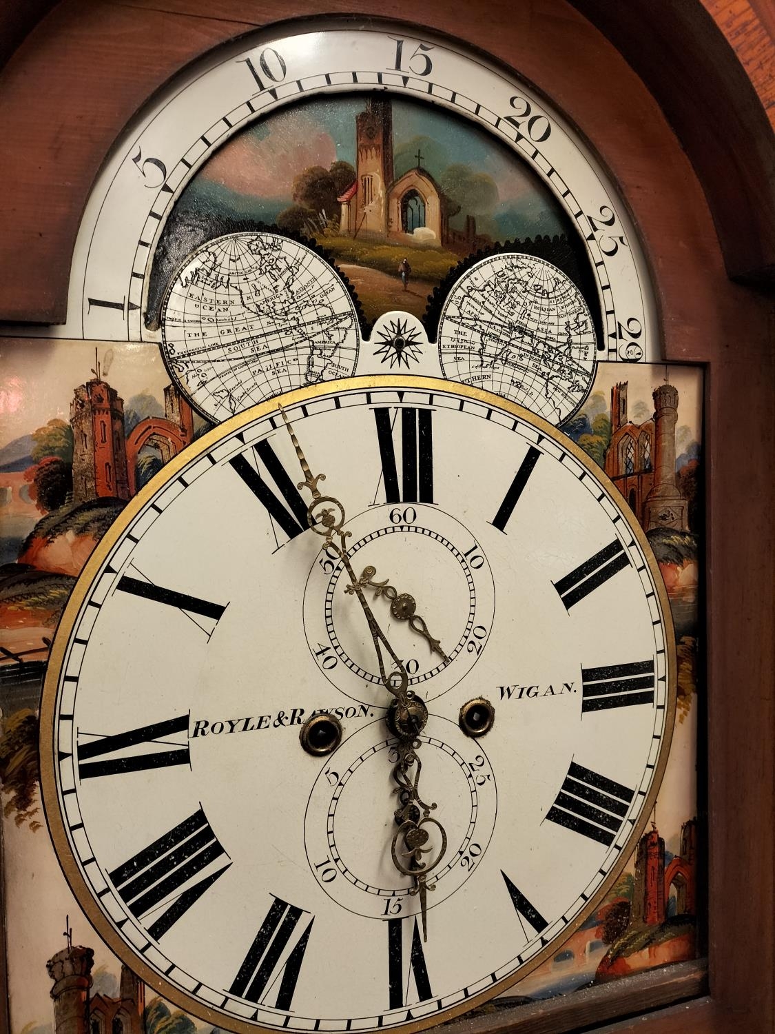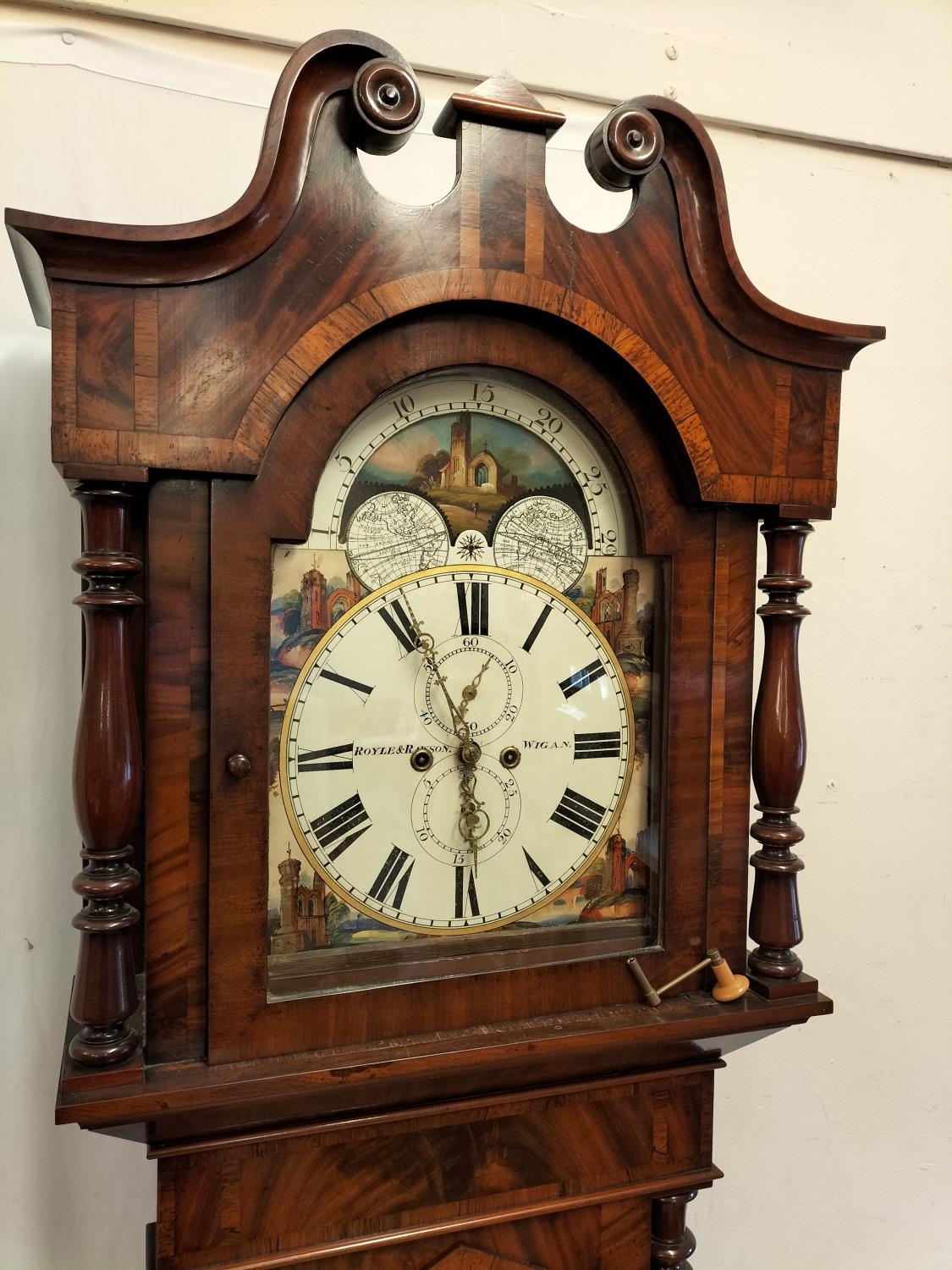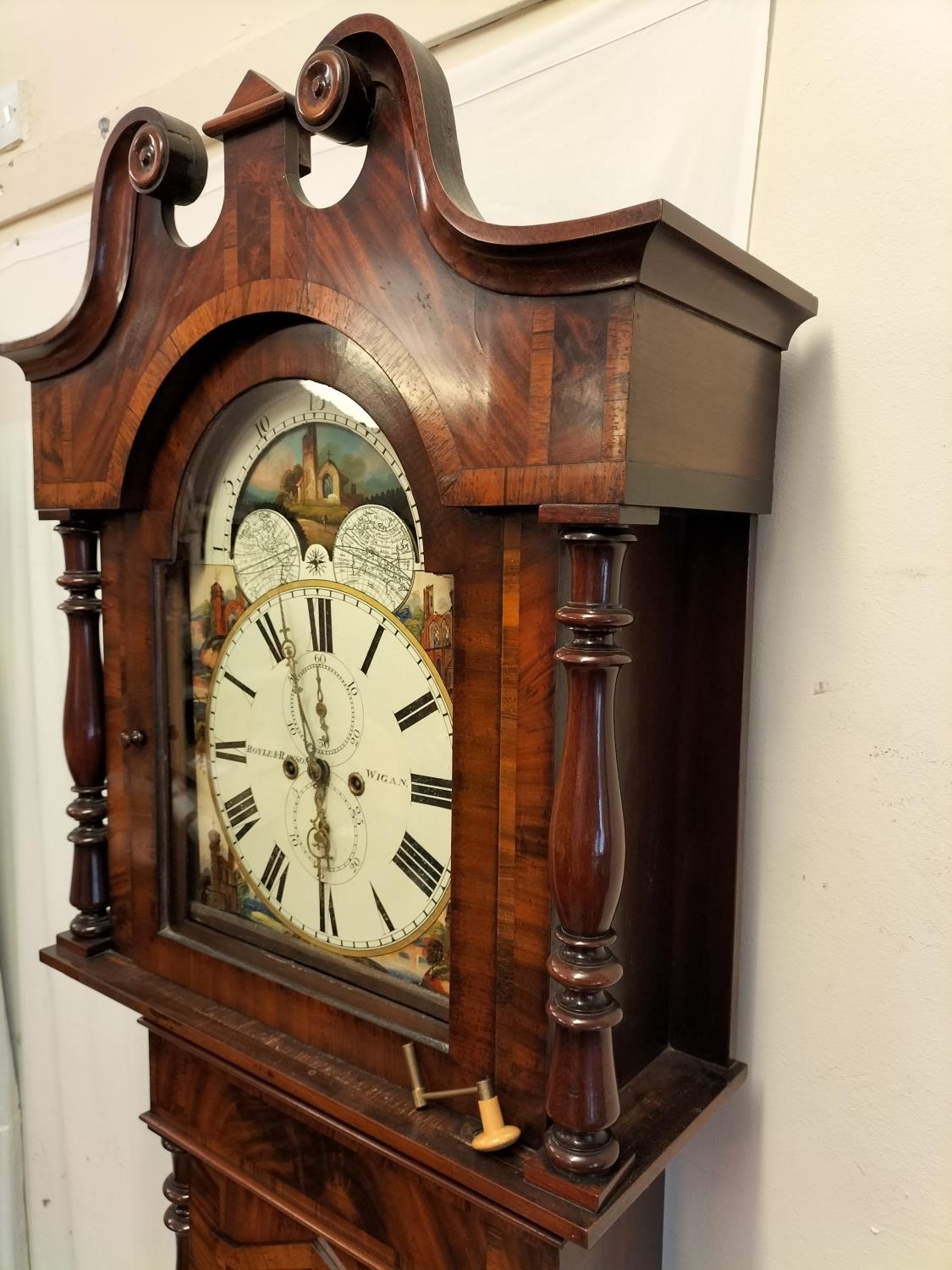 19th Century Long Case Rolling Moon Design Grandfather Clock by Royle & Rawson, Wigan. With Key Winder. 230cm High, 65cm x 25cm. Requires Service, Runs but Stops. Collection Only.