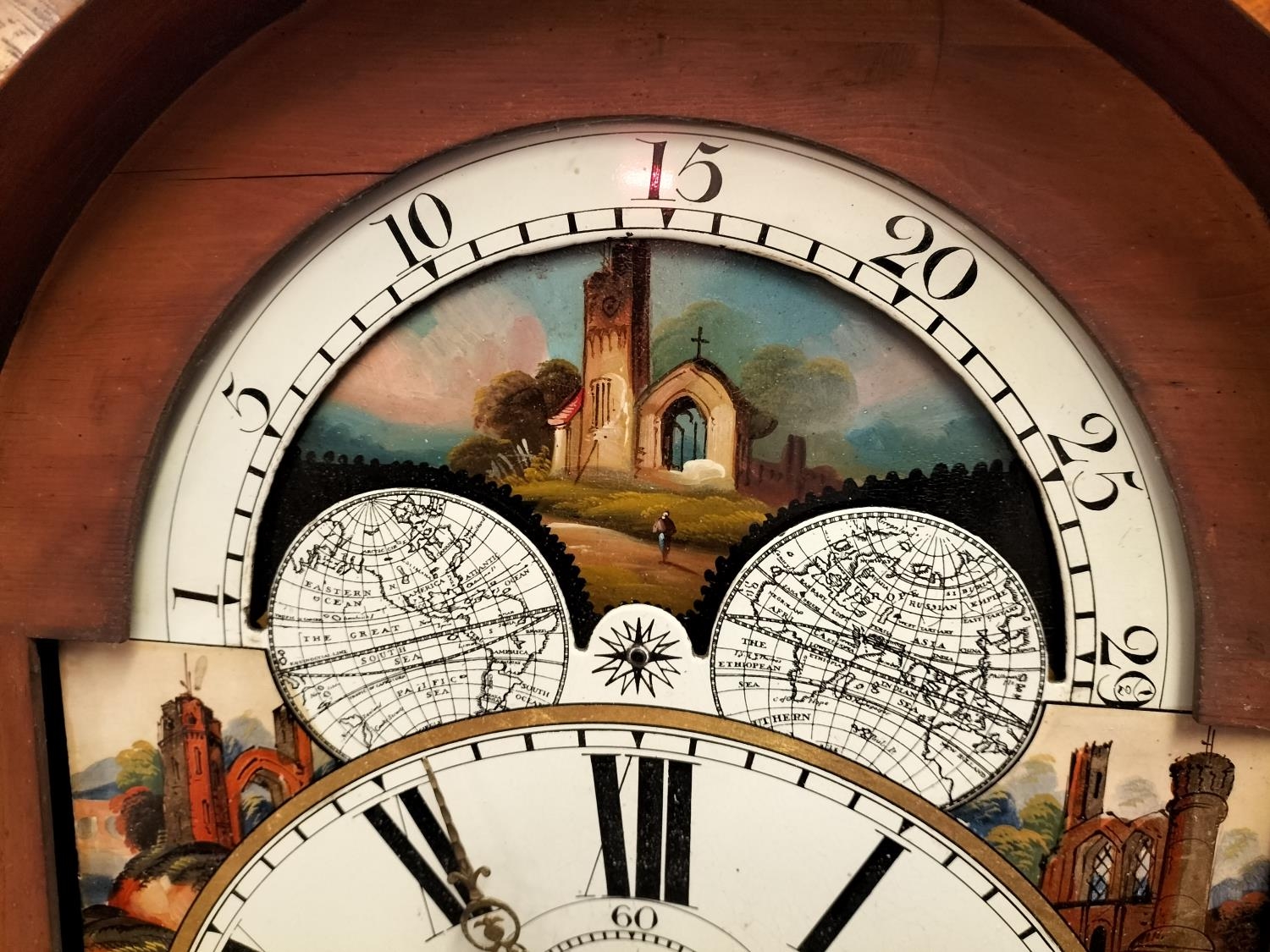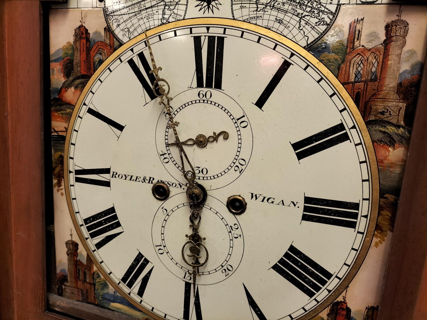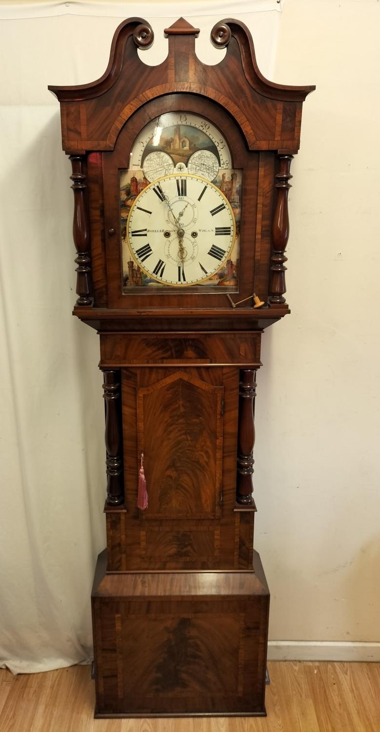 19th Century Long Case Rolling Moon Design Grandfather Clock by Royle & Rawson, Wigan. With Key Winder. 230cm High, 65cm x 25cm. Requires Service, Runs but Stops. Collection Only.