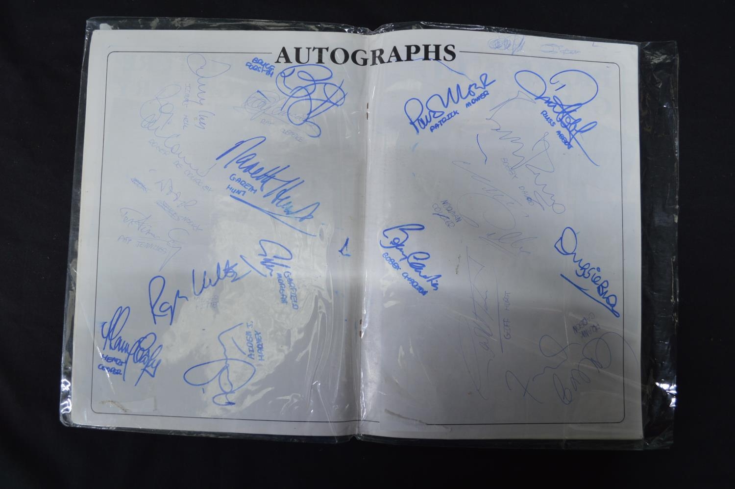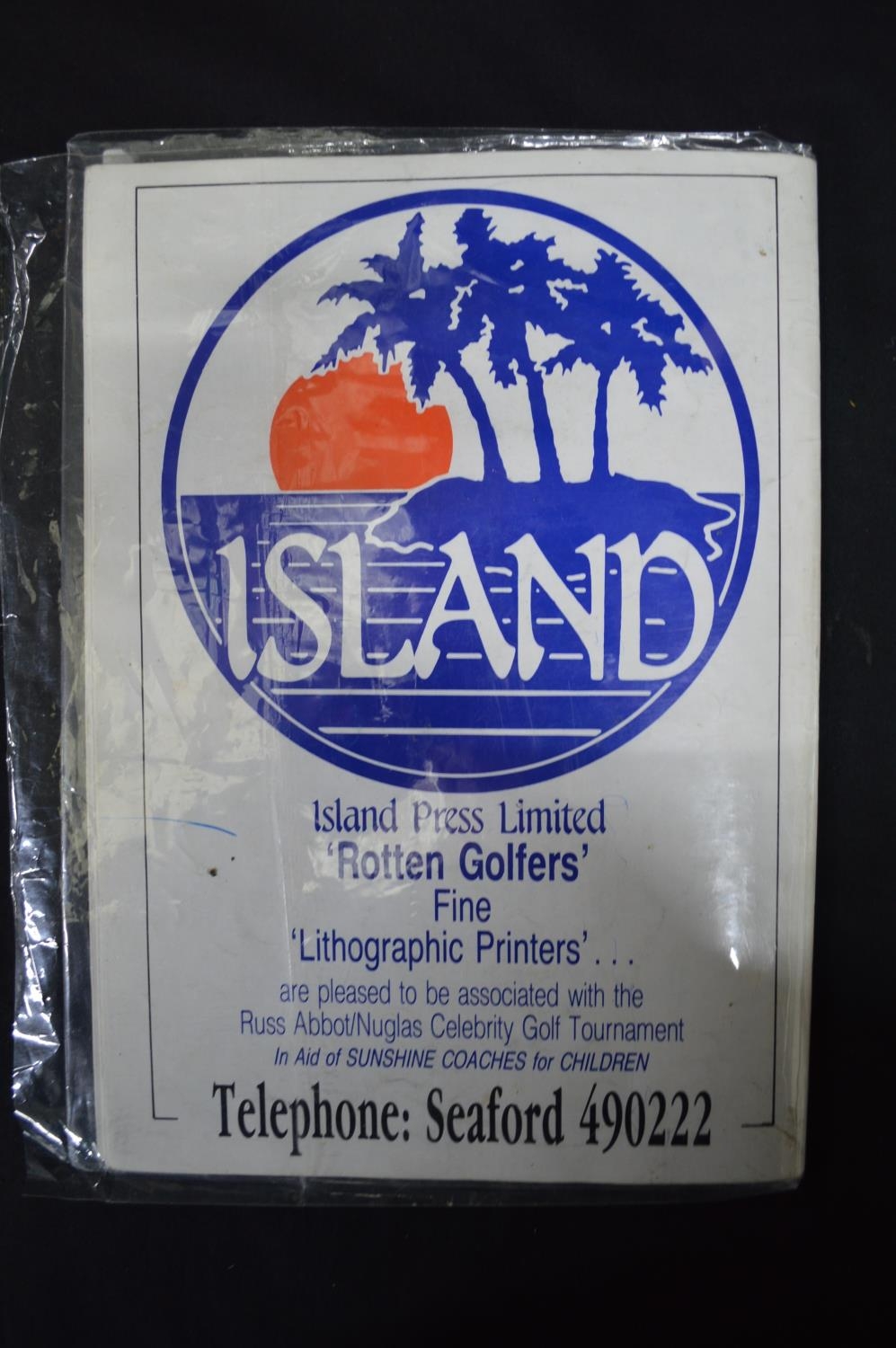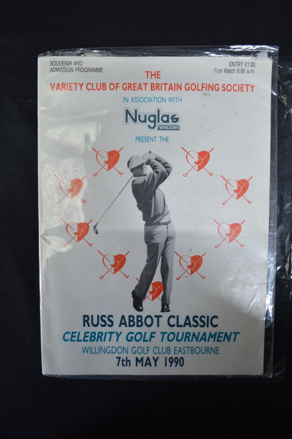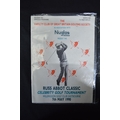 Single copy of Admission & Souvenir Programme for the Russ Abbot Classic Celebrity Golf Tournament held at Willingdon Golf Club, Eastbourne 7th May 1990 having centre pages bearing signatures for Russ Abbott, Frank Carson, Henry Cooper, Geoff Hurst and Bobby Charlton etc (signatures not verified)