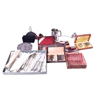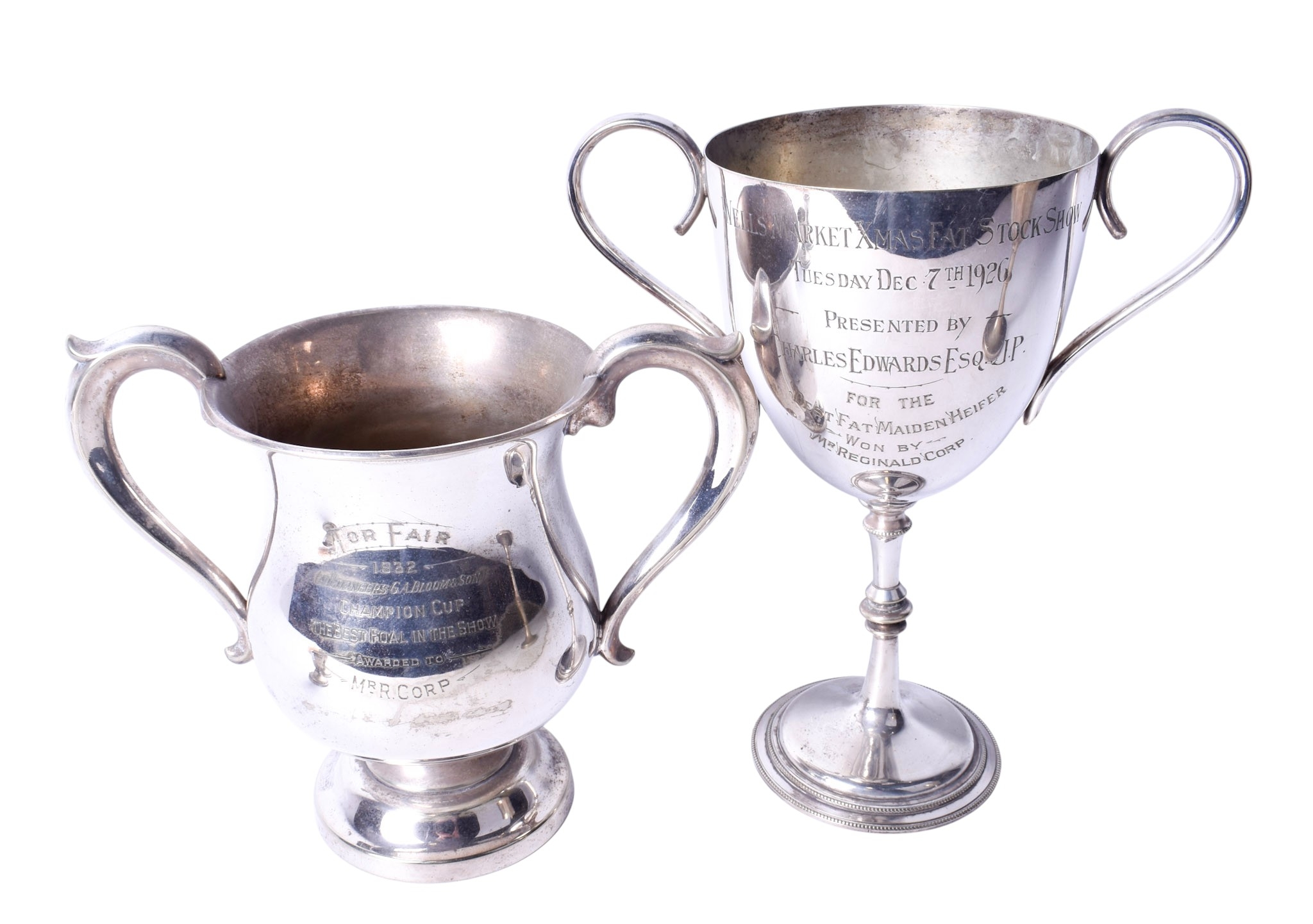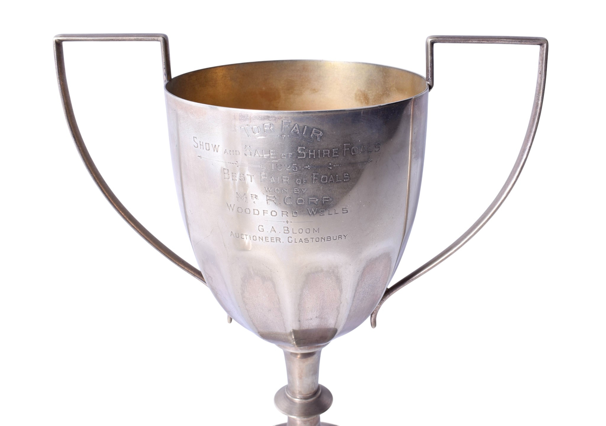 A collection of silverplated trophies. Including a twin-handled example engraved 'Tor Fair, 1925, best pair of foals', H29cm, etc.