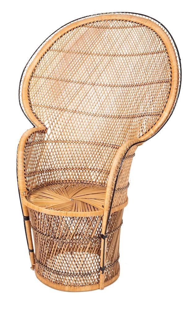 A wicker 'peacock' chair, second half 20th century; of typical form, with broad oval backrest above a circular seat; 130cm high, 92cm wide.