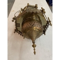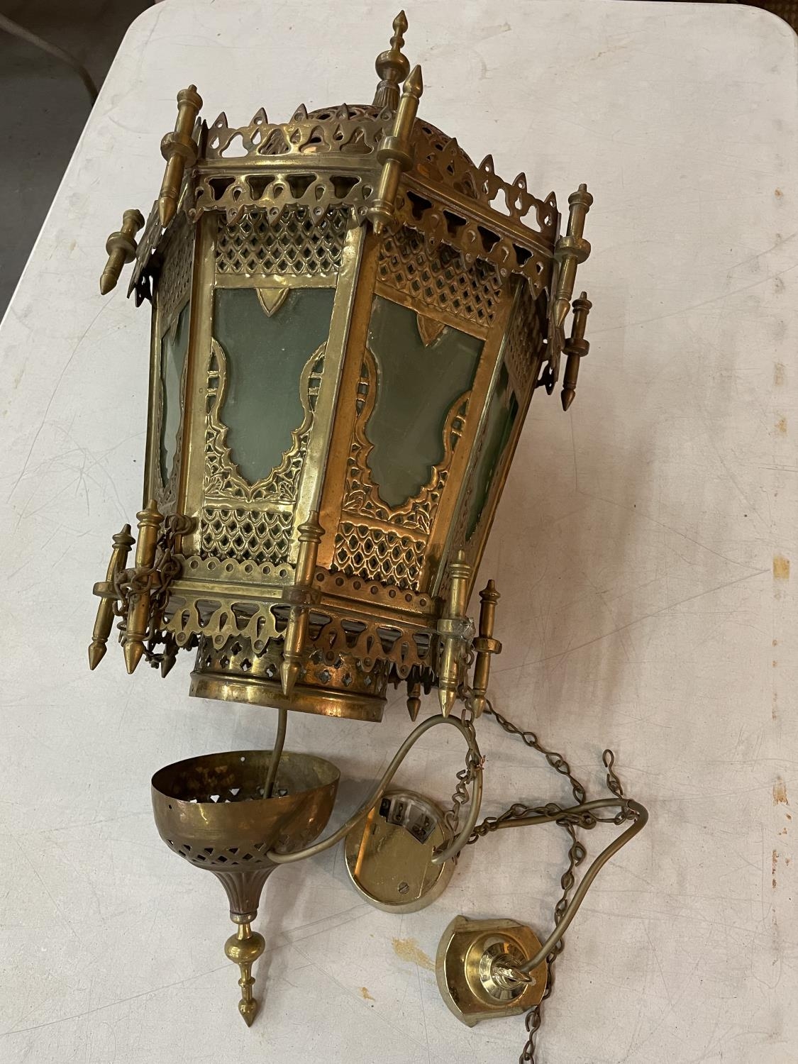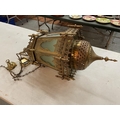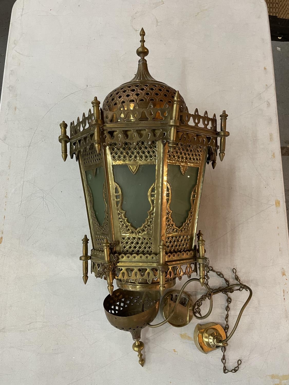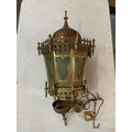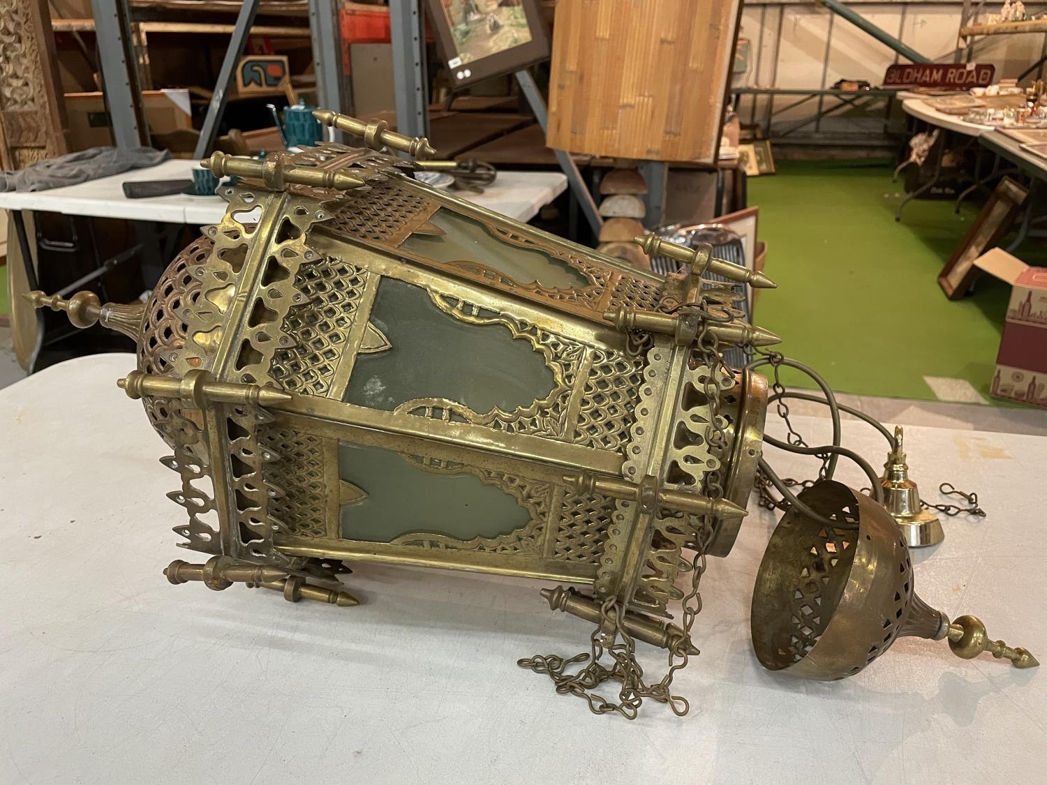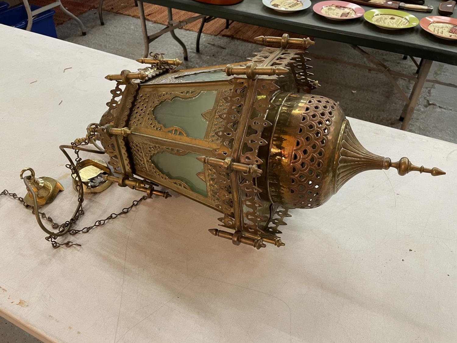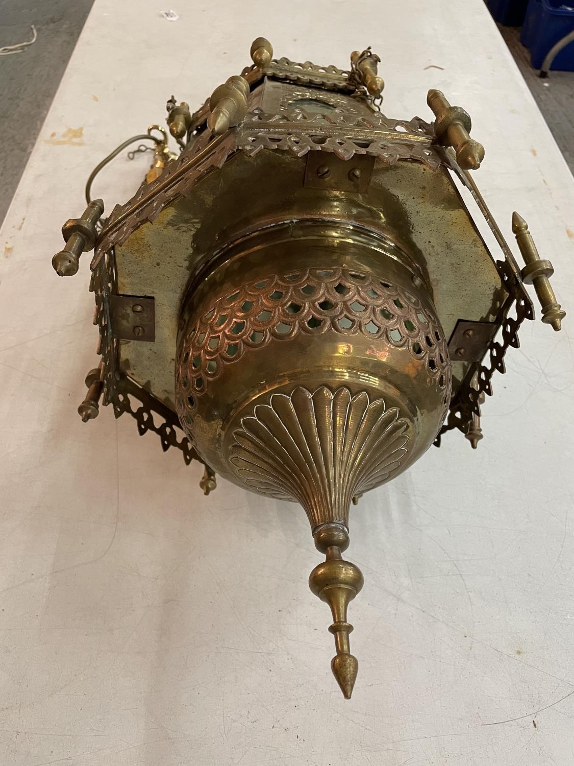 A LARGE ORNATE BRASS CEILING LANTERN 55CM WITH GLASS PANELS