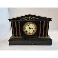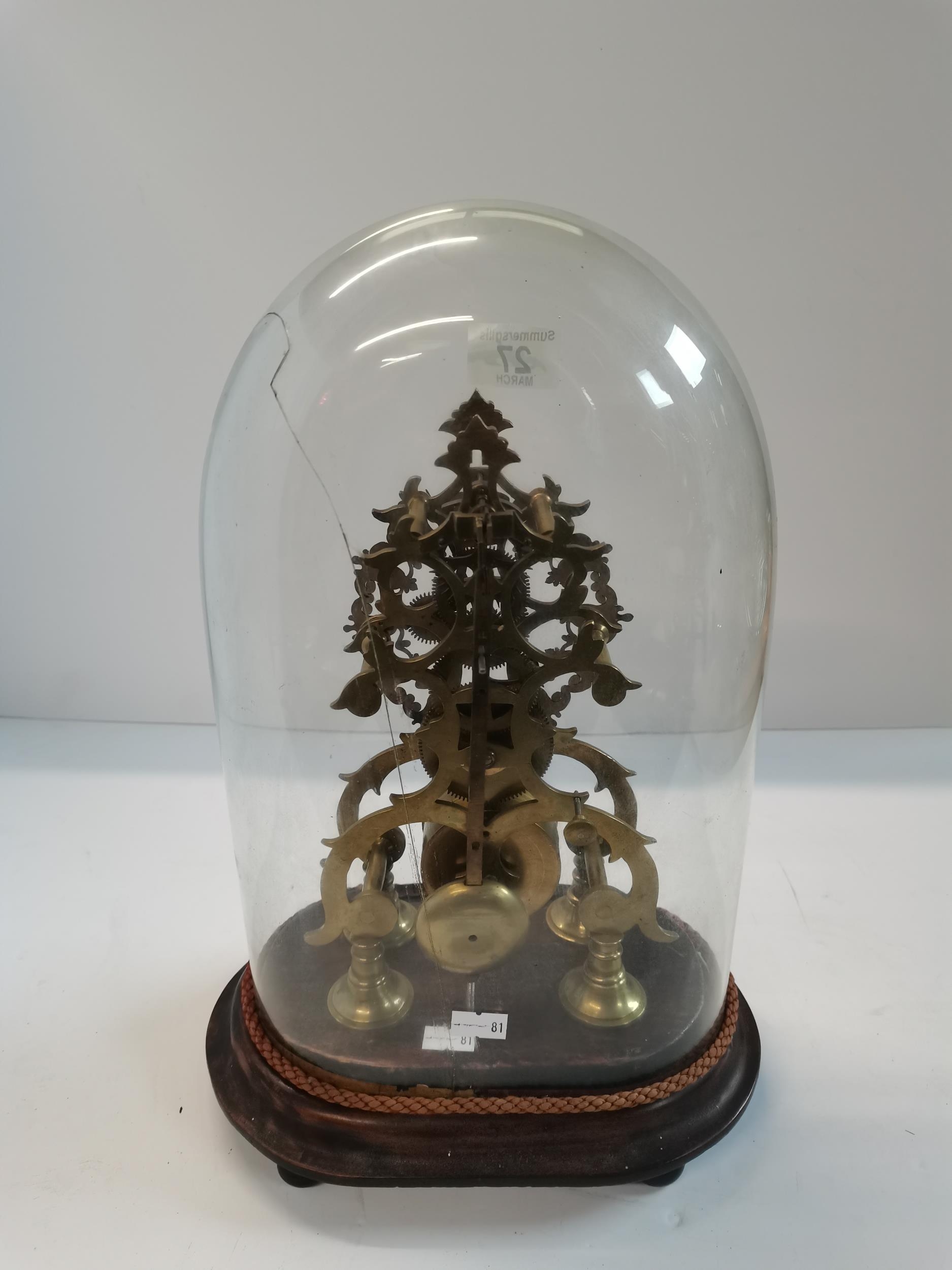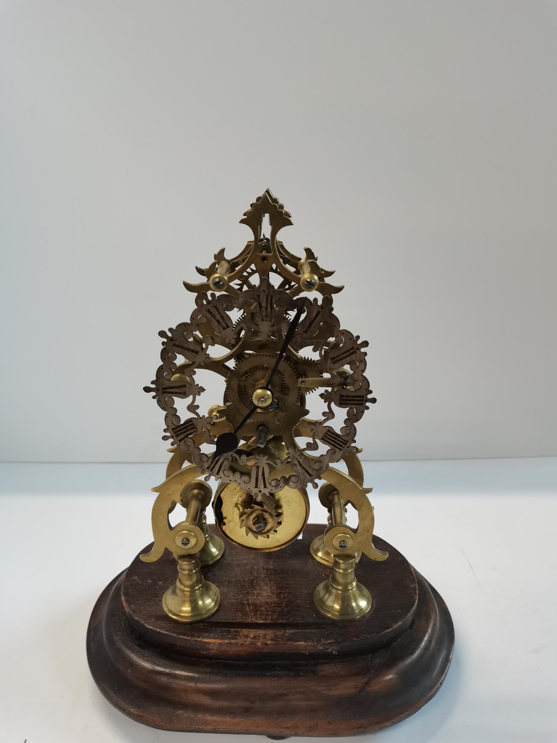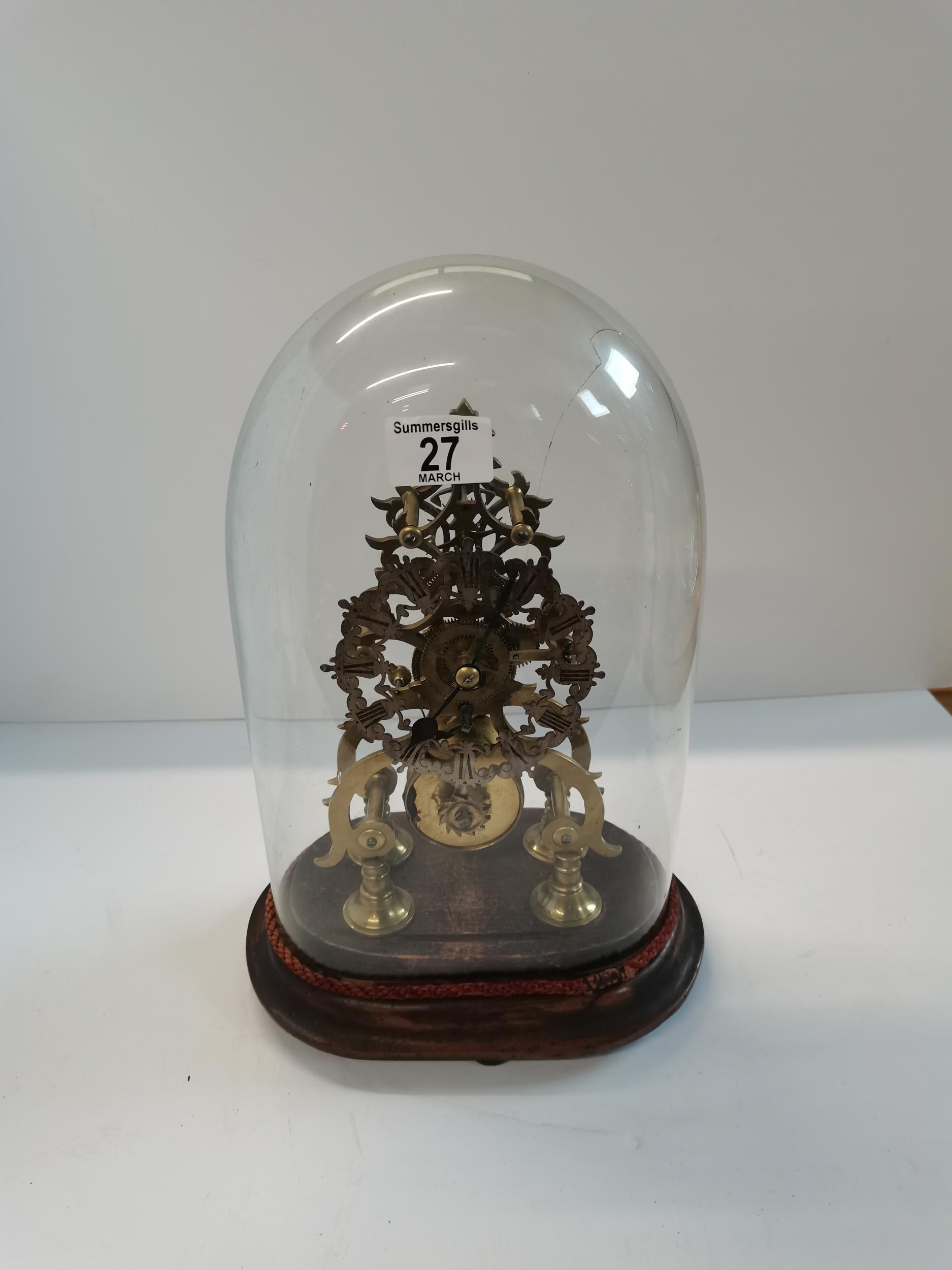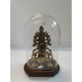Antique brass skeleton clock encased in glass dome on wooden base 36cm height