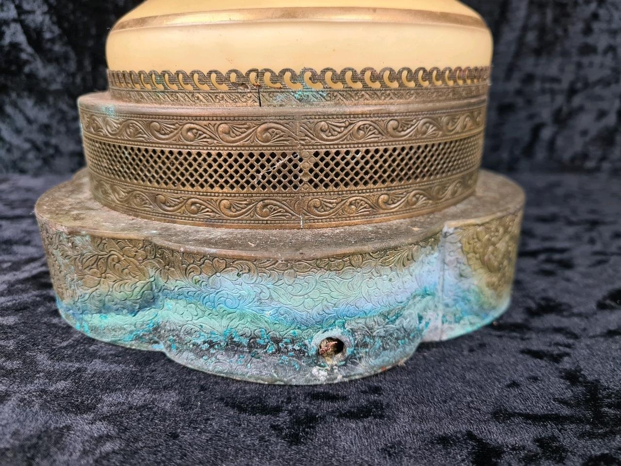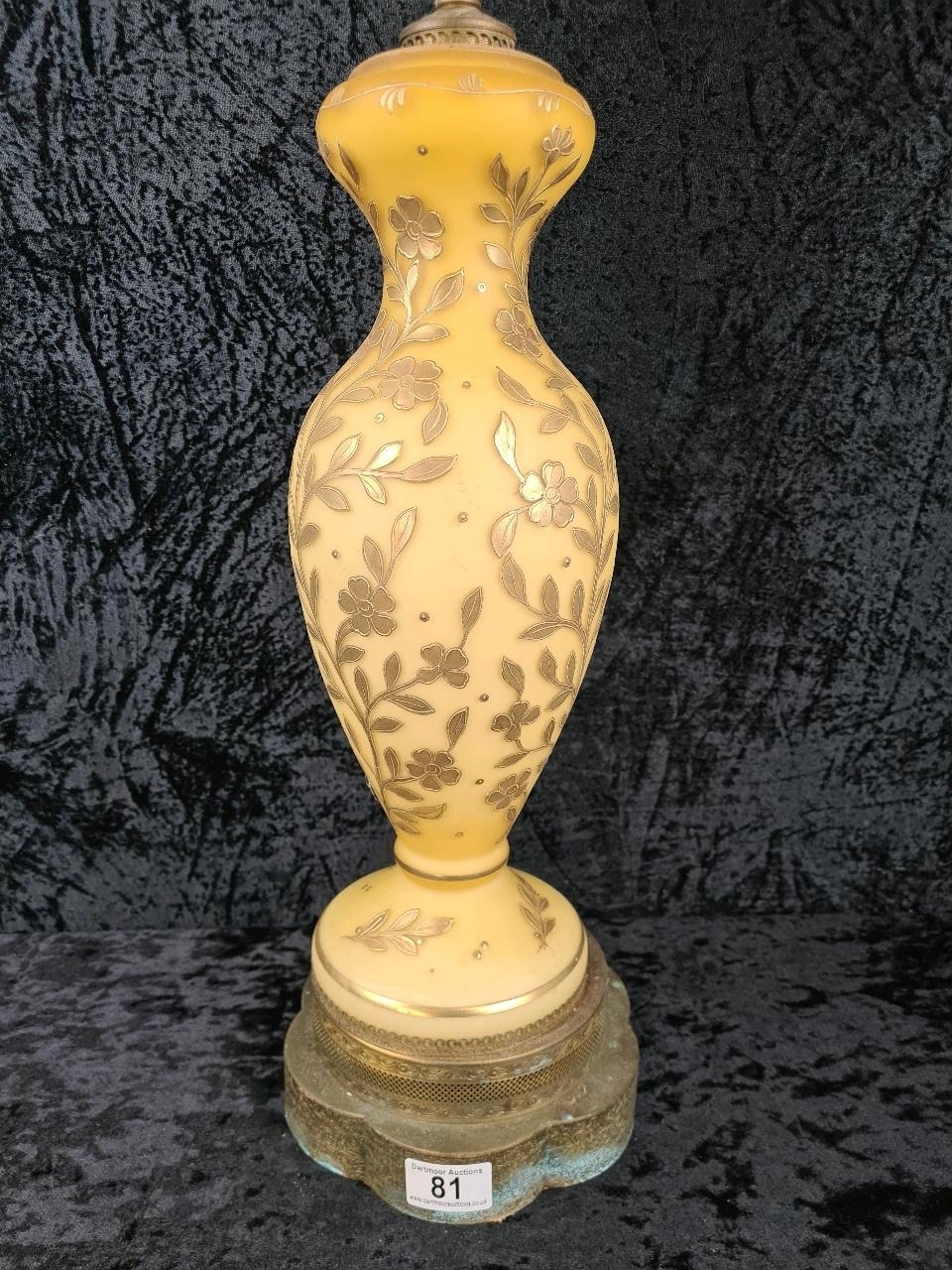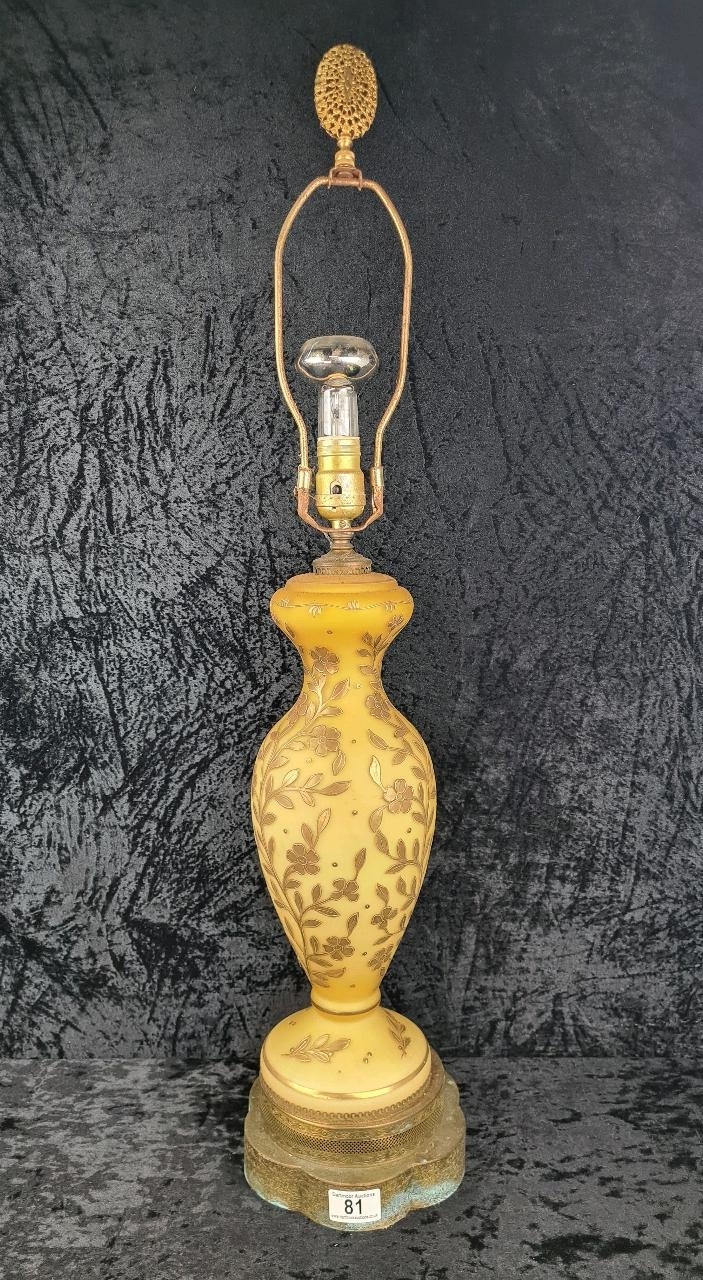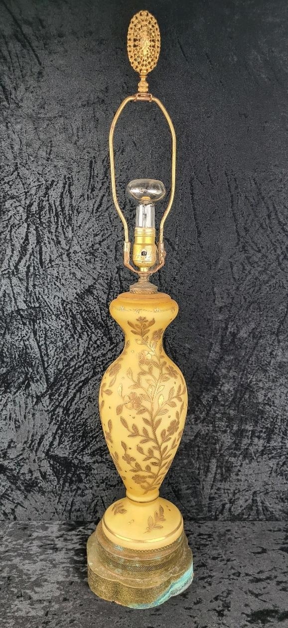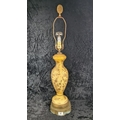 Impressive vintage ceramic and brass lamp with gilt relief detailing (needs wiring). Approx H87cm.
