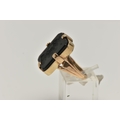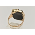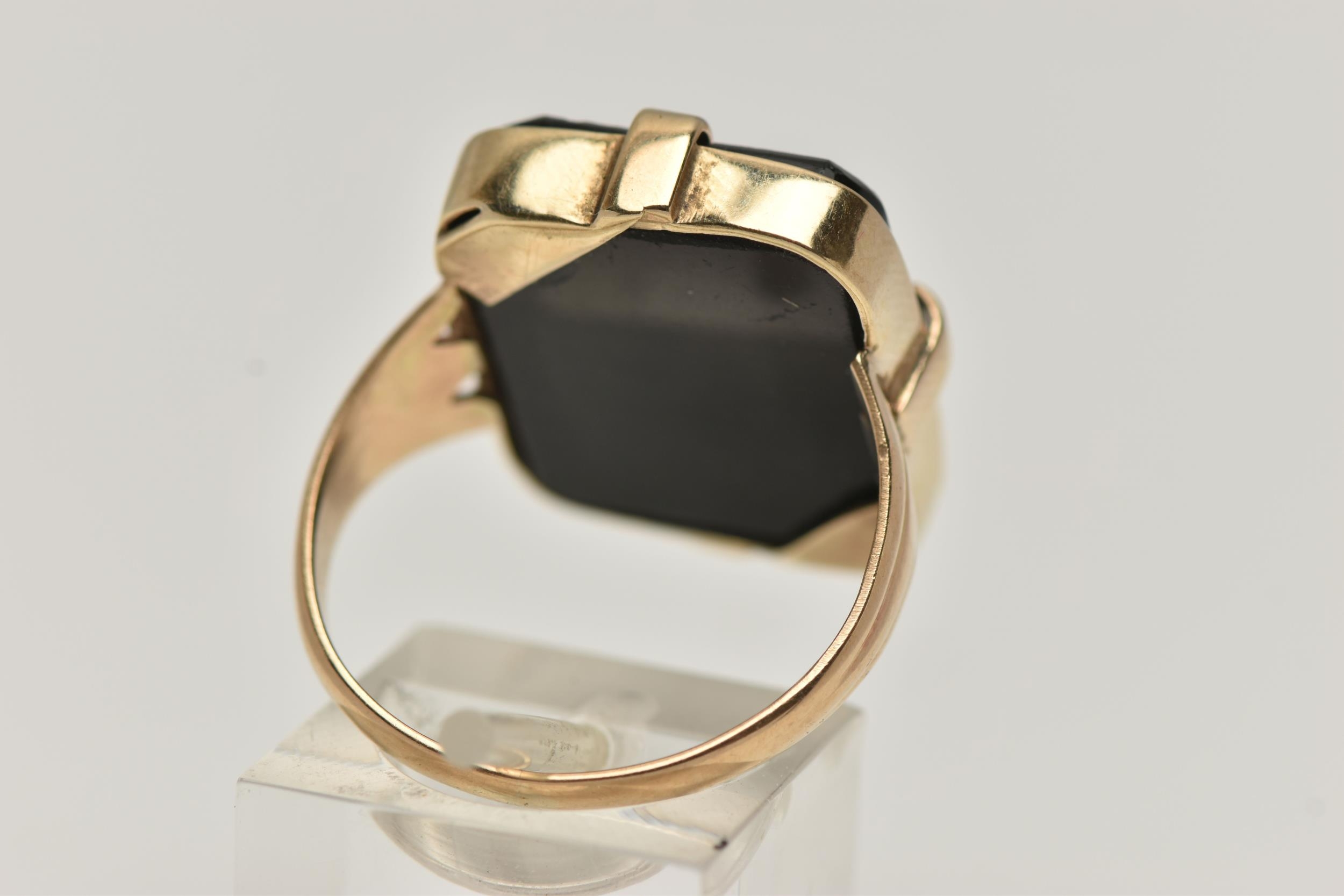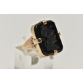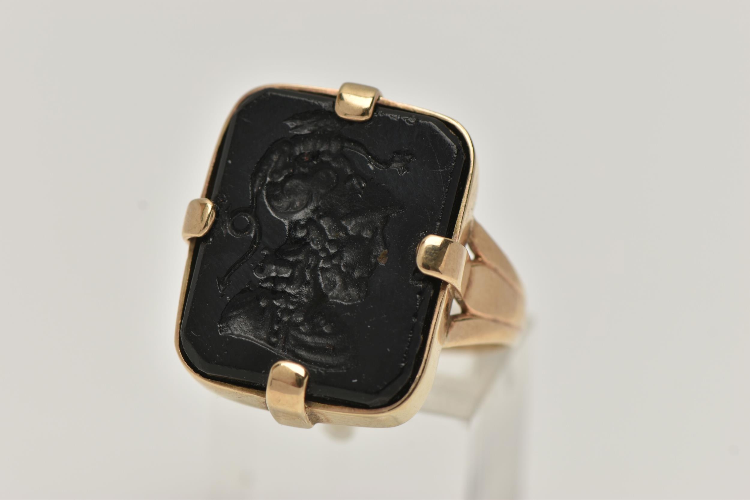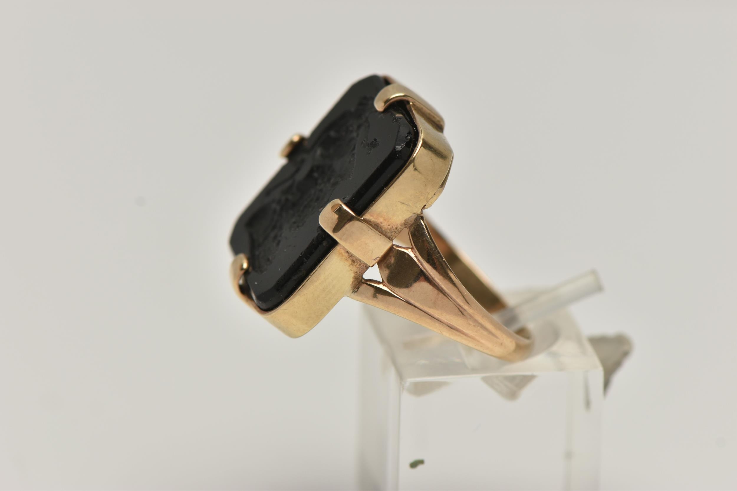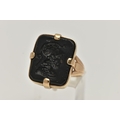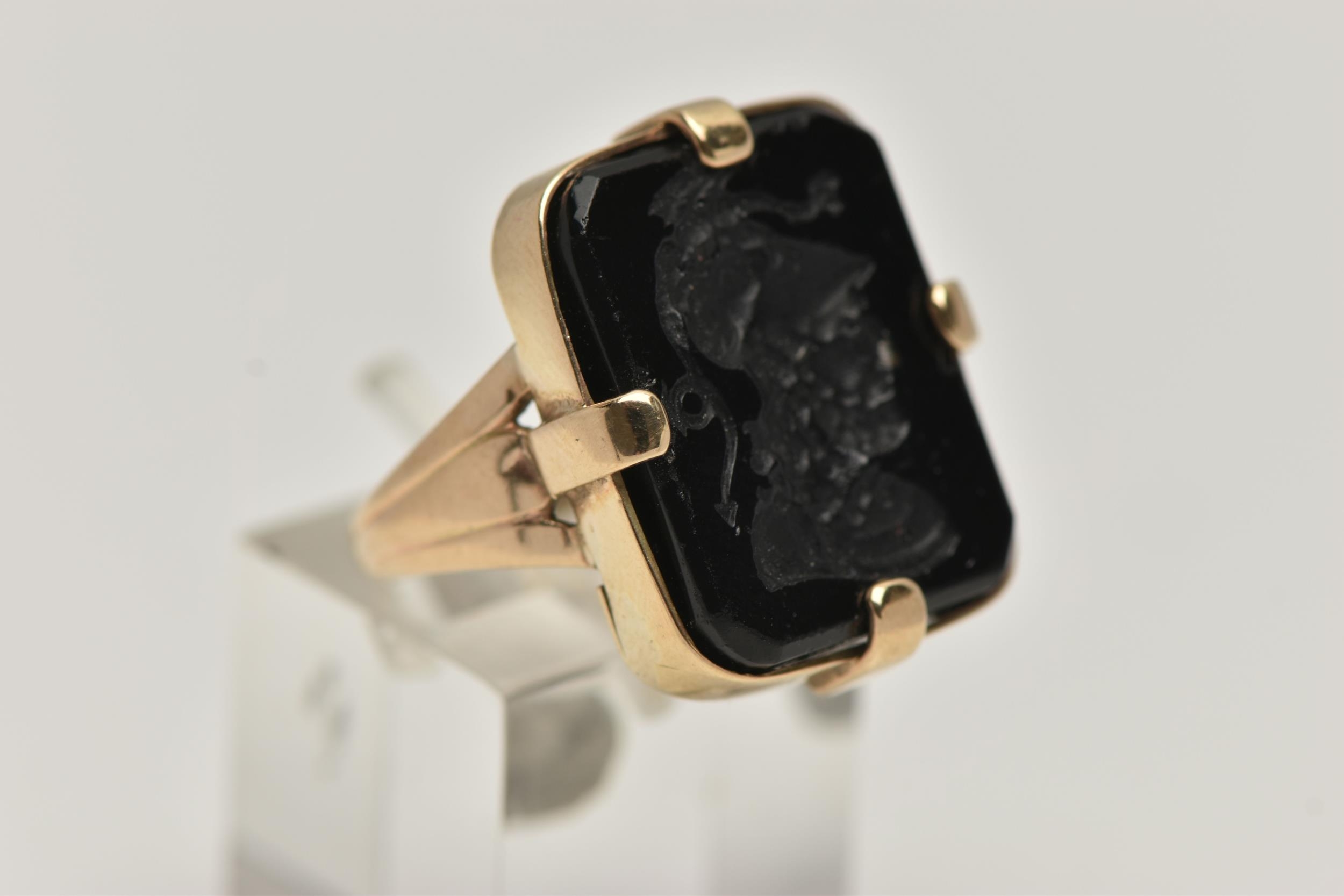 A YELLOW METAL INTAGLIO RING, rectangular onyx intaglio depicting a soldier in profile, four claw set in a yellow metal mount and polished band, rubbed 9ct stamp, ring size P, approximate gross weight 8.0 grams (condition report: general wear, some small nibbles to the egdes, possible resize to the band, overall condition good)