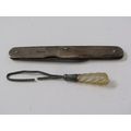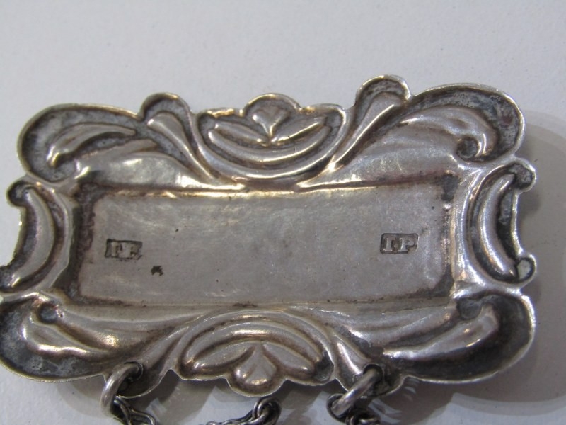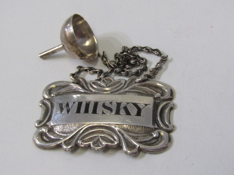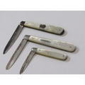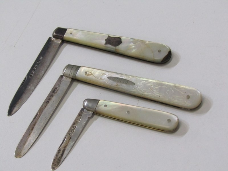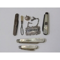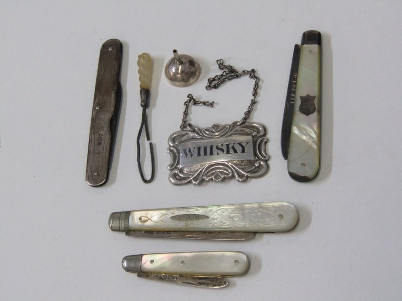SILVER BLADED POCKET KNIVES, 3 silver bladed and mother of pearl decorated pocket knives, varying sizes, a silver cased pocket watch, a Georgian silver 'whisky' decanter label, chain af, funnel etc.