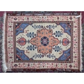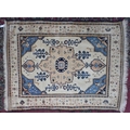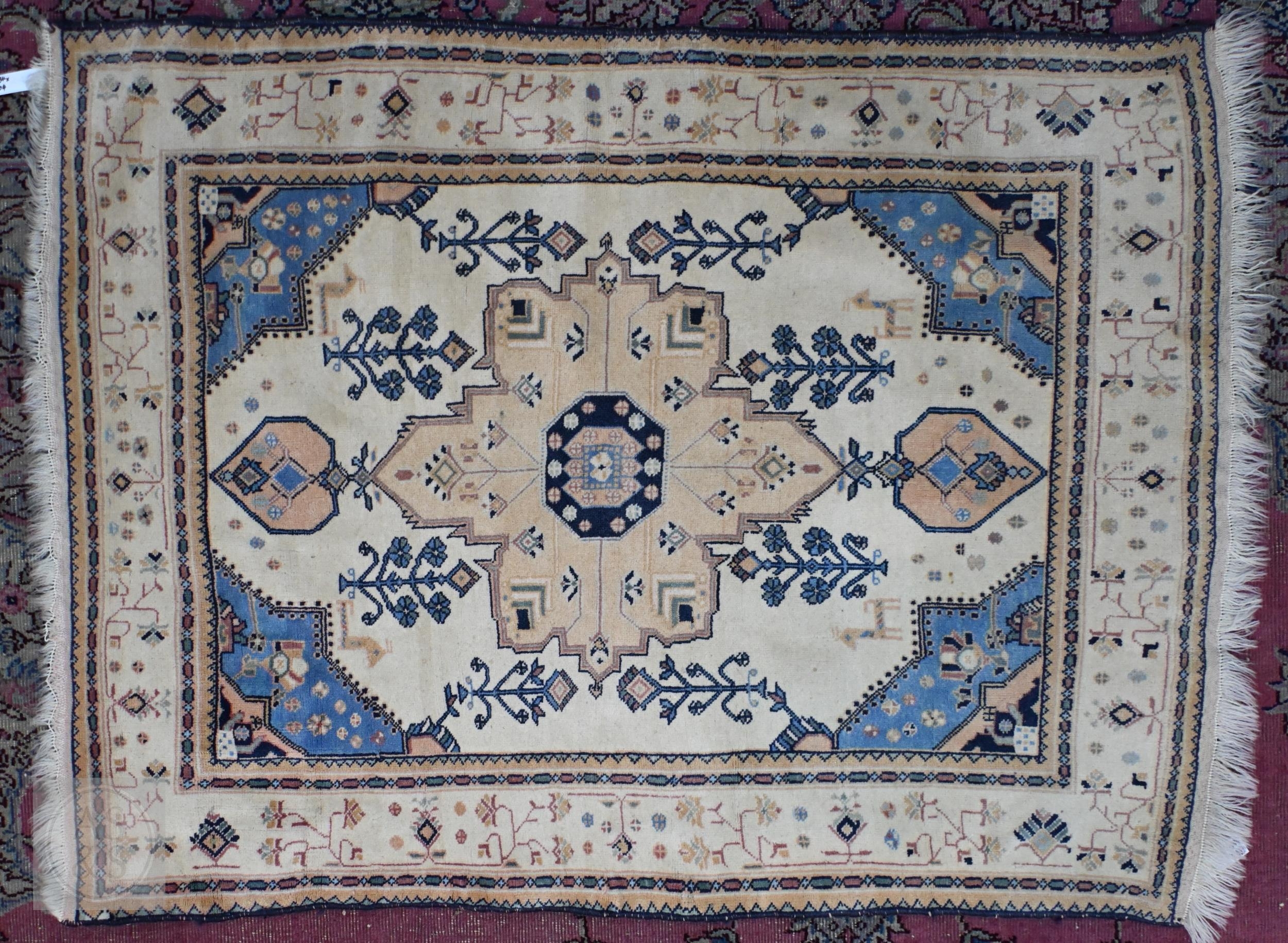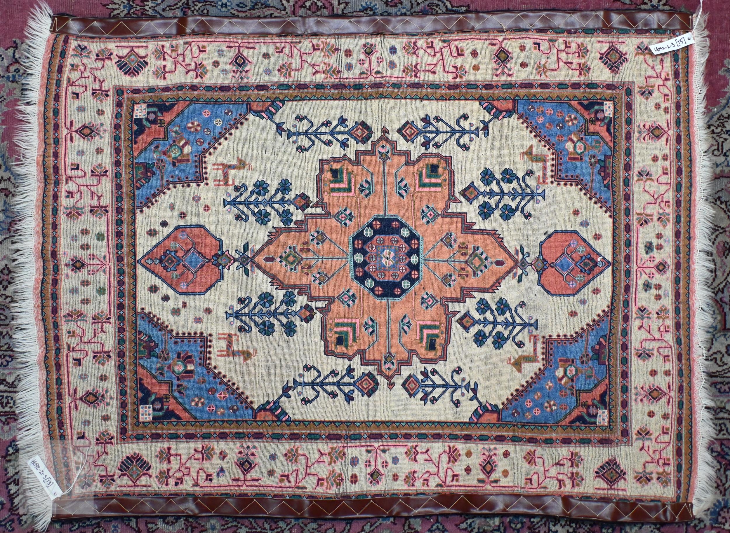 A contemporary Persian washed sand ground rug, the central lozenge design surrounded by flora and fauna, 134 cm x 104 cm