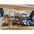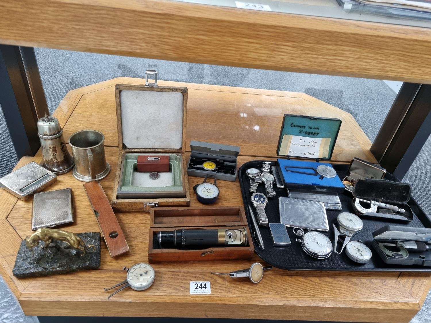 A vintage lot to include levels, engineering gauges, silver plated items, watched, a vintage Nero Lamania stopwatch, etc