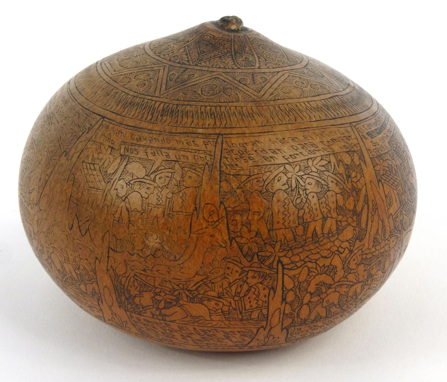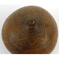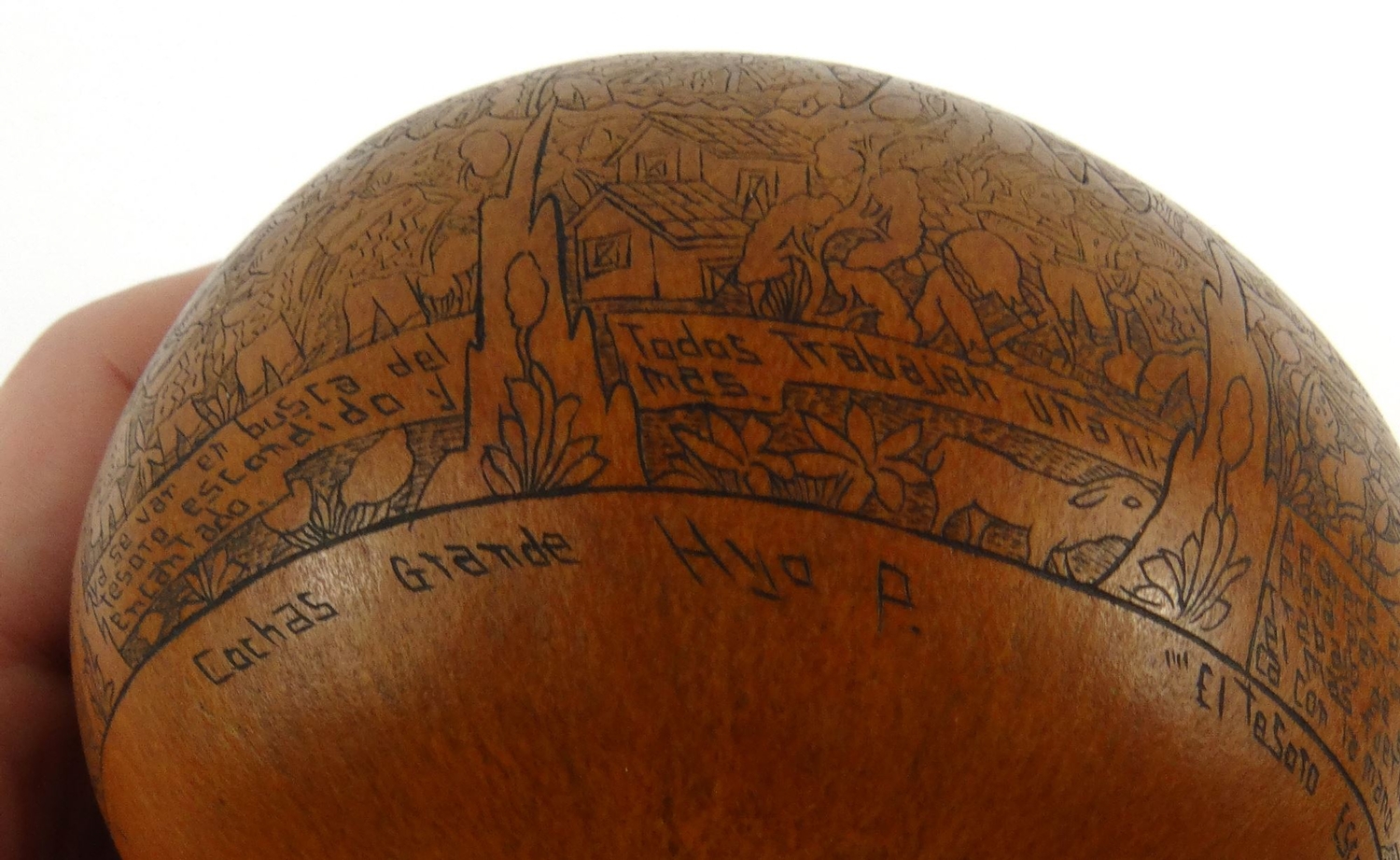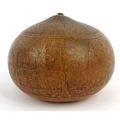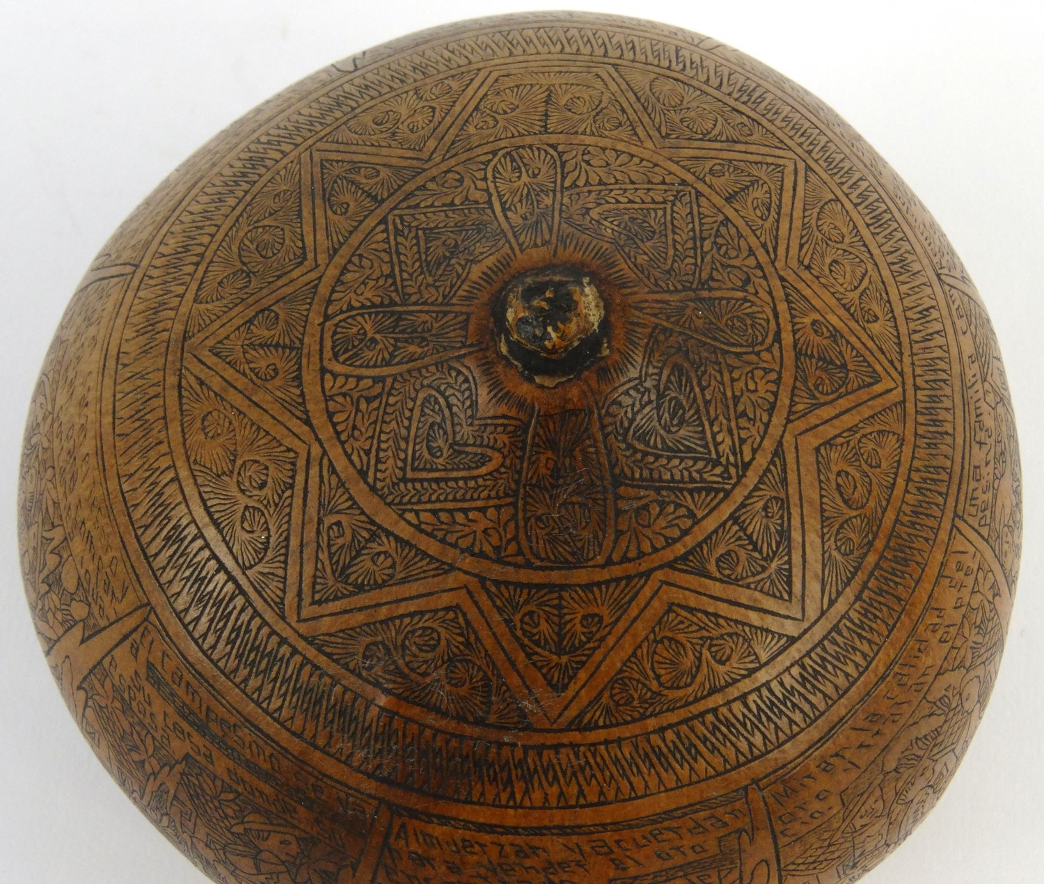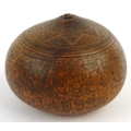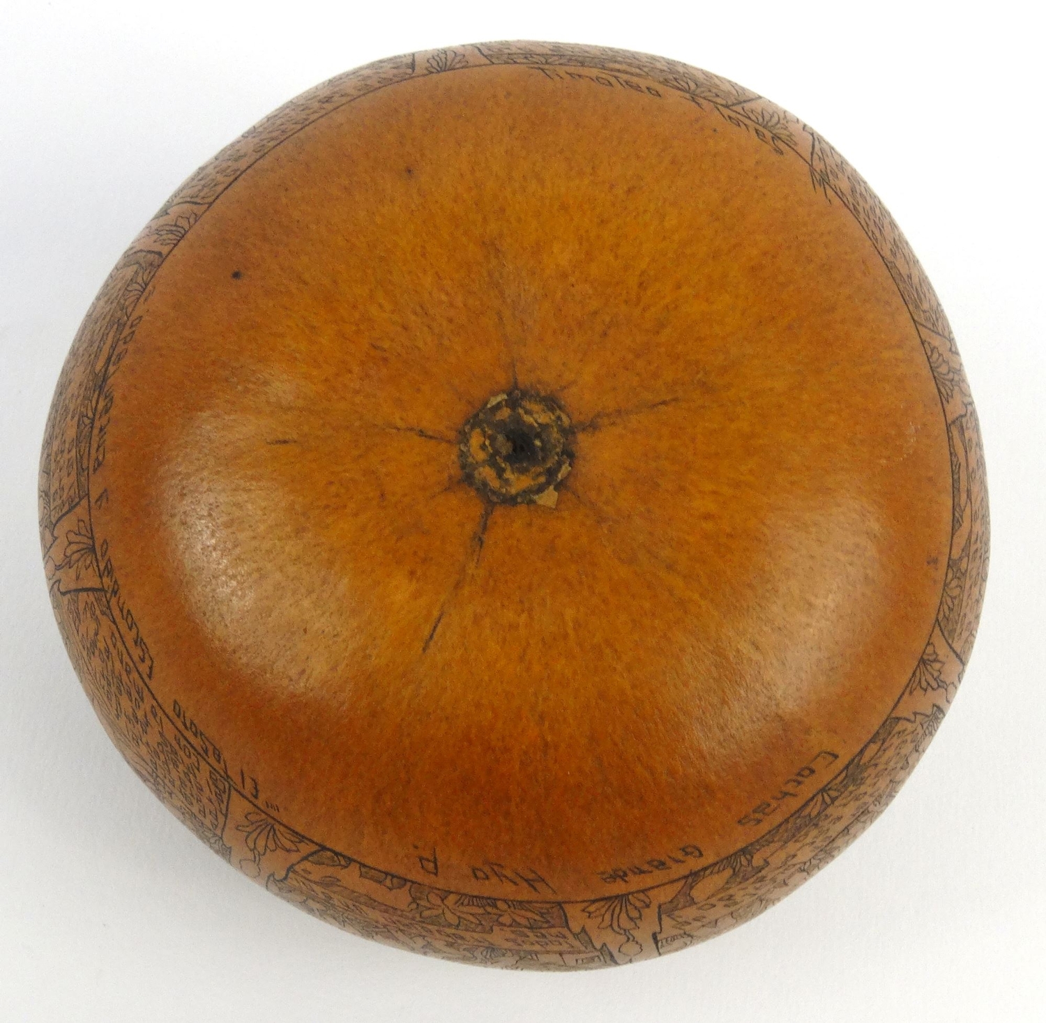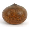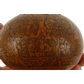 Victorian penwork nut with scenes of storytelling, 10cm diameter