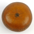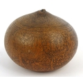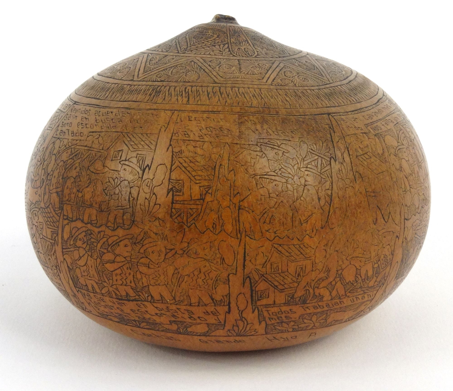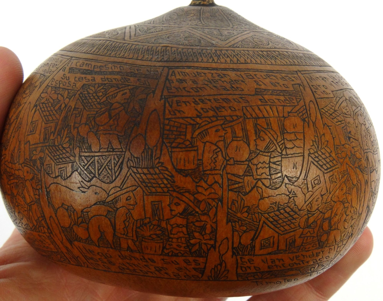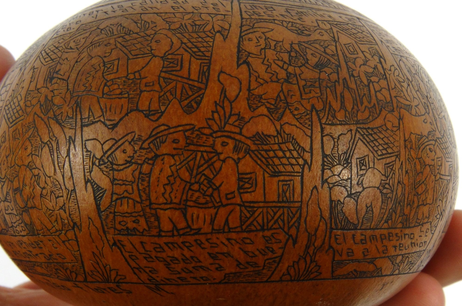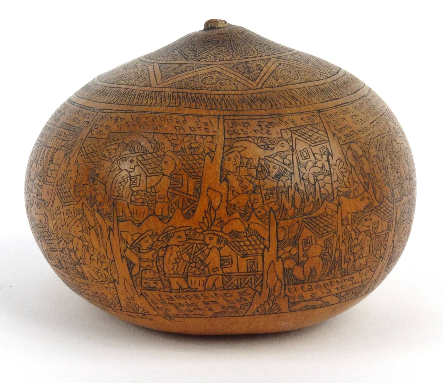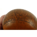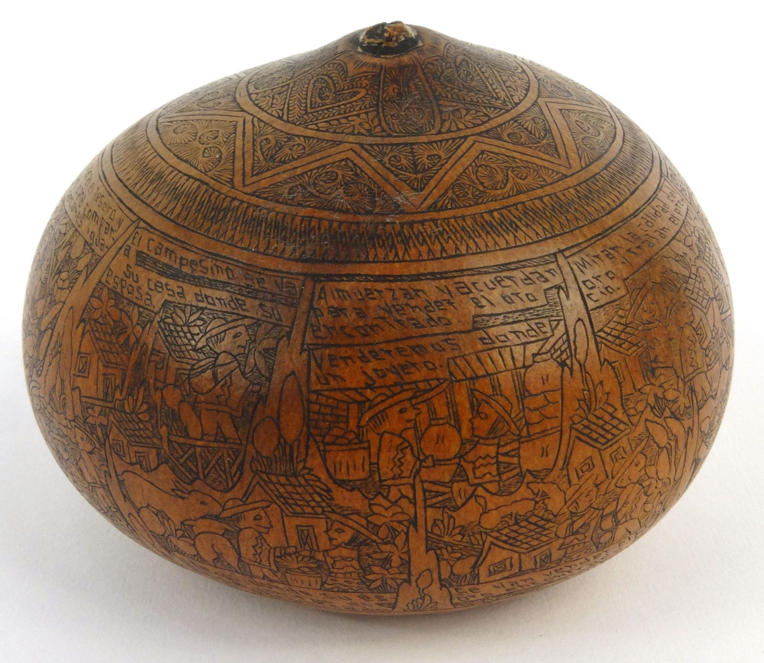 Victorian penwork nut with scenes of storytelling, 10cm diameter