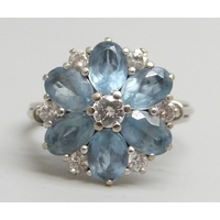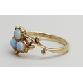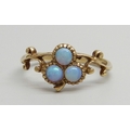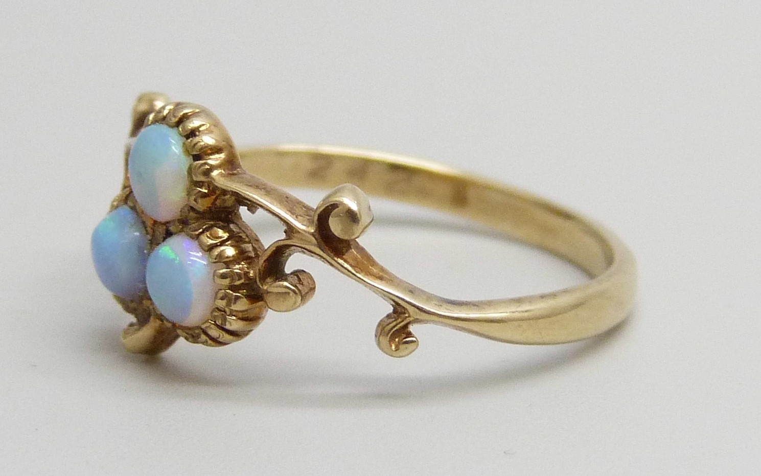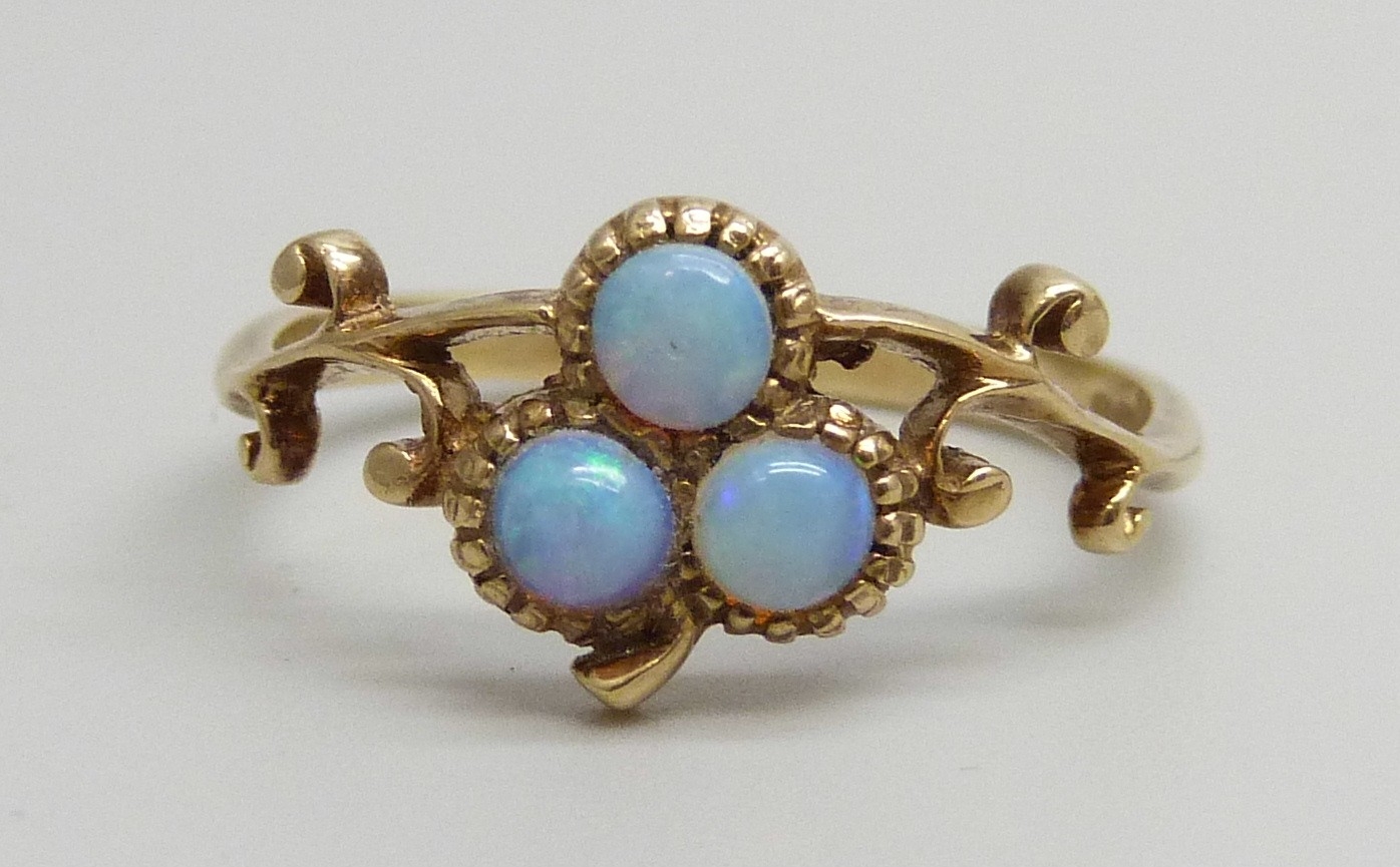 A 9ct gold and opal three stone ring, 1.8g, M