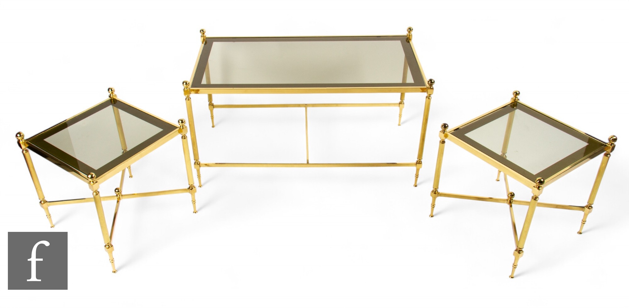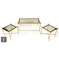 In the manner of Maison Jansen - A set of three 1970s gilt metal and glass occasional tables, with reeded tapered supports with tiered glass panels, largest height 46cm, length 87cm and depth 45cm. (3)