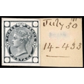 1870-80 3d rose plate 14, striking book piece in black on white glazed card with void corner letters mounted on piece of original page, annotated â??July 30/14-433â??. Fine. SG 143