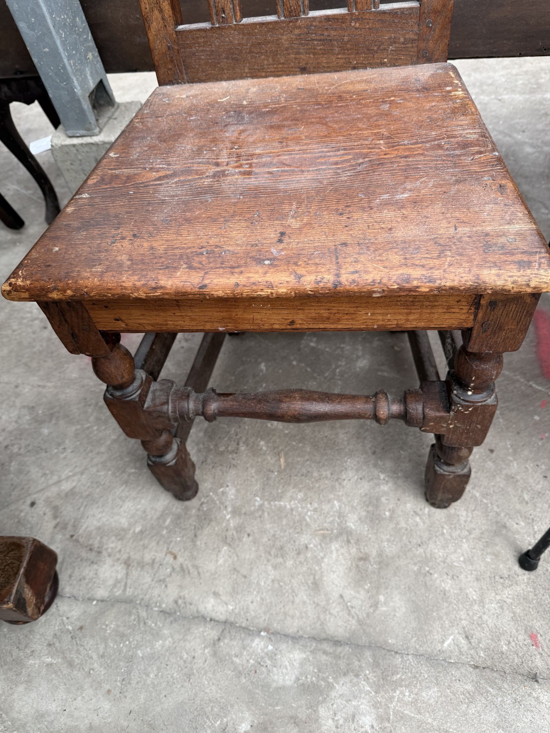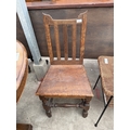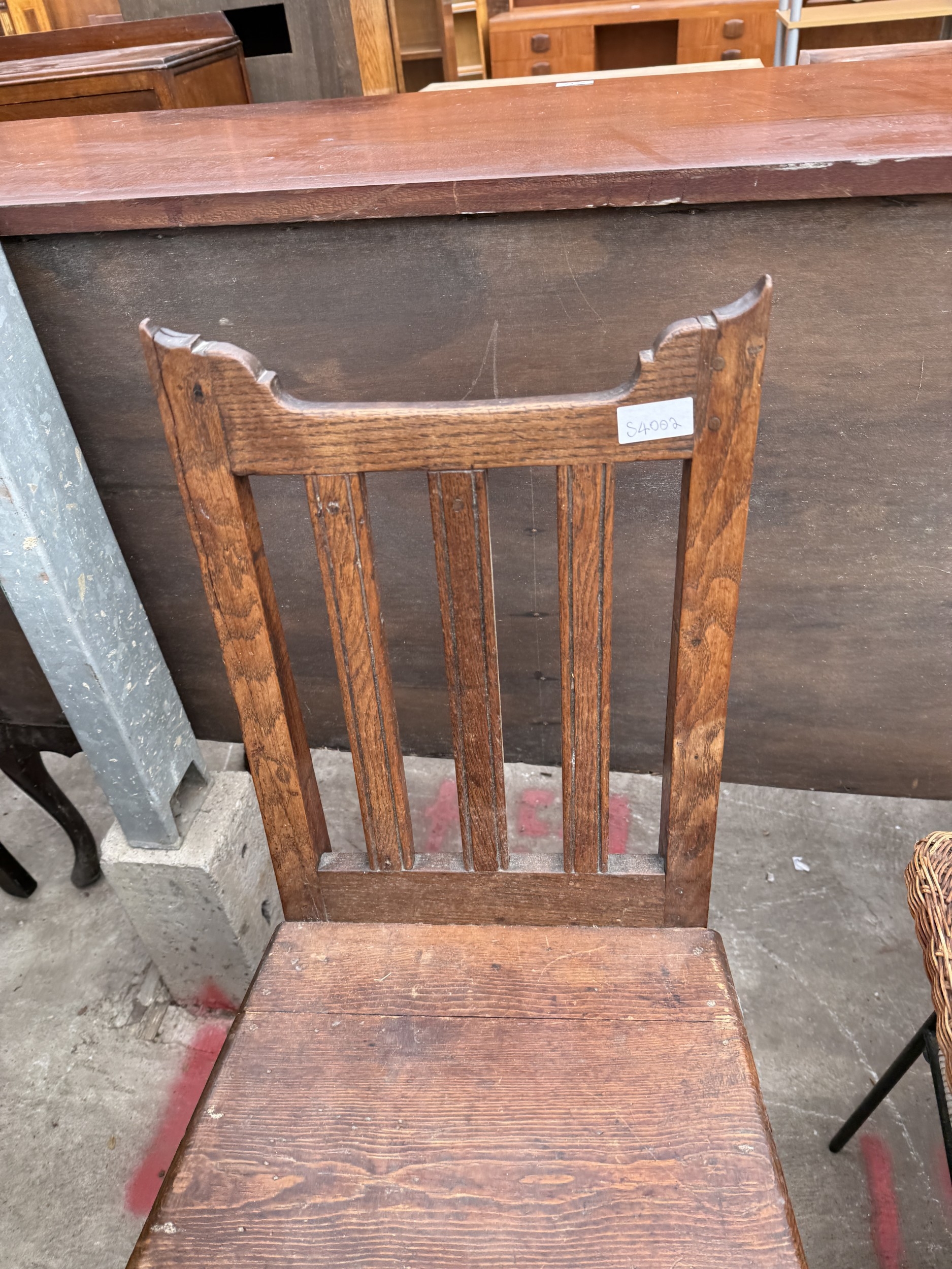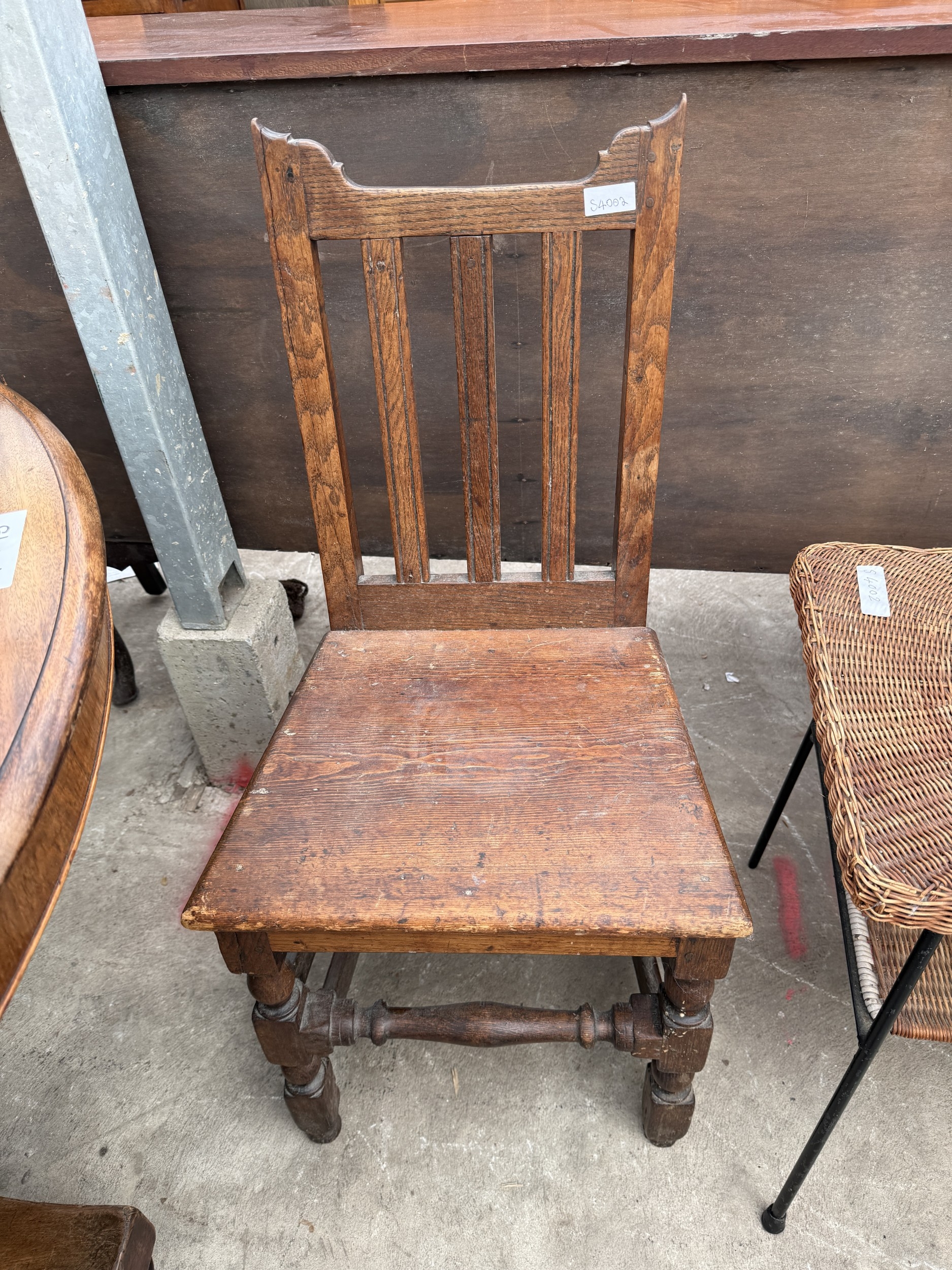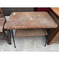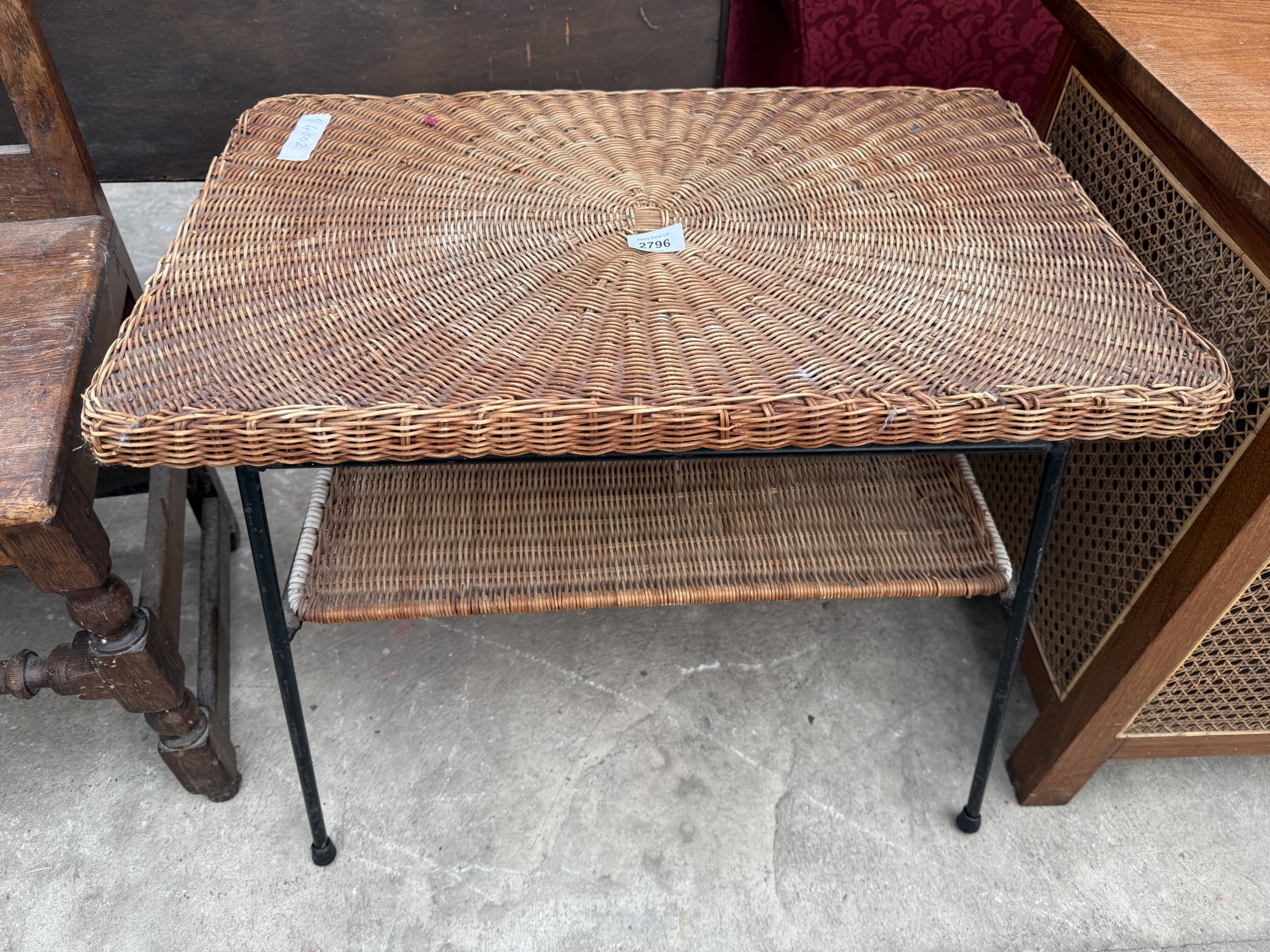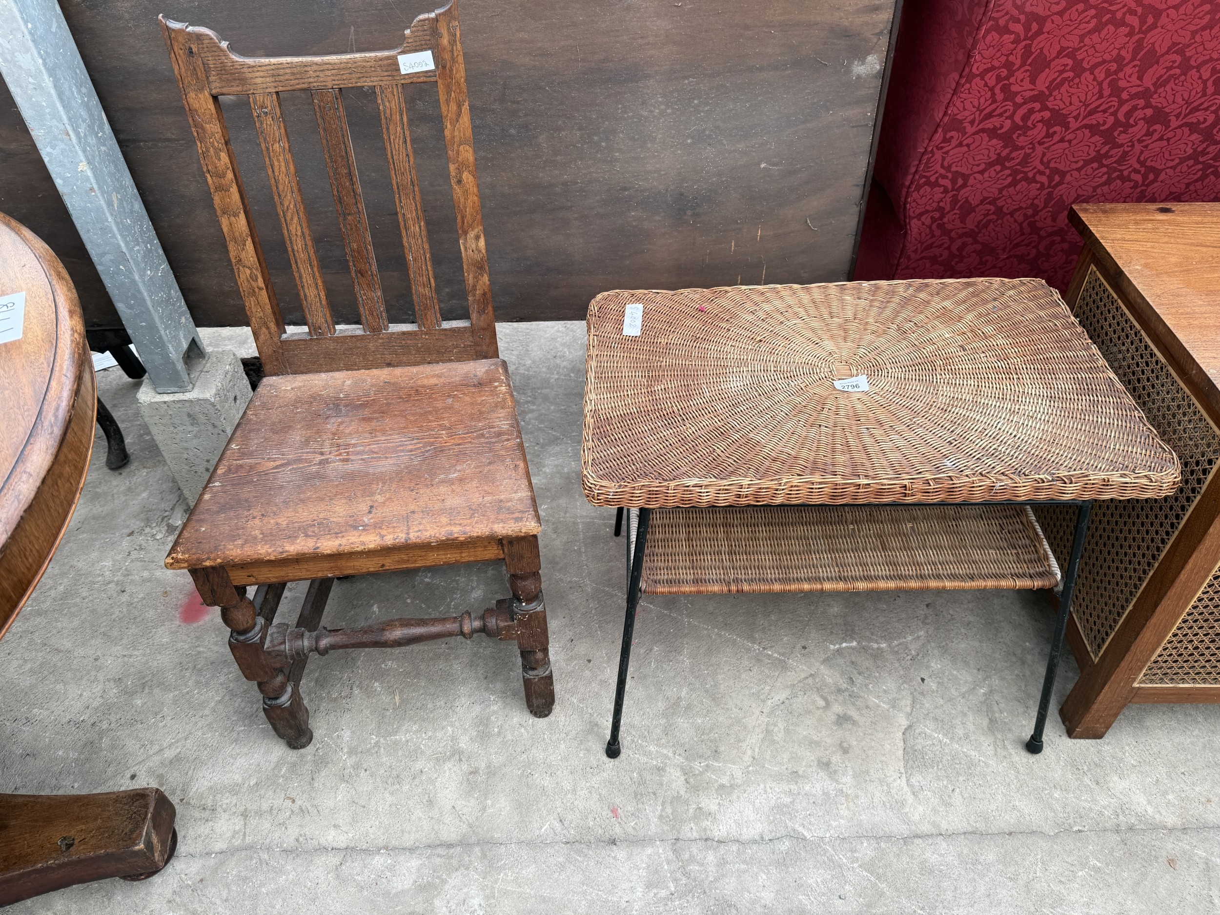 A TWO TIER WICKER COFFEE TABLE ON METALWARE FRAME AND AN OAK AND PINE COUNTRY CHAIR