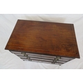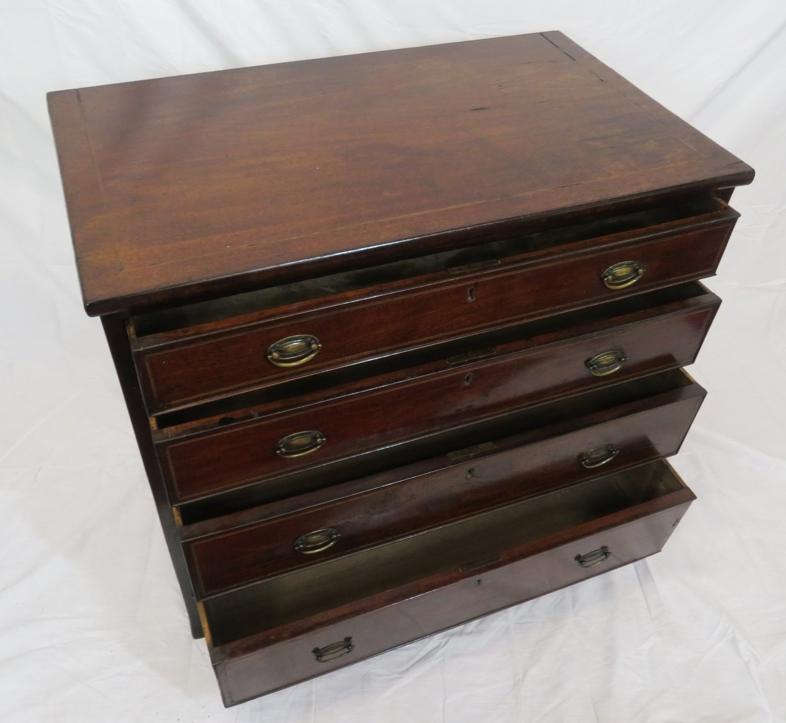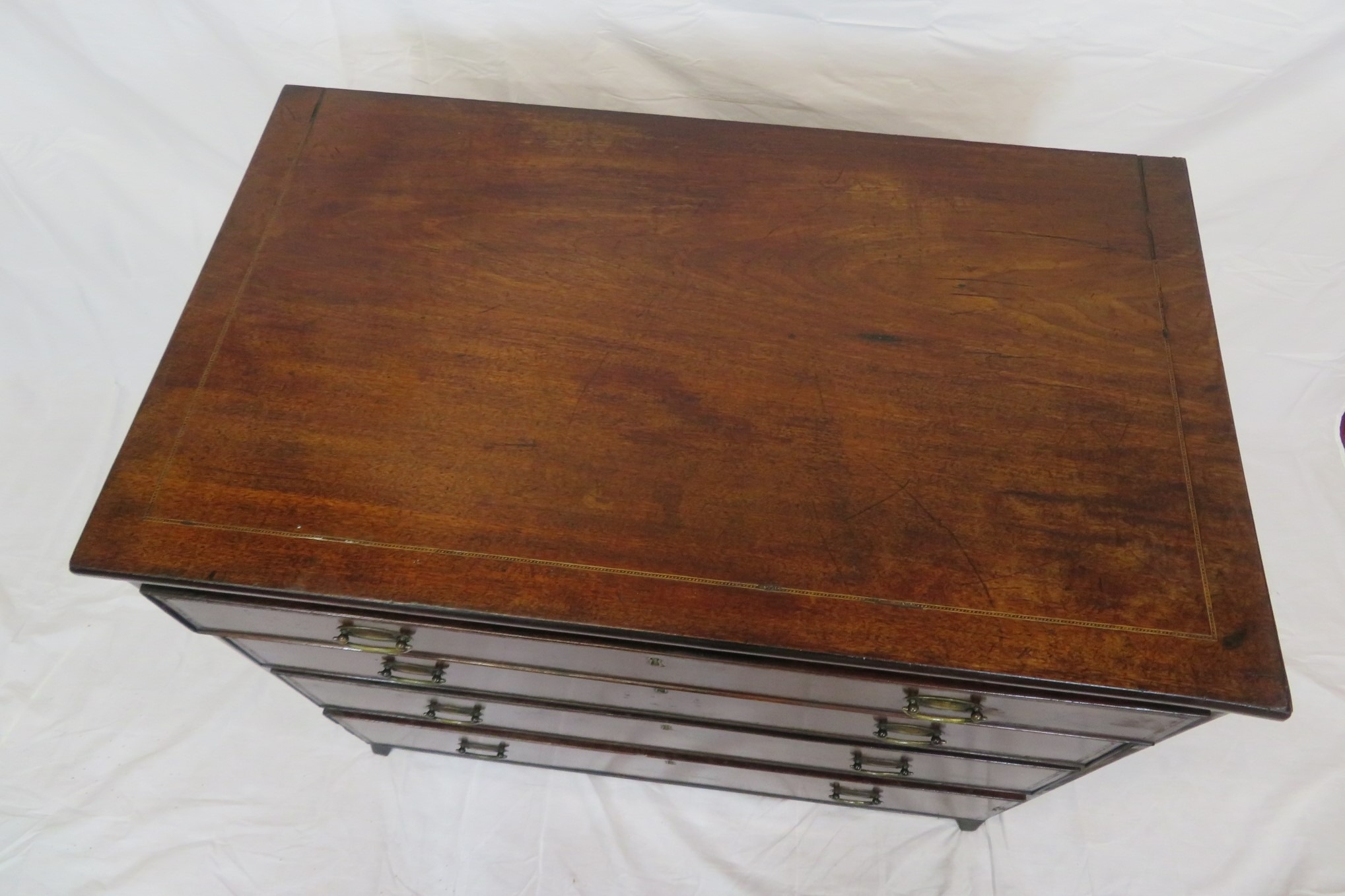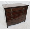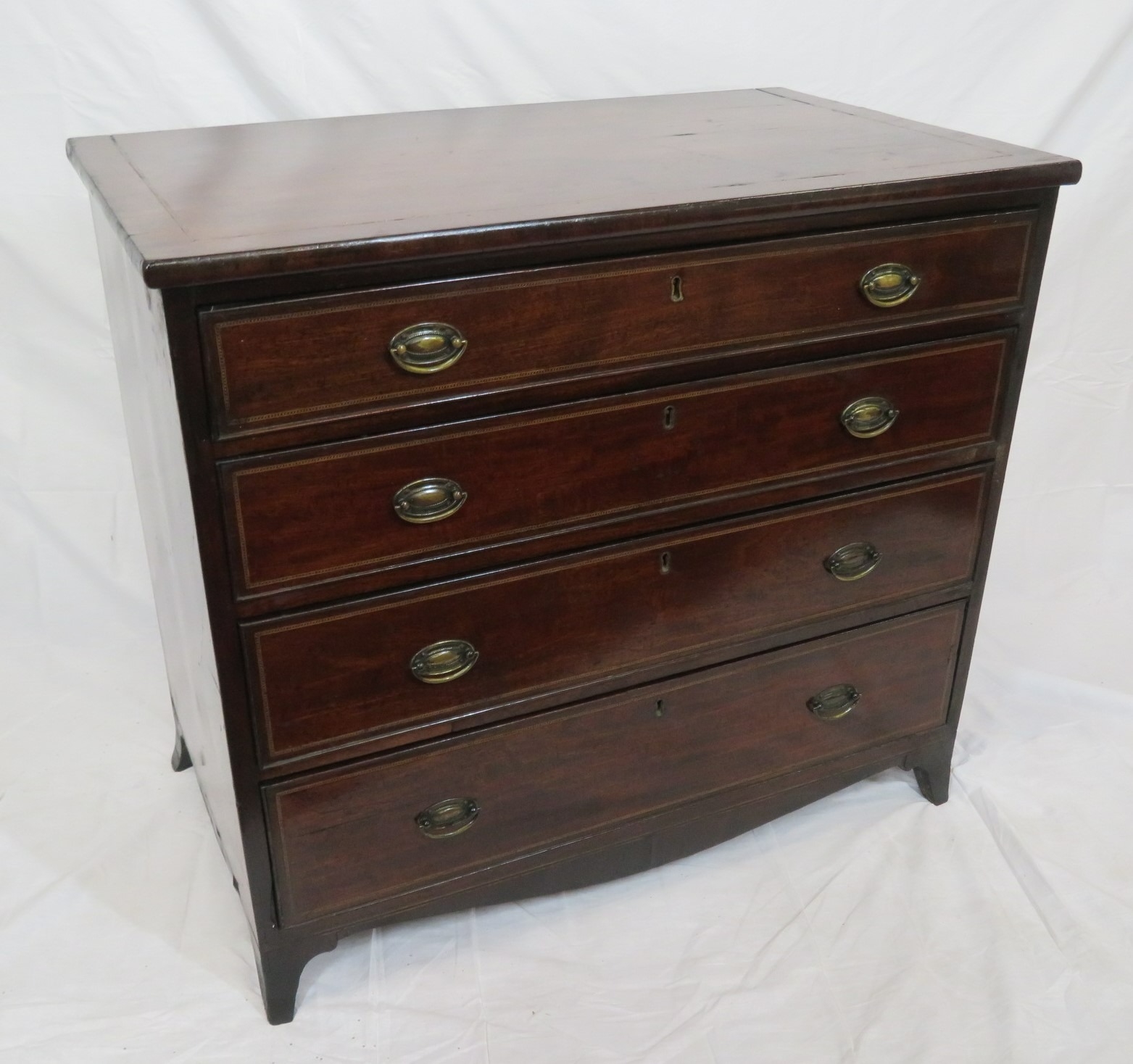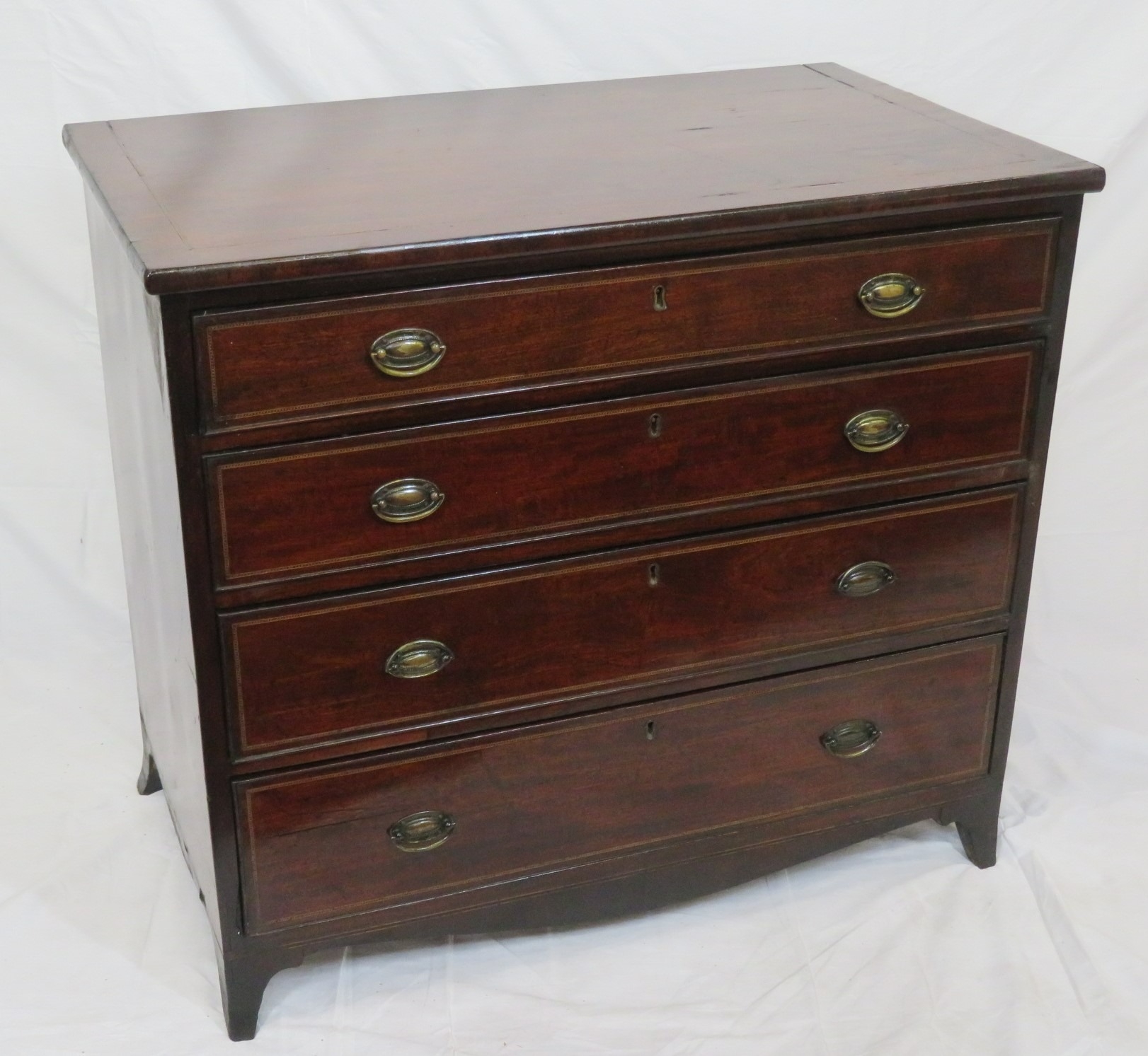 Edwardian inlaid mahogany chest of four graduating drawers with oval brass drop handles, on bracket feet