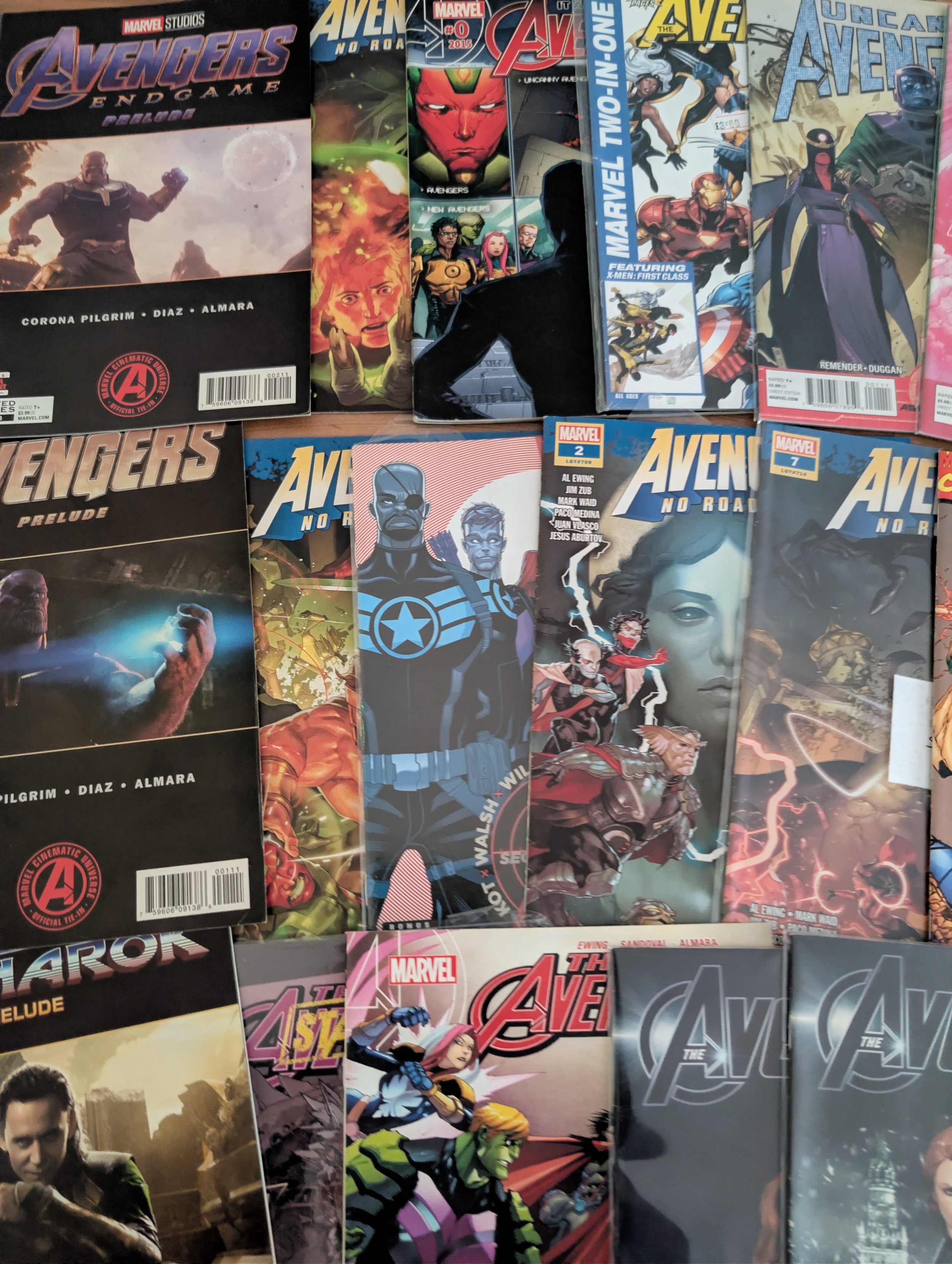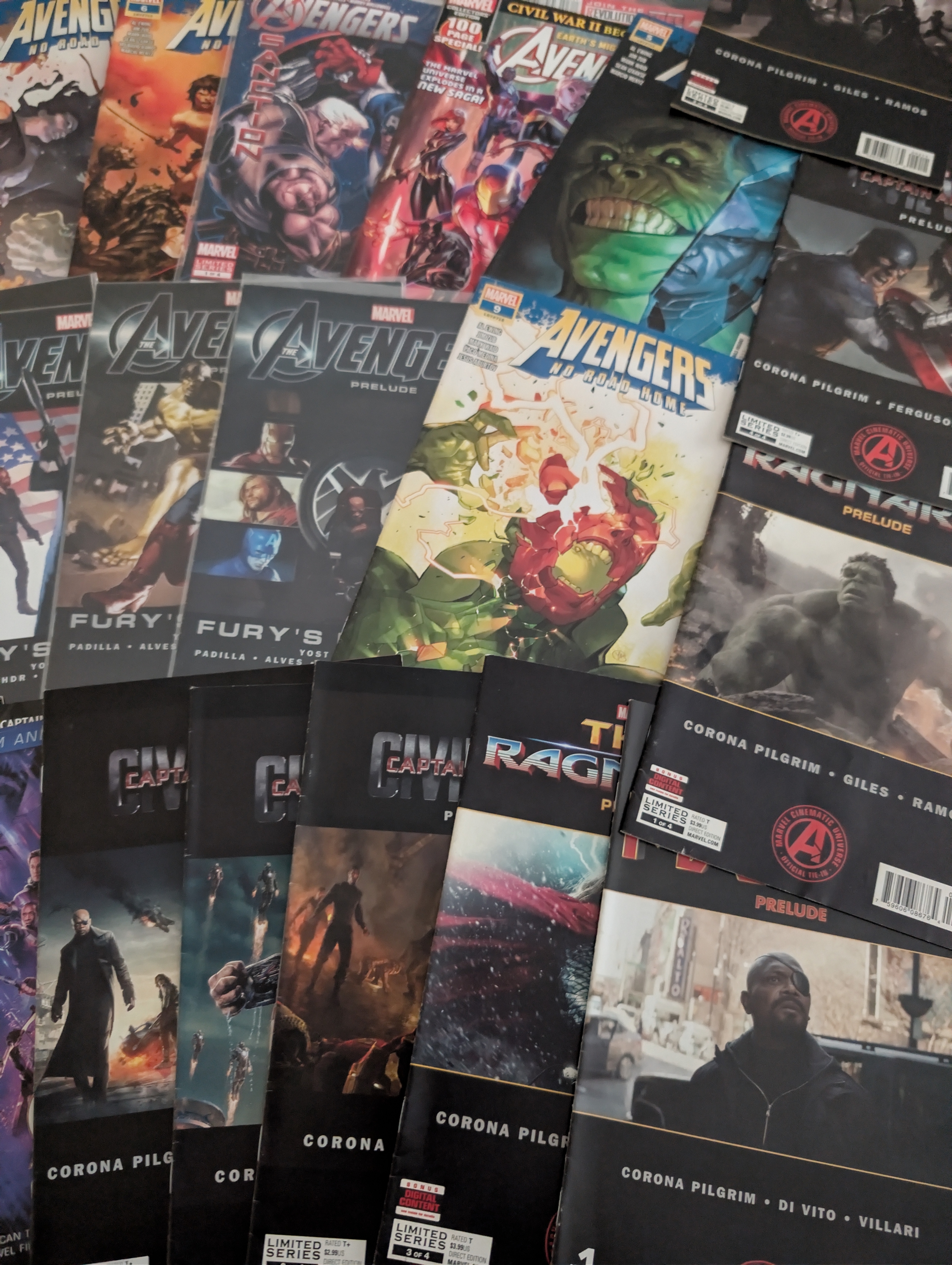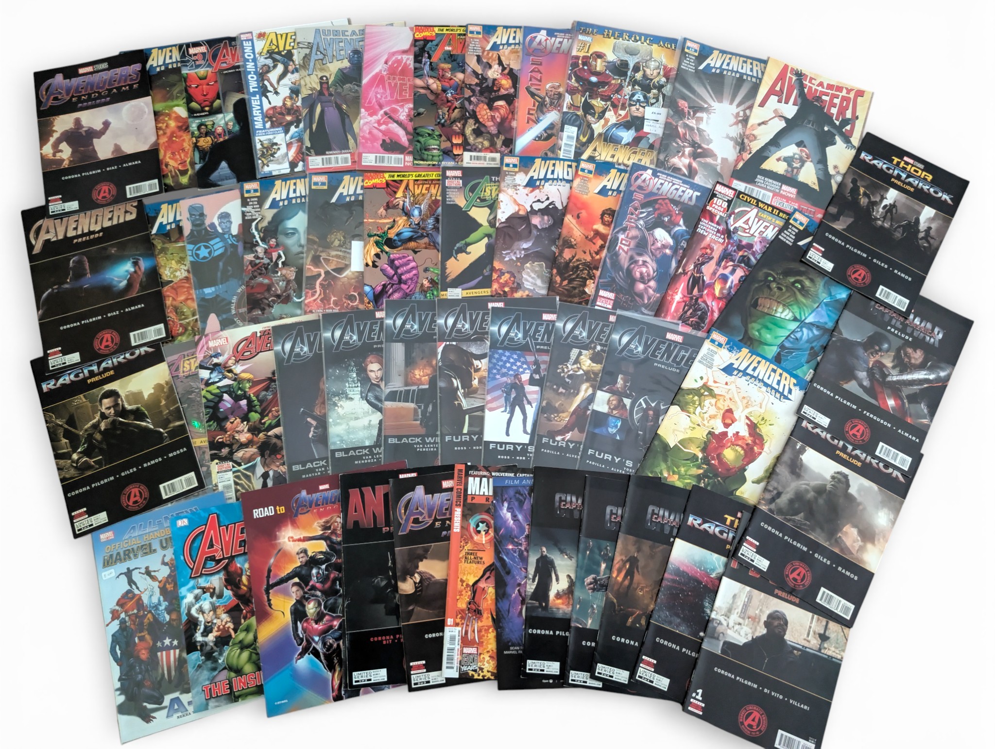 Large mixed lot of modern Marvel Avengers comics including main Avengers titles, Avengers Prelude issues, and multiple MCU tie-in publications such as Avengers, Age of Ultron, Civil War, Ragnarok and related film preludes