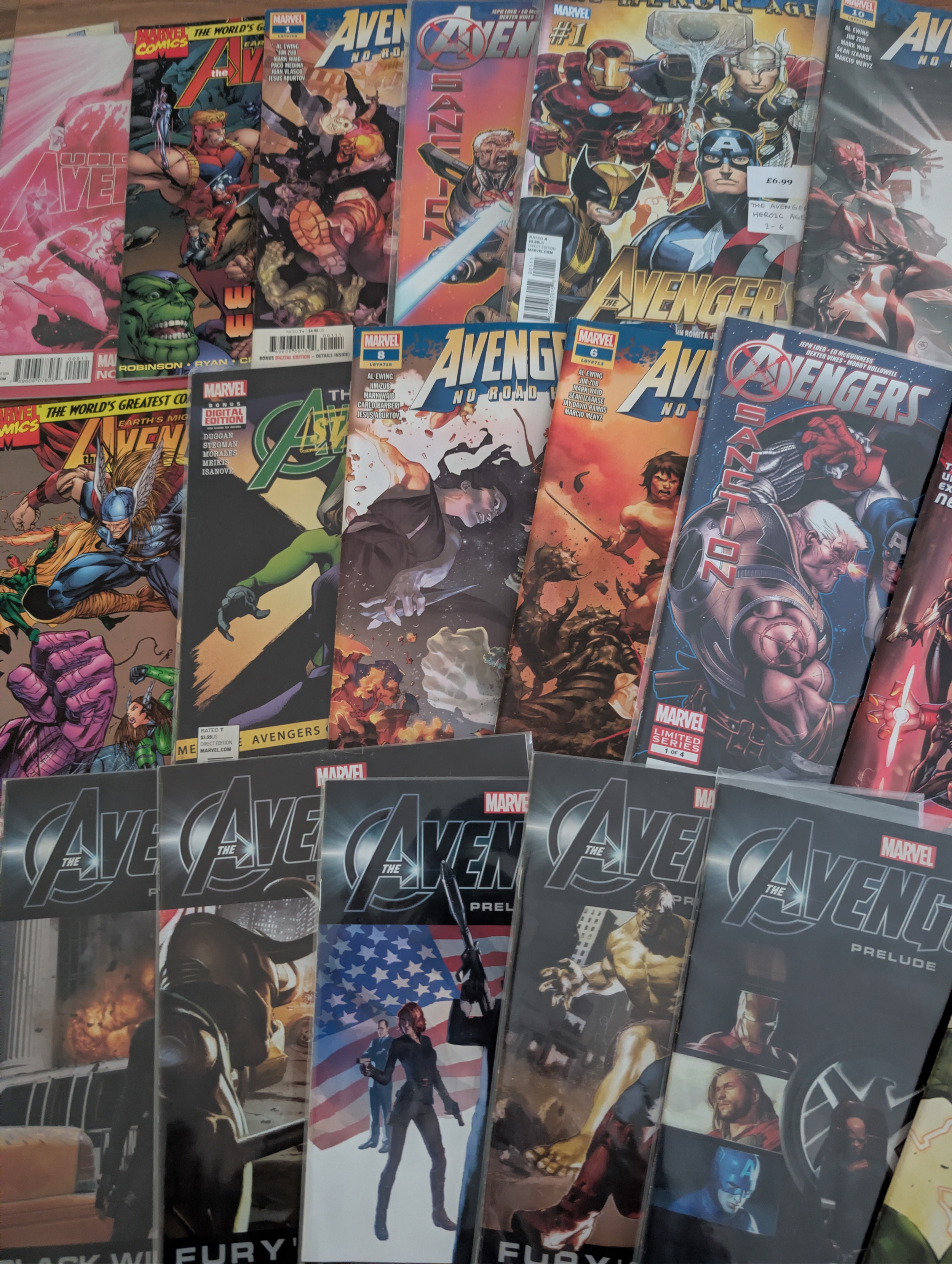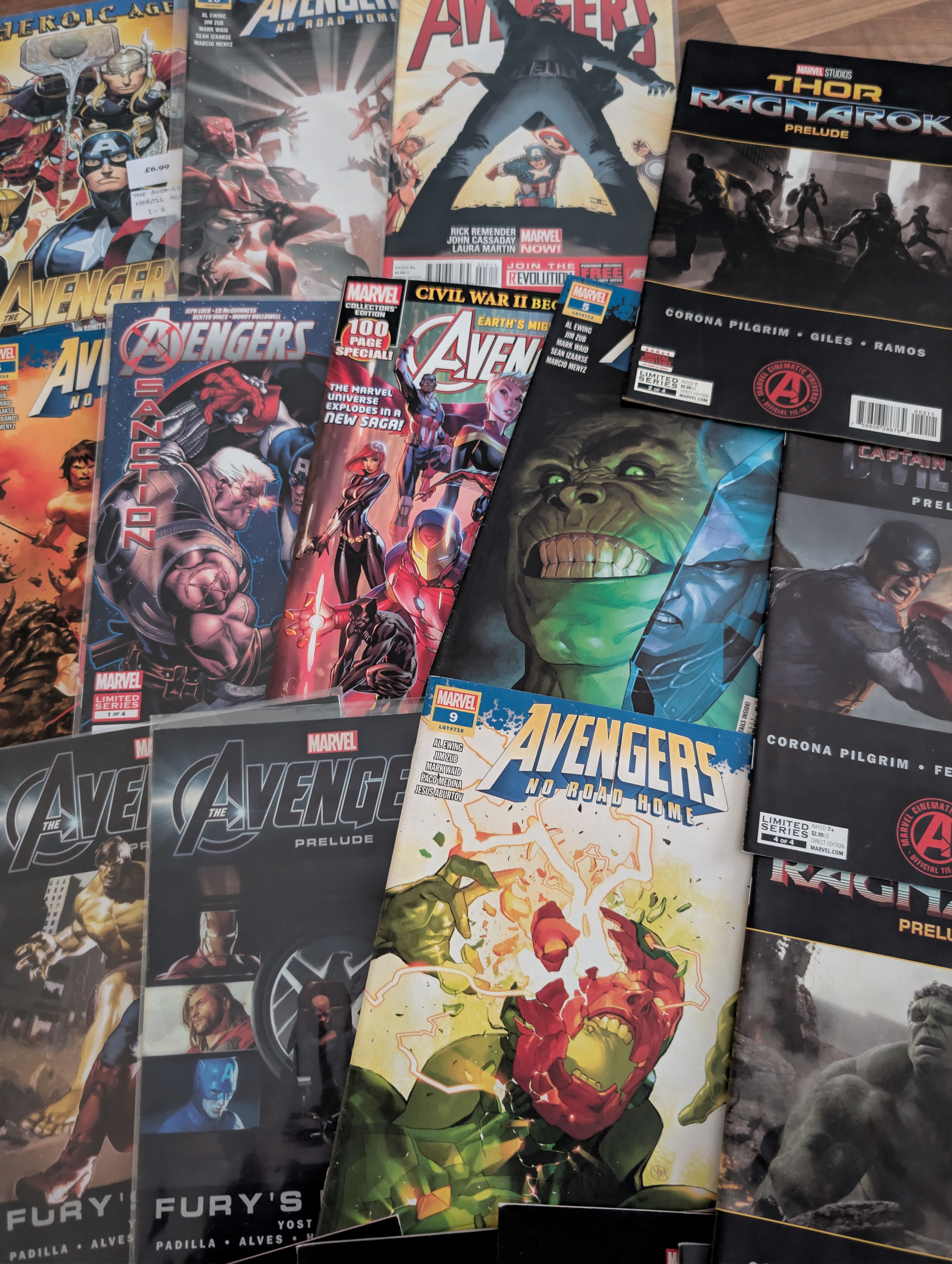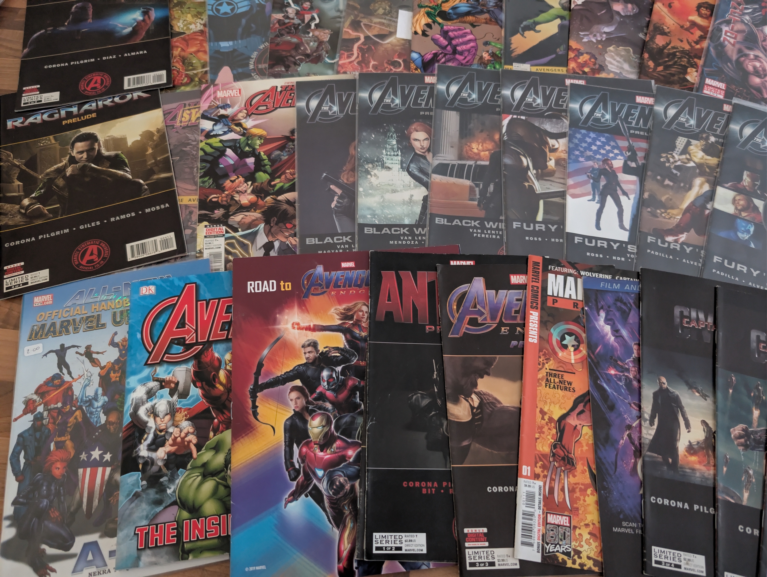 Large mixed lot of modern Marvel Avengers comics including main Avengers titles, Avengers Prelude issues, and multiple MCU tie-in publications such as Avengers, Age of Ultron, Civil War, Ragnarok and related film preludes