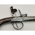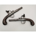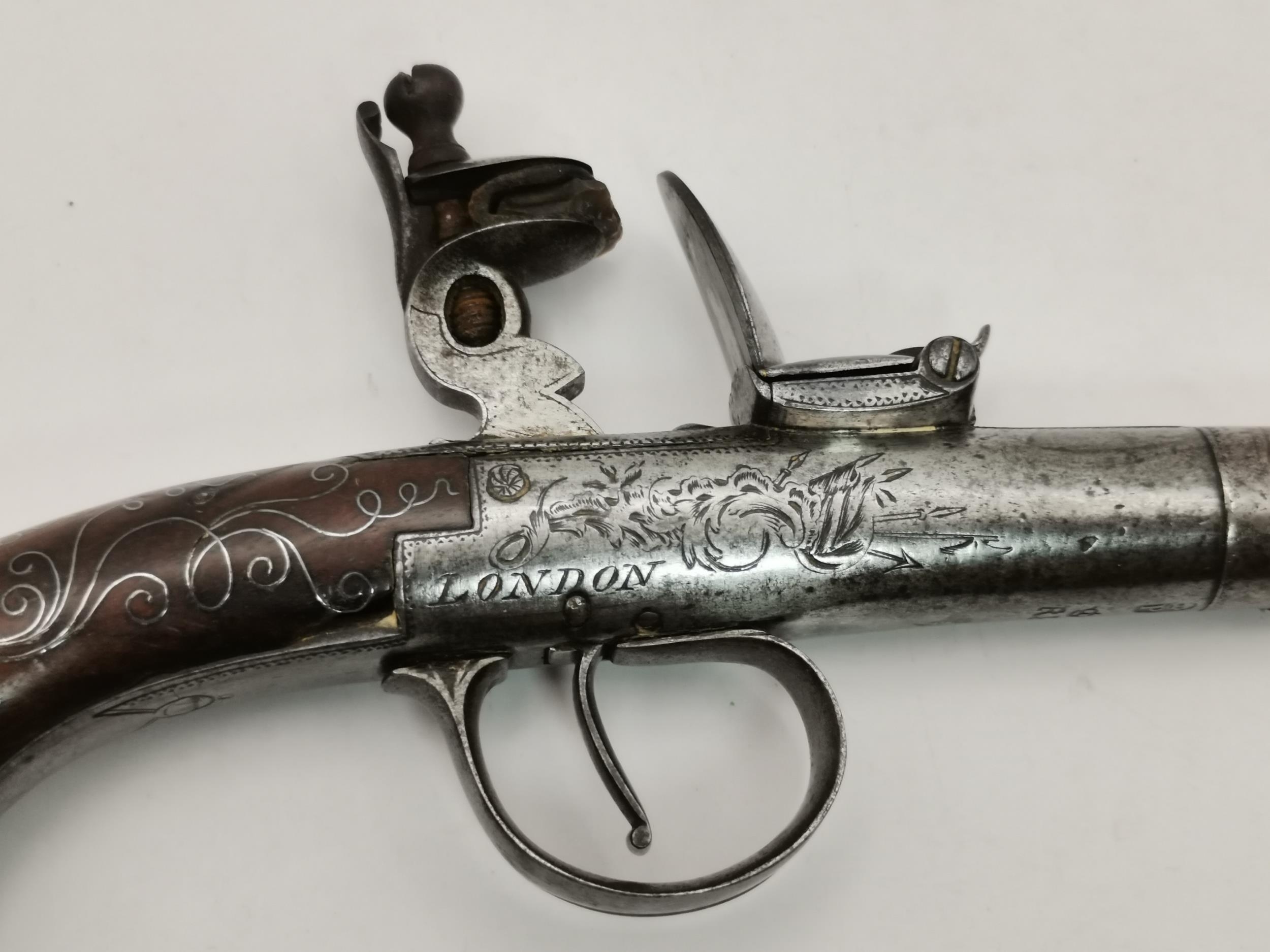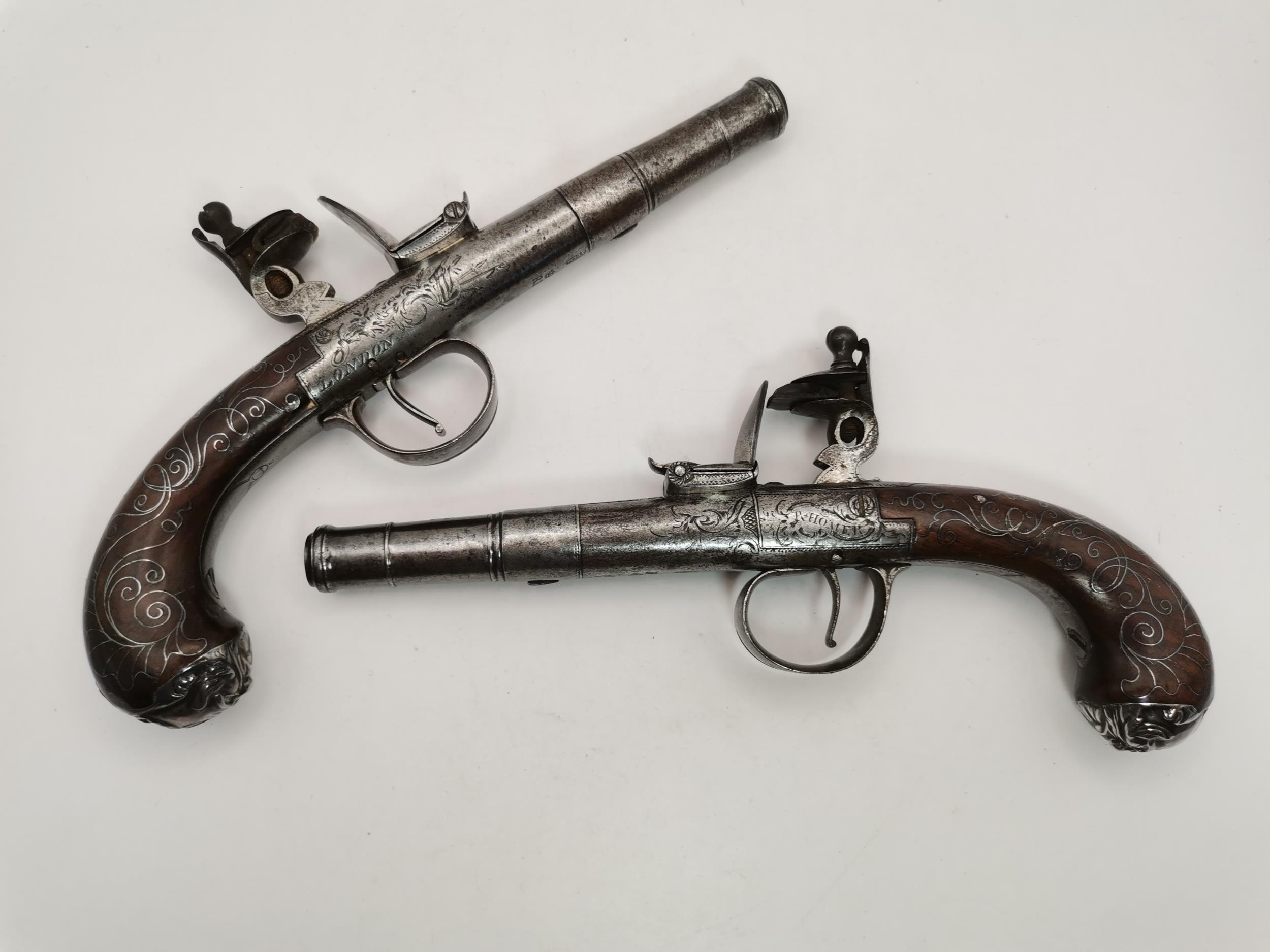 A fine pair of mid-18th Century "Queen Anne" travelling flintlock pistols, the lockplates with foliate engraving and signed R HOMER LONDON, the 6.3cm turn-off cannon barrels with proof marks, the bag butt to each with silver wire inlay, each silver butt cap repoussé with a shell-surmounted mask. (2) 21cm long overall