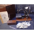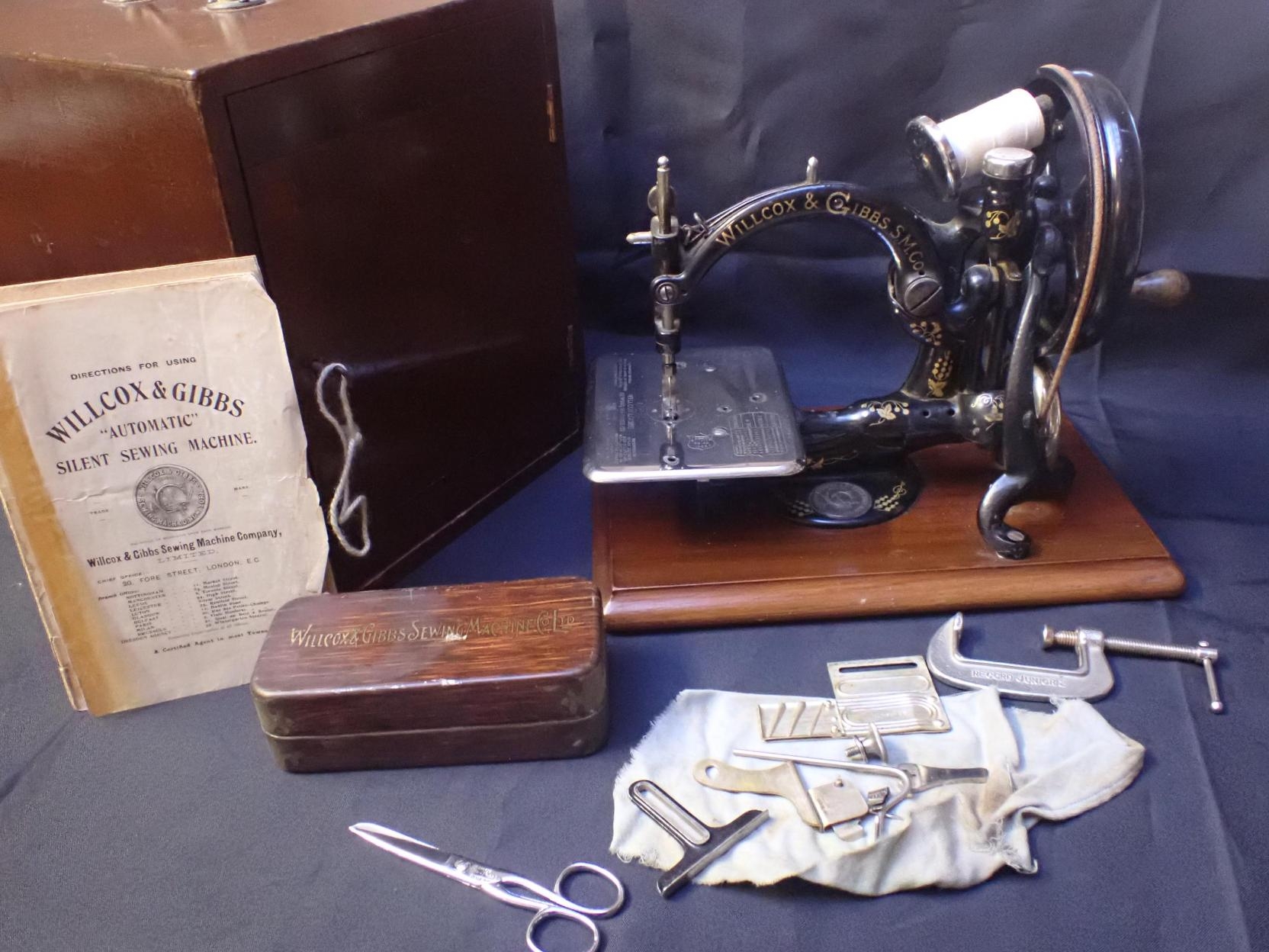 A LATE VICTORIAN SEWING MACHINE BY WILLCOX & GIBBS with grained effect accessories tin and instructions, in stained birch case with brass handle (with key)