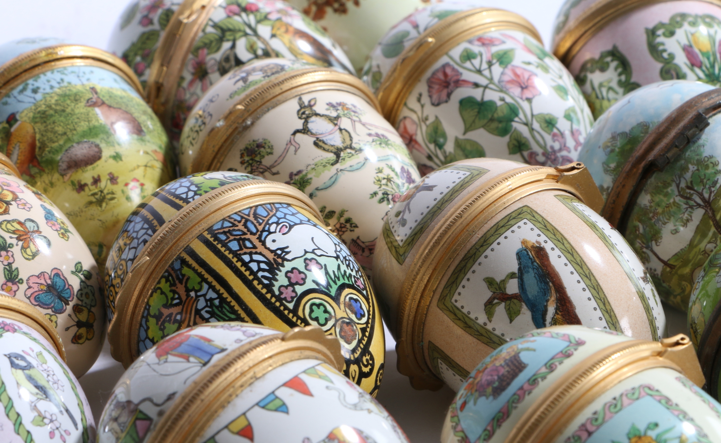 NINETEEN HALCYON DAYS BILSTON & BATTERSEA ENAMEL EASTER EGG BOXES. Various dates, no certificates (19).