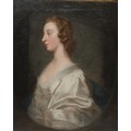 Portrait of a Lady, half-length and in profile to dexter, her ears jewelled with pearls, wearing a white and blue silk dress, within a feigned oval