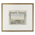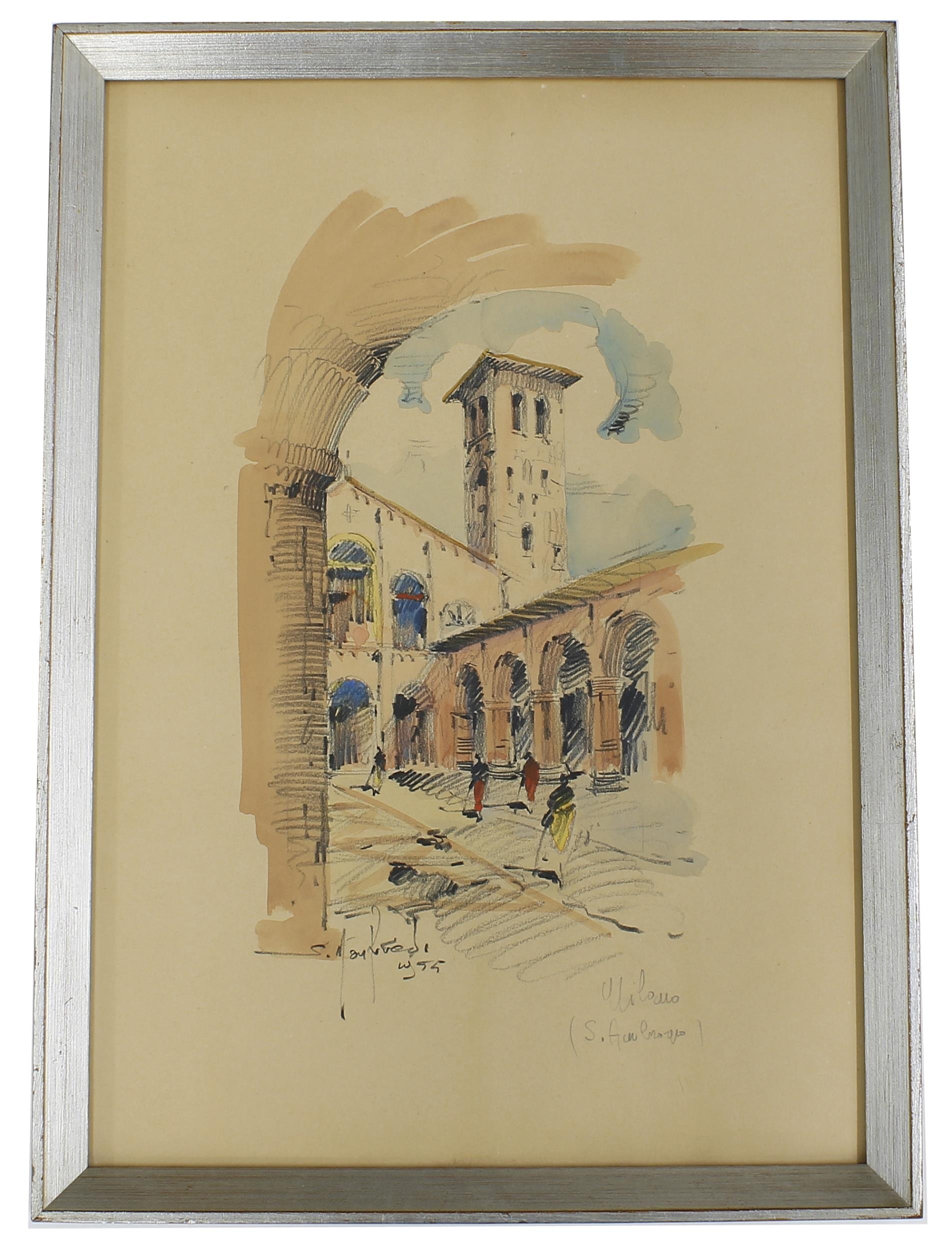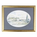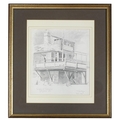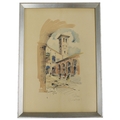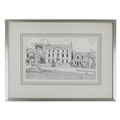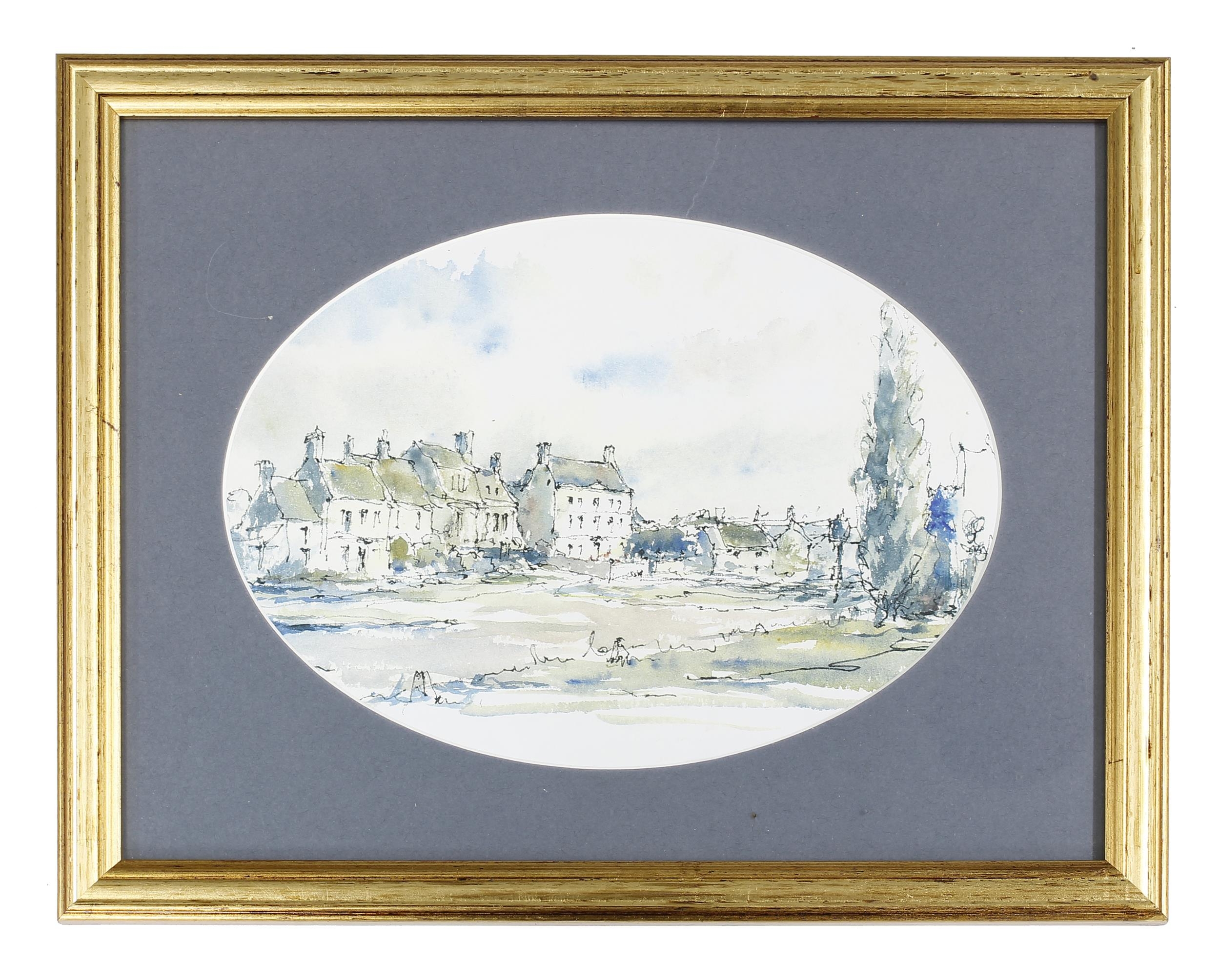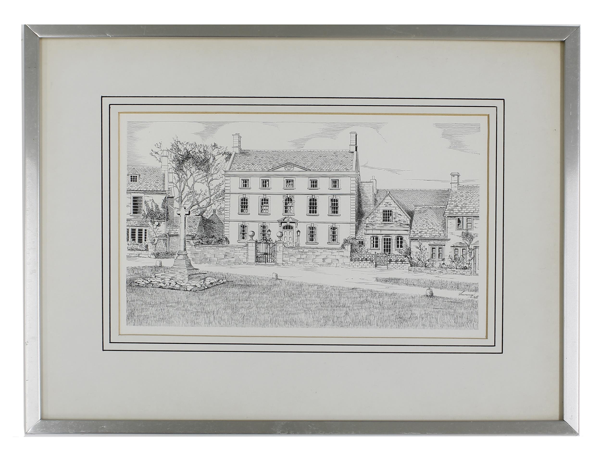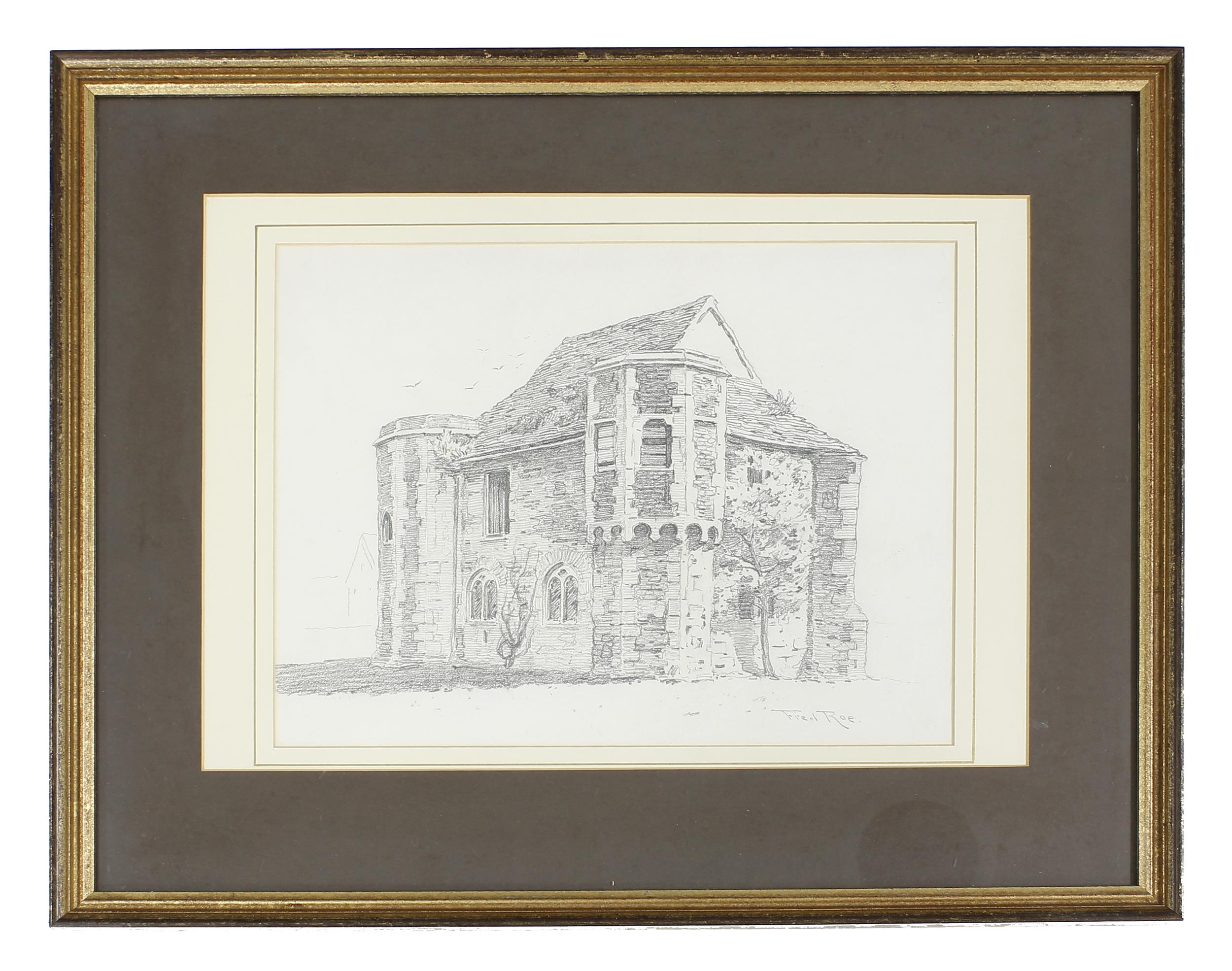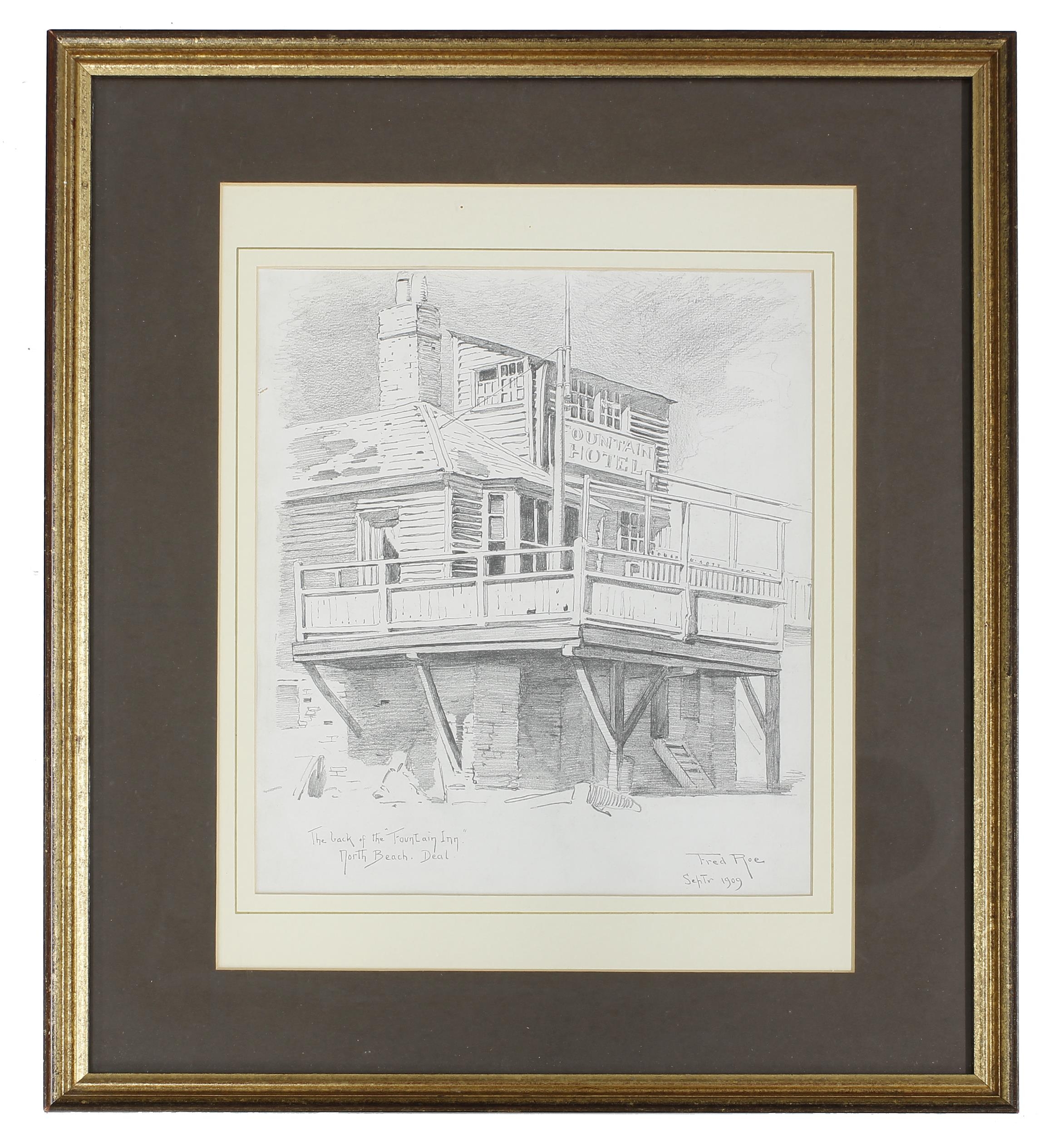Frederick (Fred) Roe (1864-1947) - '15th Century Parsonage House, Chesterton, Cambridgeshire in 1883', said to be signed and inscribed beneath the mount, also inscribed on a later label verso, pencil drawing, 10.25" x 12.75", also a companion 'The Back of the Fountain Inn, North Beach, Deal, Kent', signed, inscribed and dated September 1909, pencil drawing (a pair); together with five further pictures including two later engravings, Bath related, an oval pen, ink and watercolour showing Willow House and other houses in the village of Biddestone, Wiltshire, a further picture of Willow House and The Green, Biddestone bearing the name Lawrence Watts, a Continental scene with figures in a sunlit courtyard, indistinctly signed and dated 1955, possibly a tourist work, various sizes, each framed (7)