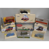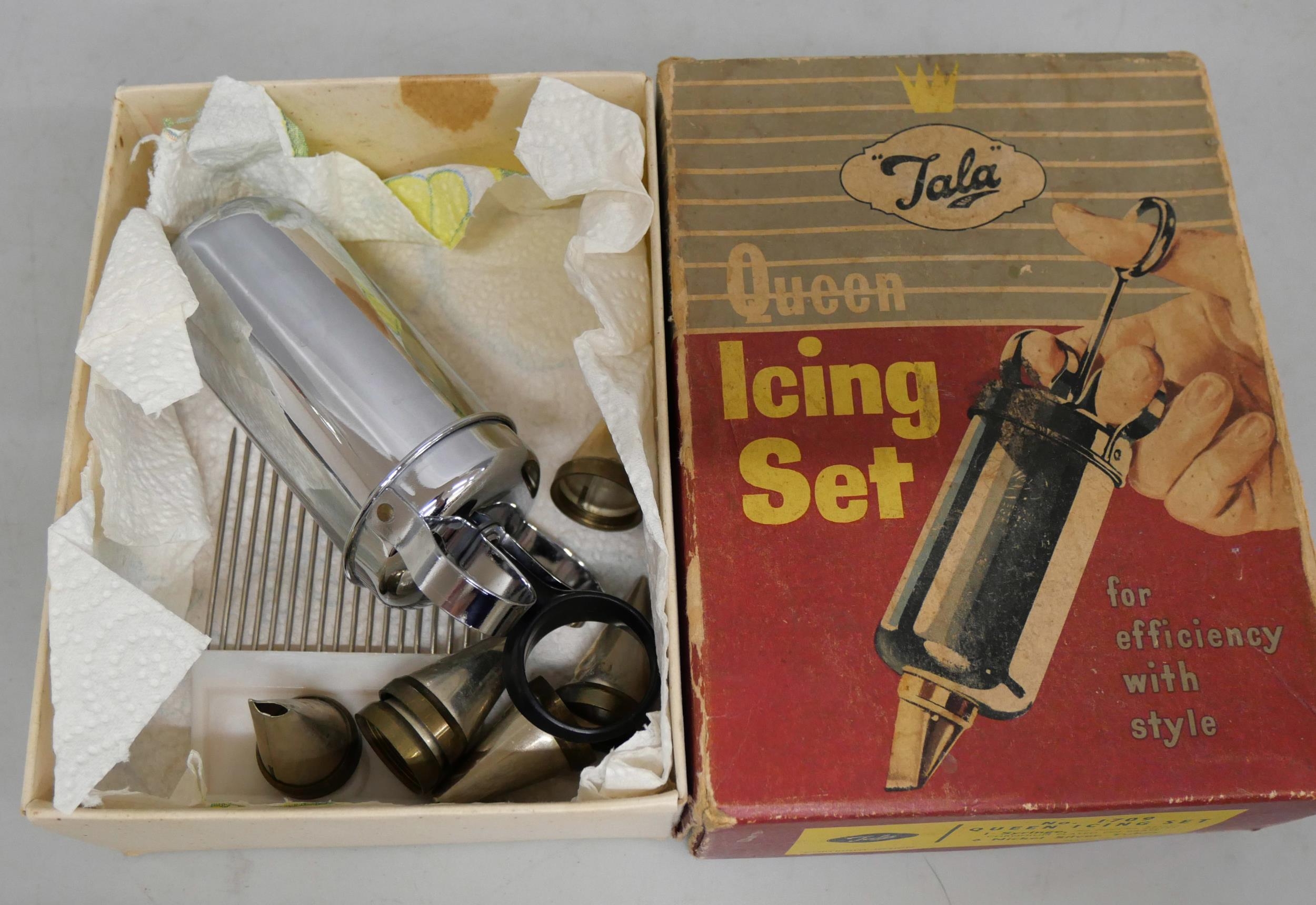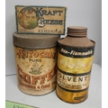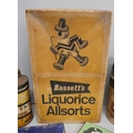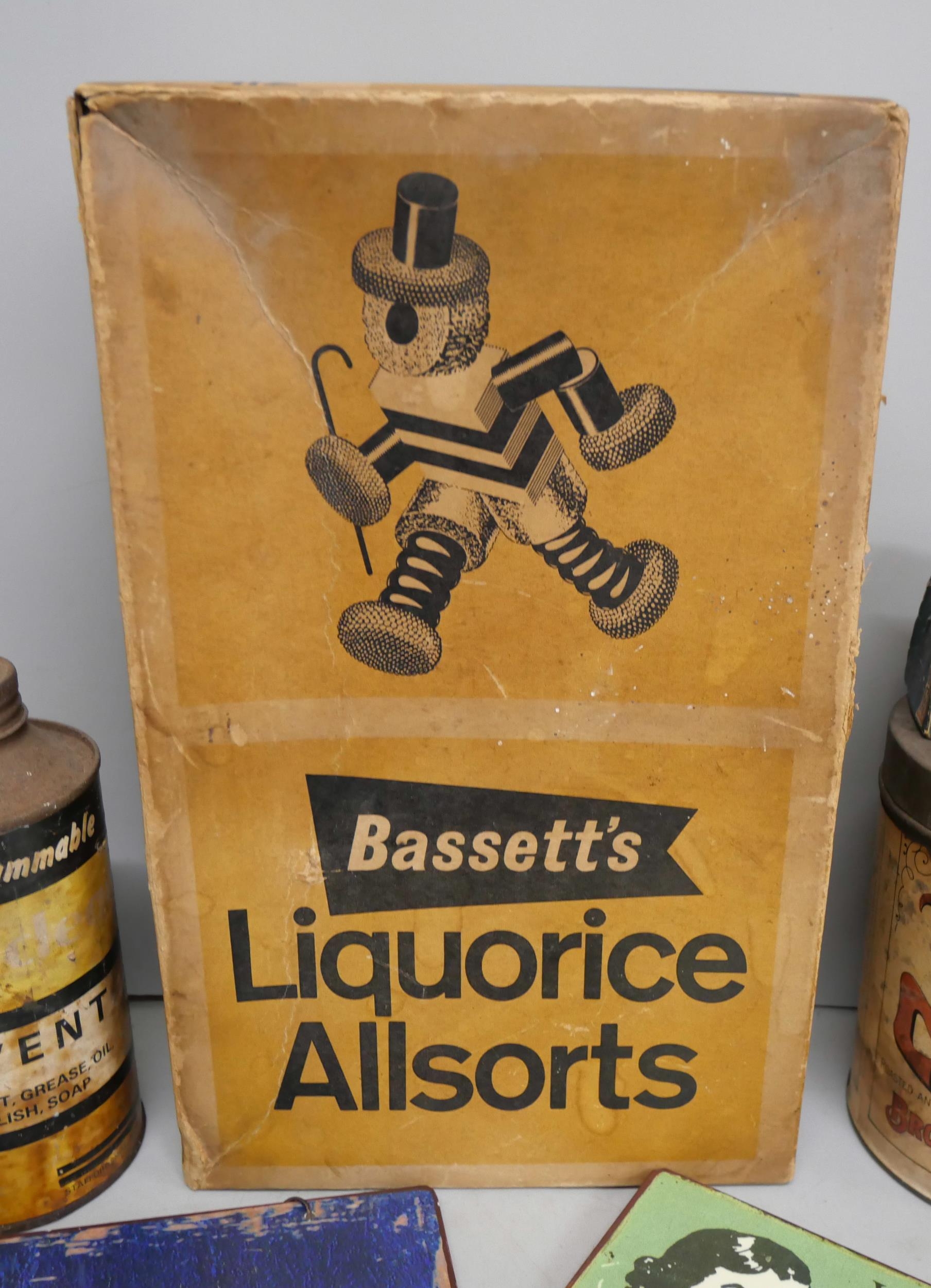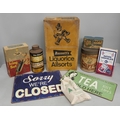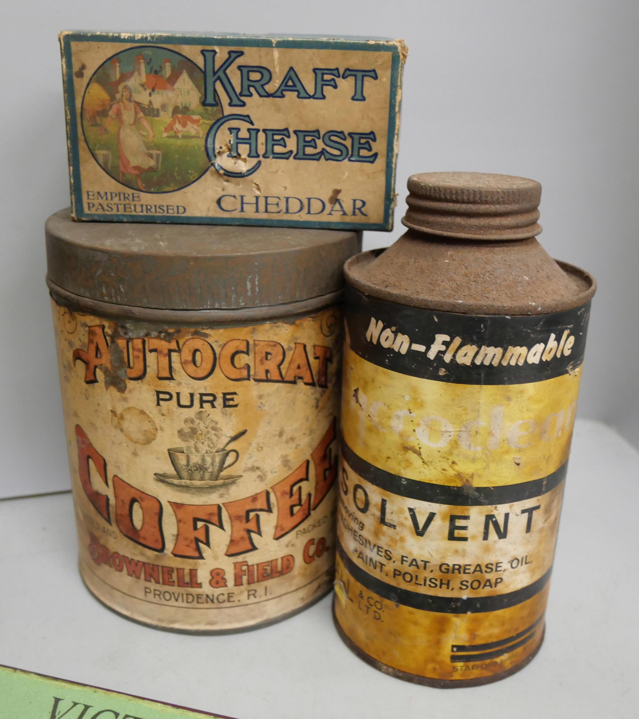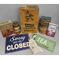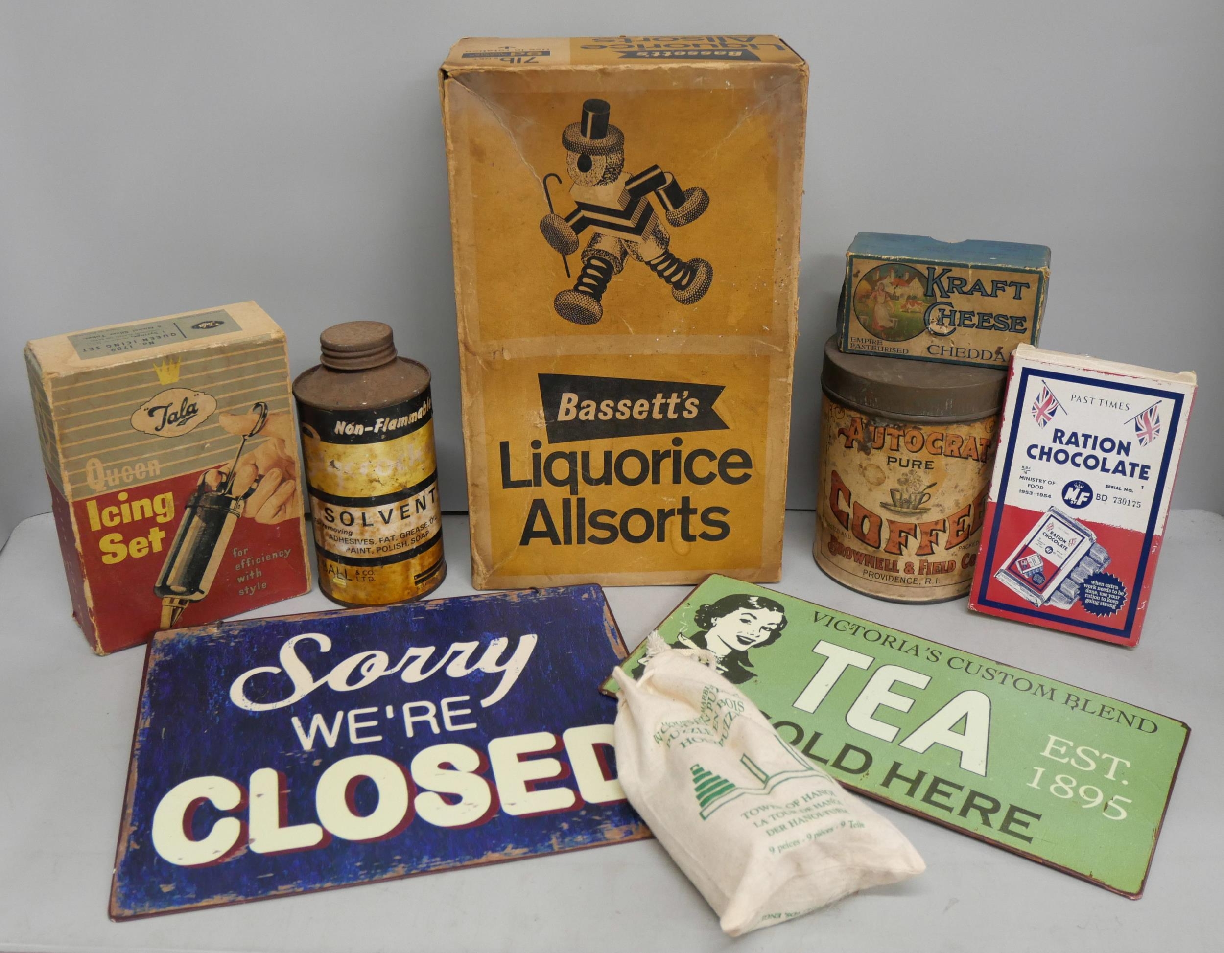 A collection of vintage boxes, Liquorice Allsorts, Kraft Cheese, an Autocrat Coffee tin, F. Ball tin, two modern tin signs and a Tower of Hanoi wooden game