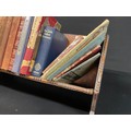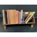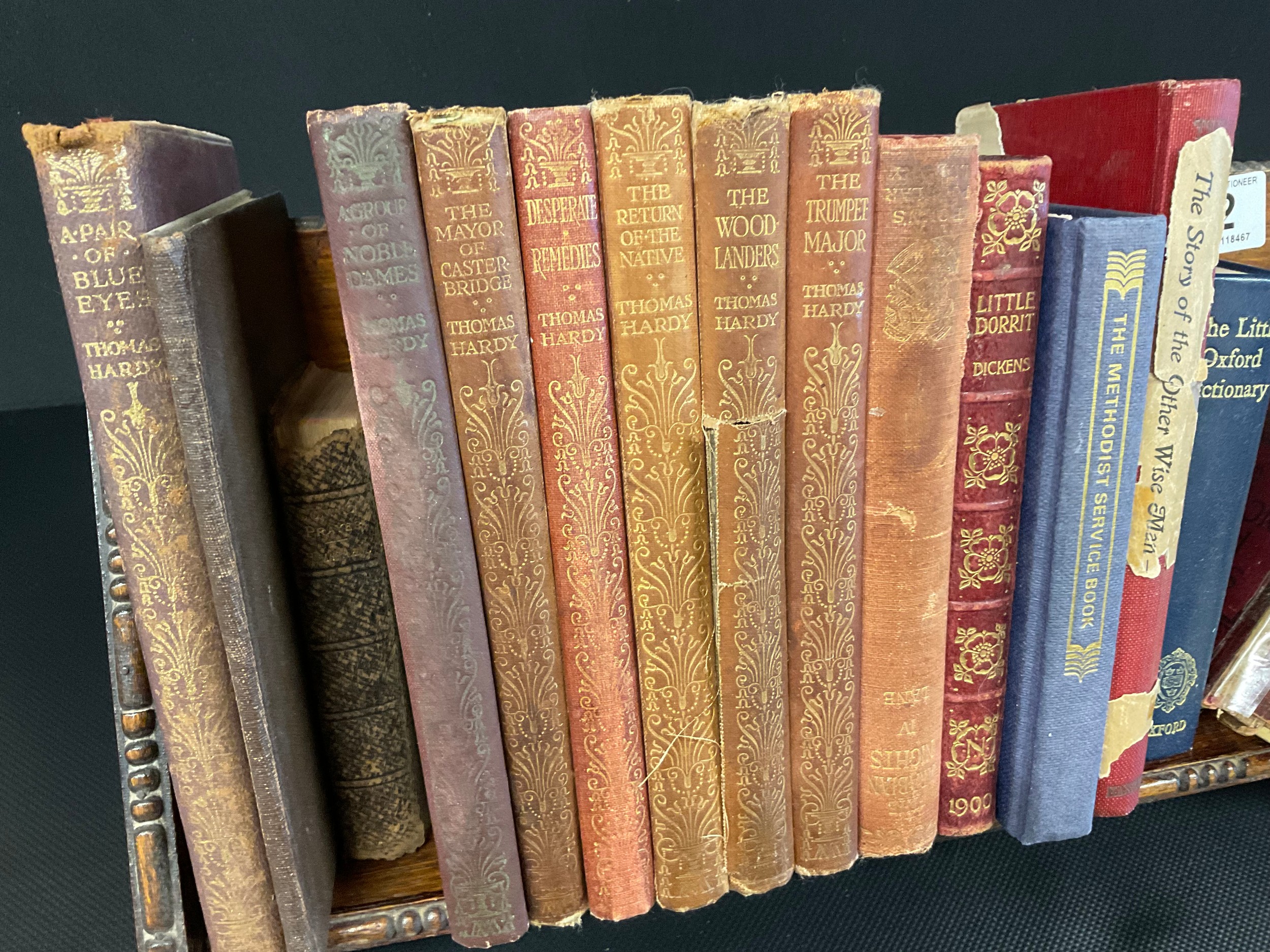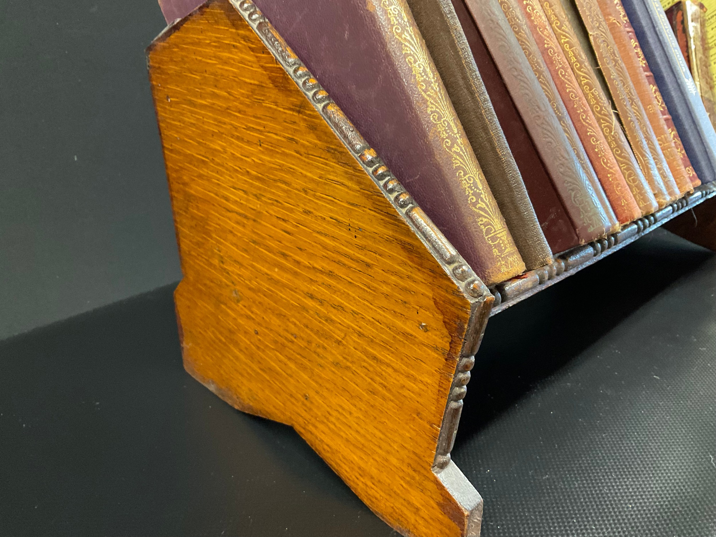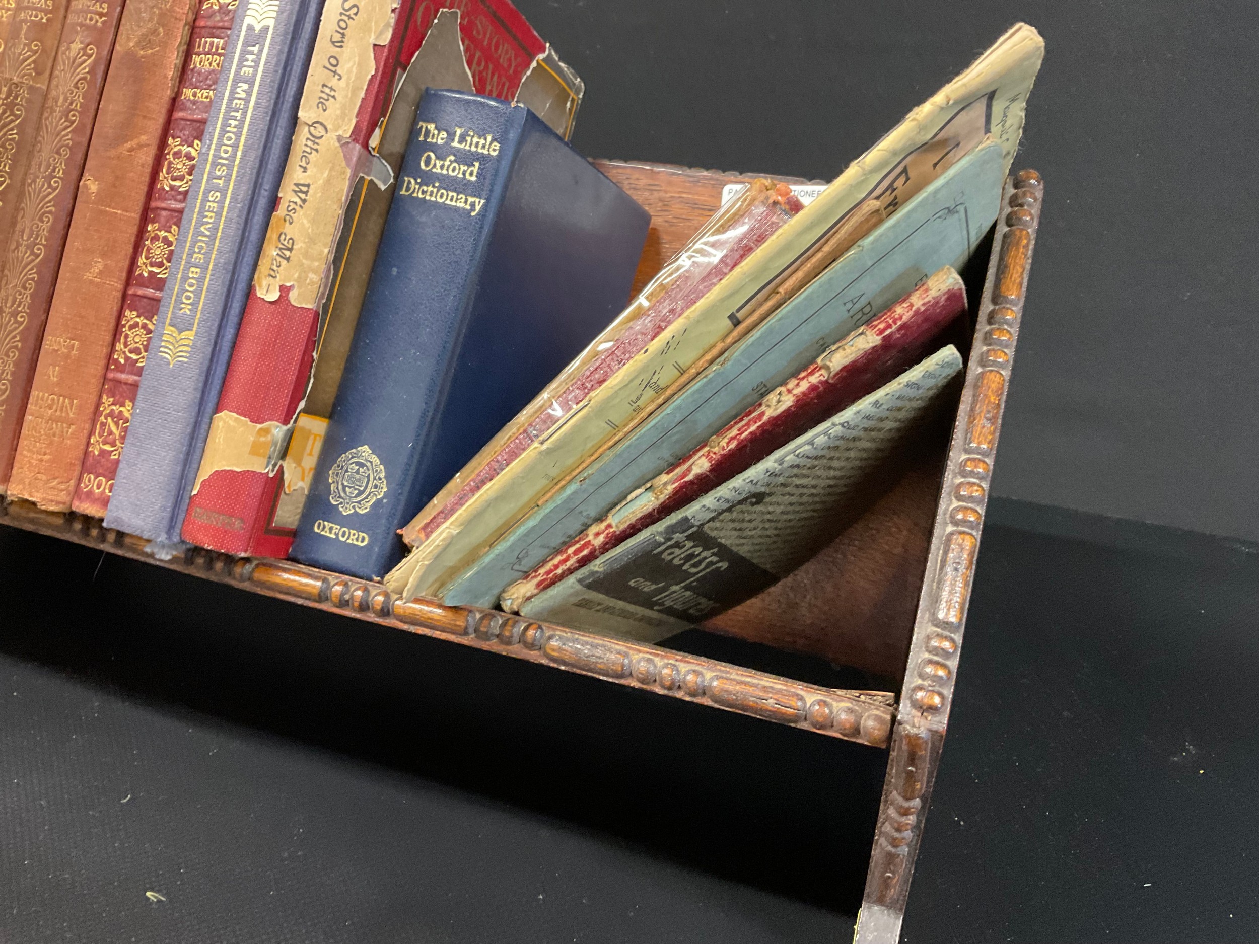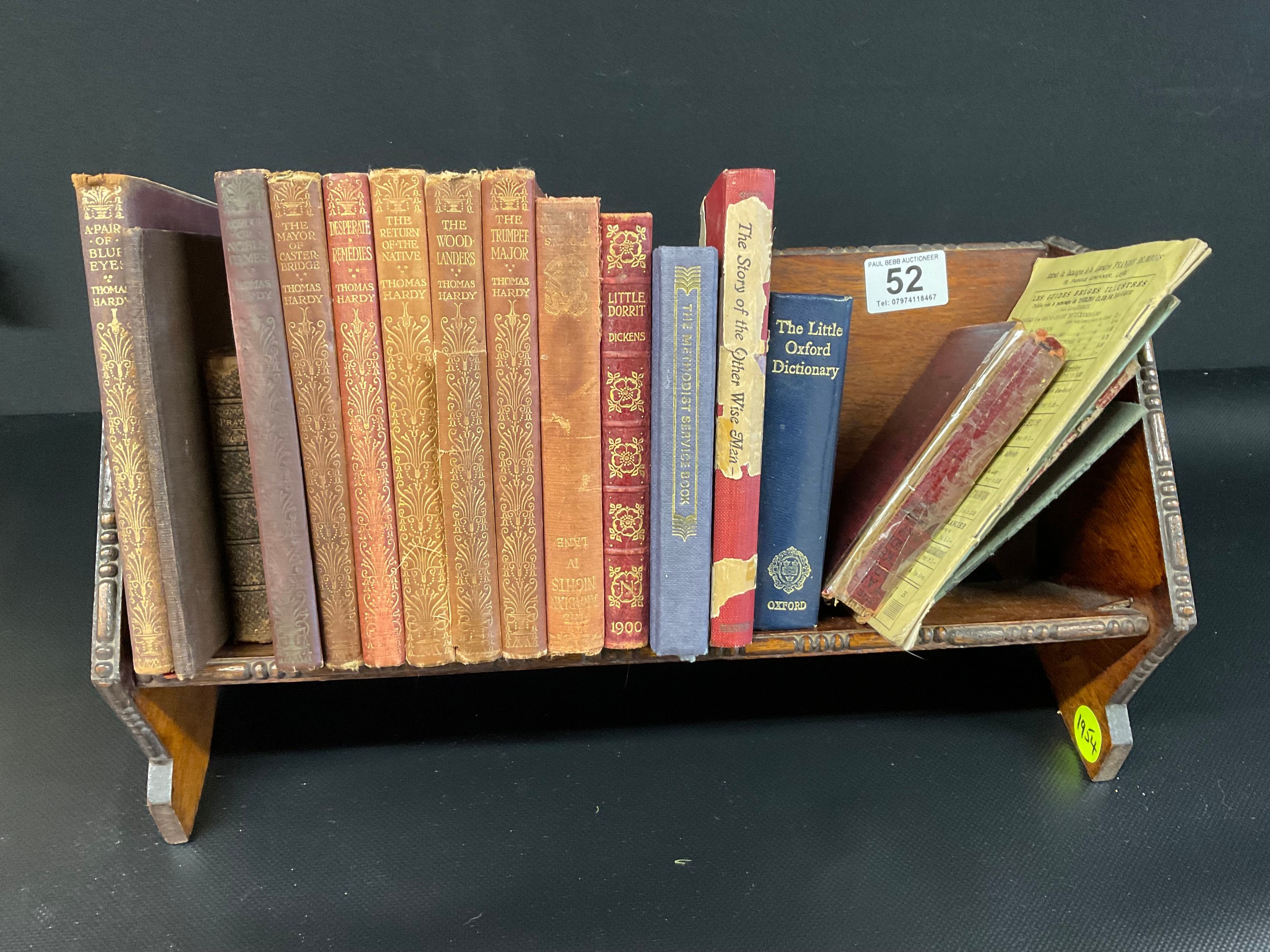 VINTAGE OAK BOOK RACK AND BOOKS - THOMAS HARDY ,DICKENS ETC