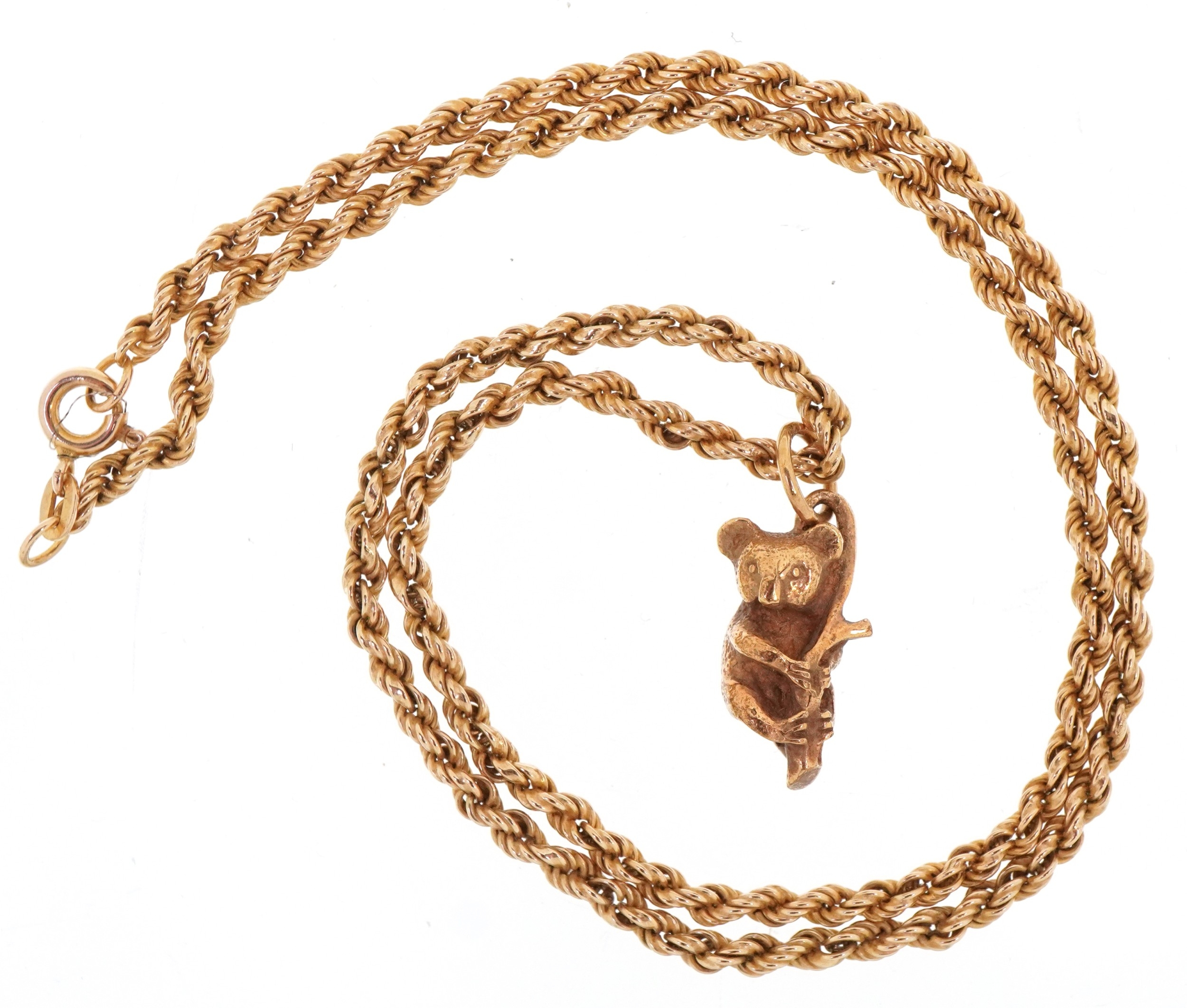A 9ct gold koala pendant on a 9ct gold rope twist necklace, 1.9cm high and 44cm in length, total 16.9g.